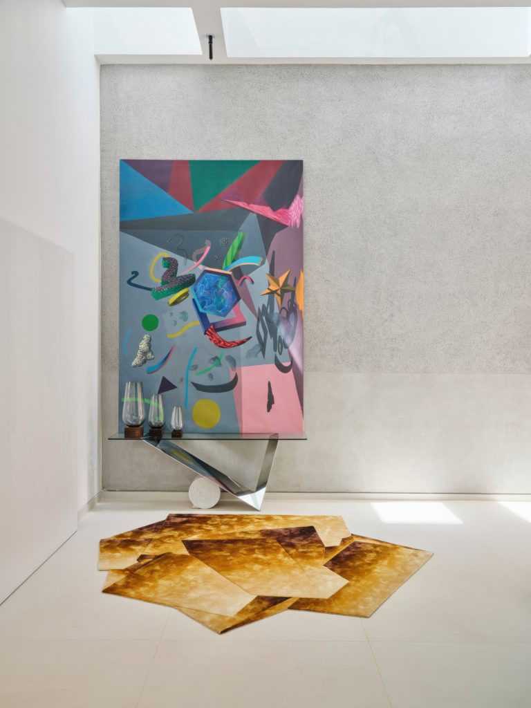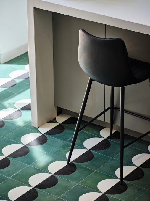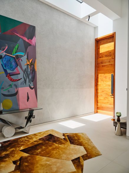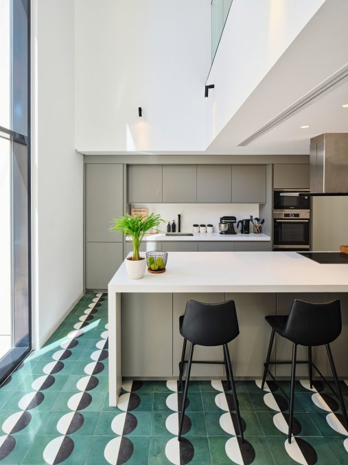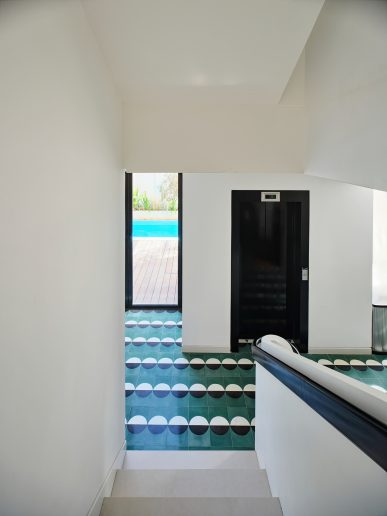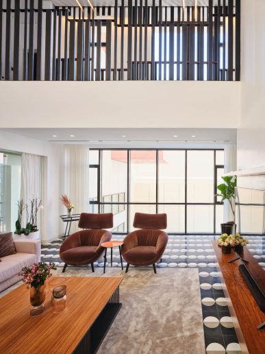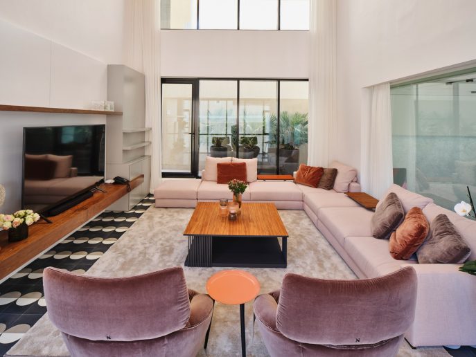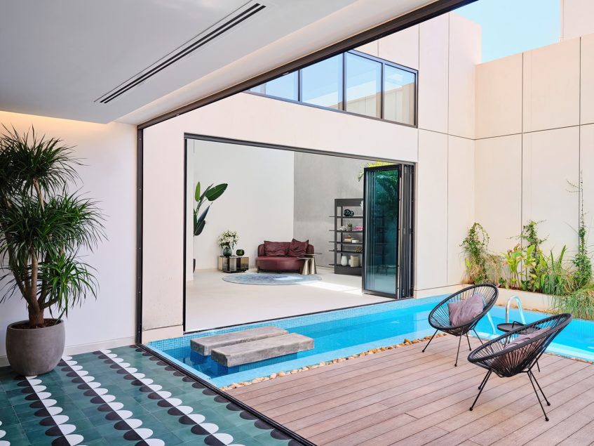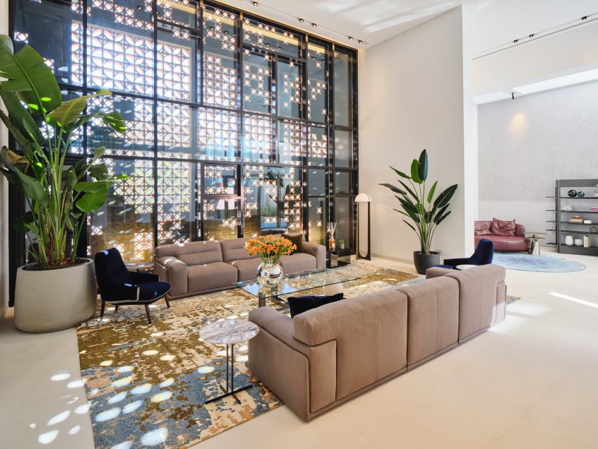 The residence, spanning three floors, showcases a split-level design that intertwines the different spaces within. The facade, standing 7 meters tall, boldly challenges the typical Kuwaiti residential architecture norms. Instead of a traditional fence, the facade itself serves as a barrier, blending solidity and porosity to ensure privacy while allowing natural light to flood the interior. The cobogó tiles, forming a patterned element wall, act as a dynamic transition between exterior and interior spaces, enhancing the visual appeal and depth of the villa’s structure. The earthy tones of the exterior draw from the desert landscape, with the design further enriched by a playful mix of Arabic and Mexican influences.