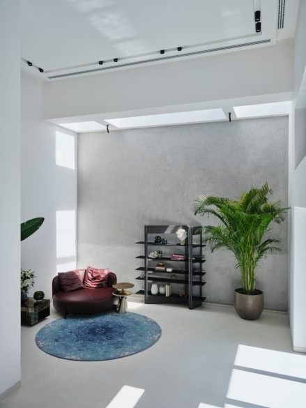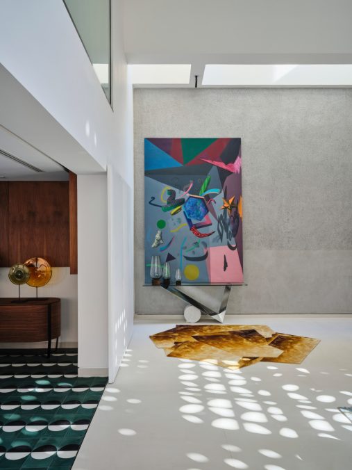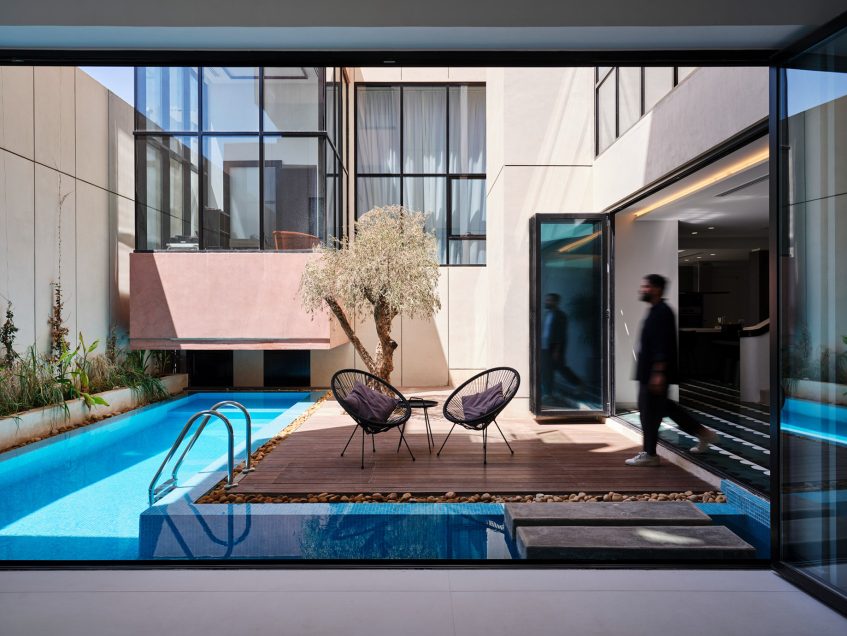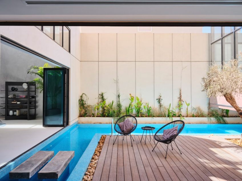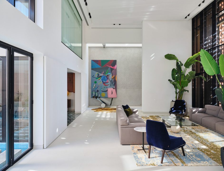 Inside, the home is a masterpiece of light and form. The central courtyard, with its pool area wrapping around two quadrants, connects seamlessly to the reception area. As you enter, a linear skylight floods the space with light, setting the stage for the artful interplay of shadows created by the cobogó tiles. A cantilevered box housing the home office hovers above the courtyard, adding a modern touch to the serene environment. The split-level family living room offers views of the reception and courtyard, with a hanging bridge leading to the master bedroom, enhancing the sense of spatial continuity. The thoughtful design and strategic placement of skylights ensure that every corner of the home is bathed in natural light, creating a harmonious and visually captivating living space.