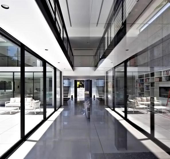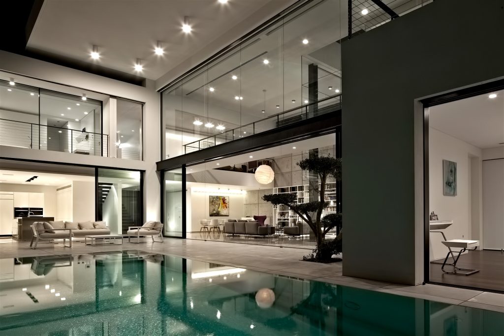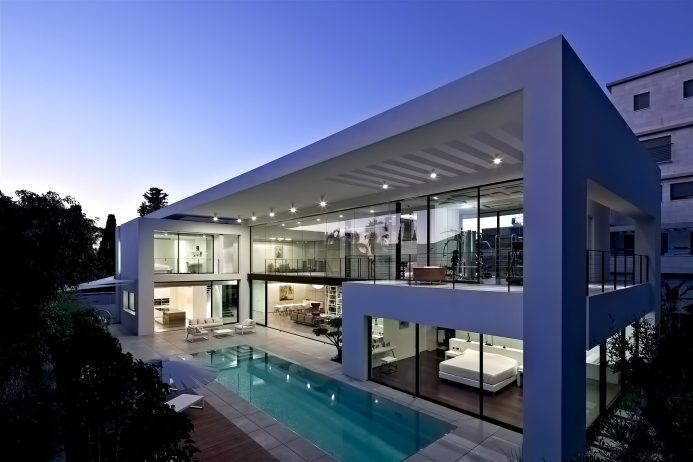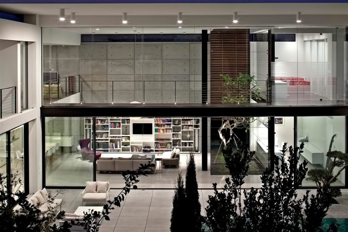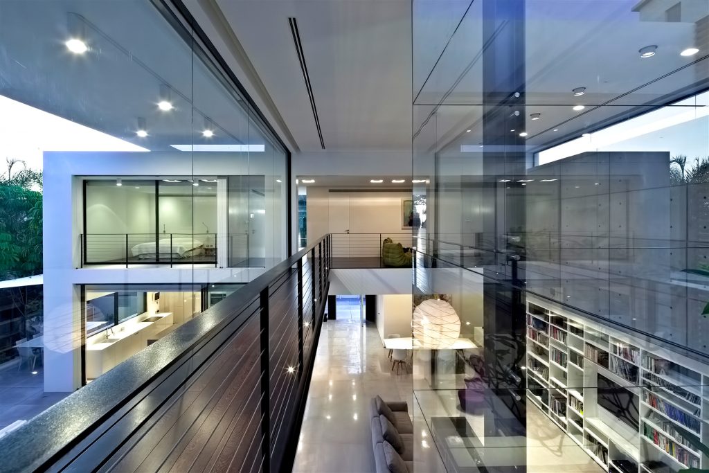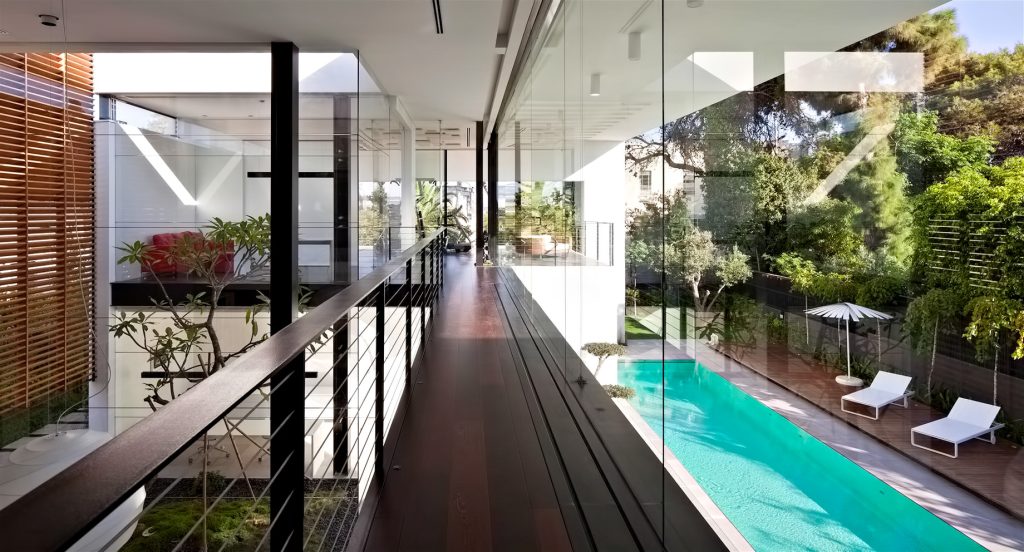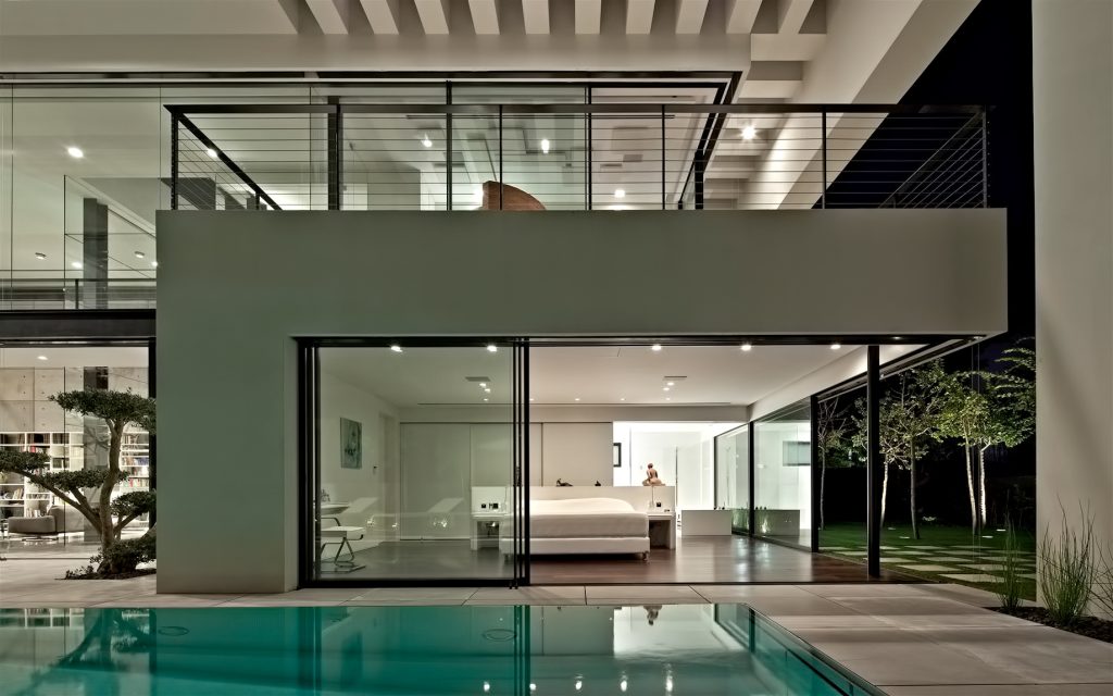 The spatial continuity of the design functions around one large open central space with a parallelogram pool that revels in the existence of abundant natural light. The ambiance created around the central space creates an interactive environment for residents on different levels of living where the user experiences warm and friendly, yet defined spaces in the spatial continuity of the architectural design that is both unassuming and transparently livable. This brilliant luxury residence exemplifies the austere minimalism of Japanese architecture amalgamated with minimalism translating these models into the Israeli environment, climate and way of life.