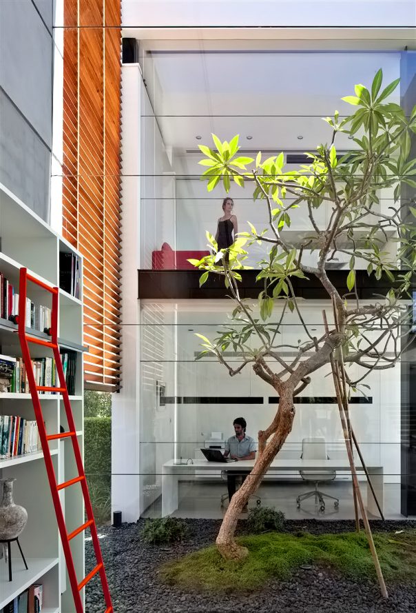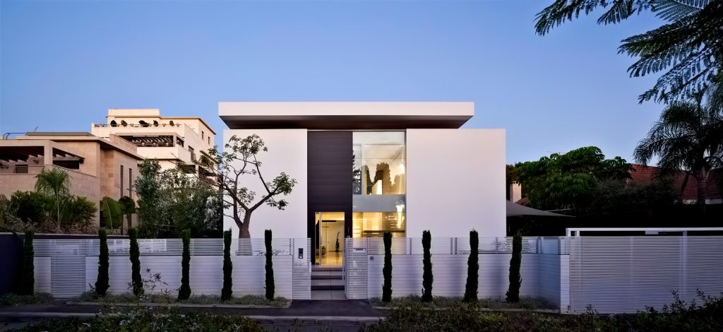 A sophisticated expression of modern luxury, and spatial purity that transcends Bauhaus style, encapsulated the architectural vision of this stunning contemporary private luxury residence built in the center of a historic avenue and at the very heart of Haifaโs French Carmel neighborhood. While the front of the home is intentionally anonymous with closed elements that combine a monochromatic faรงade and minimalistic elements, this only hints at the spectacular contemporary architecture within the public inner courtyard of the residence that opens to a floating upper roof forming a climatic relationship between formality and modernism.