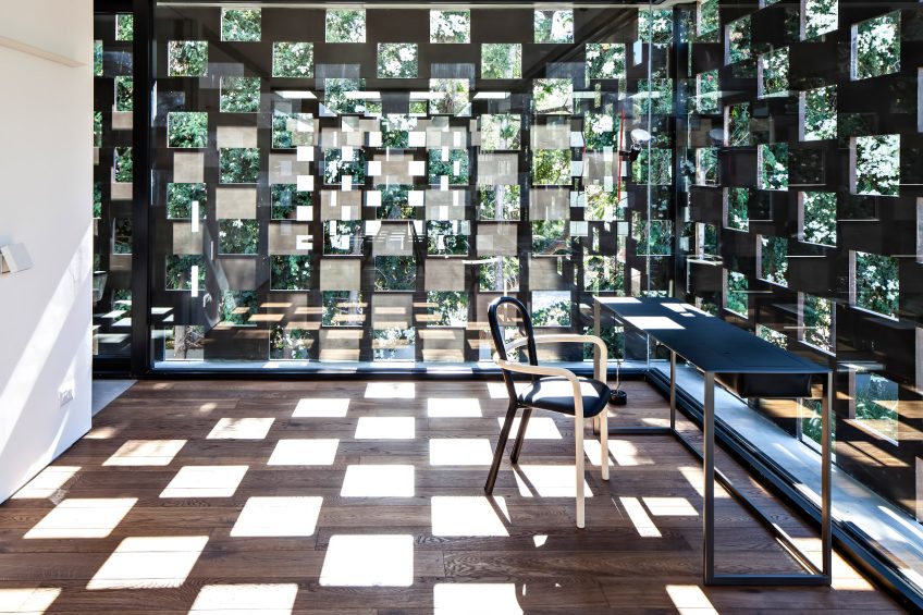 Mass and space were combined together in a perforated, weathered steel Cor-Tenโข structure that creates and sets clear boundaries for the home. The structure regulates the amount of sunlight penetrating the buildingโs spaces and controls the angle of sight both into and from the building whist creating a controlled, visual dialogue between the inside and the outside. The structure is constructed from layers and areas. The central area, which is the central space, the residential area which centers around a double, communal living space and the external area, the weathered steel structure which defines a border and area for the building whilst creating new, intermediary areas that combine the inside and the outside.