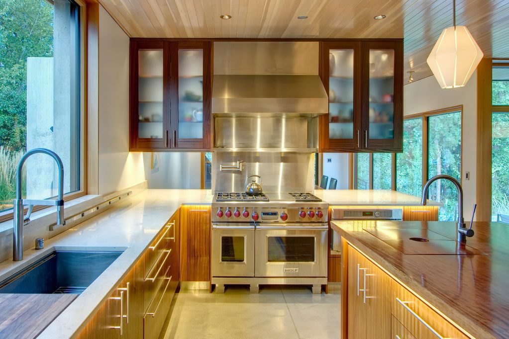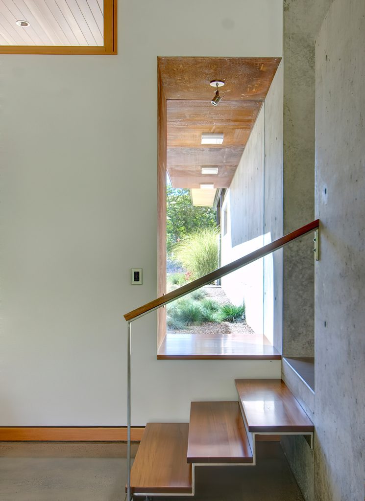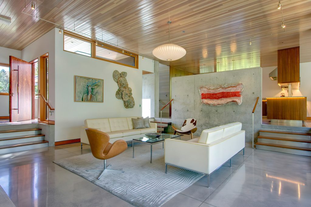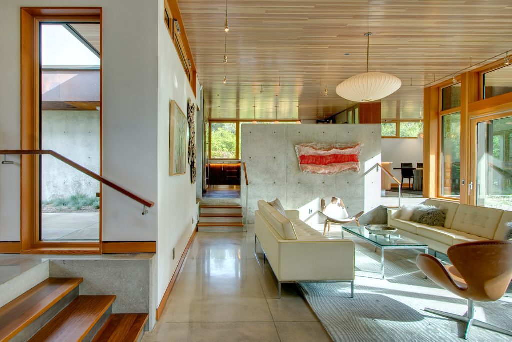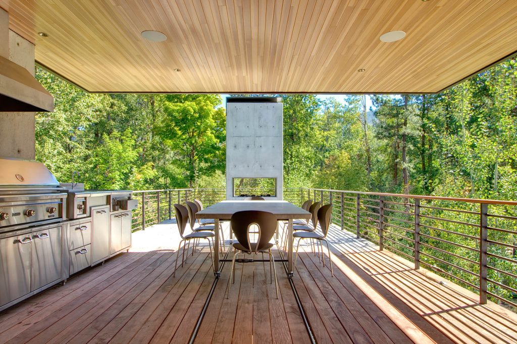 The architectural prowess of Creekside House unfolds through a strategic layout where most of the interior spaces gracefully occupy the main floor, reserving the second level exclusively for the master suite. A defining characteristic lies in the home’s strong connection between indoor and outdoor realms. While the street-facing facade maintains an unassuming presence, the creek-side elevation unveils a dynamic interplay of spaces that seamlessly merge the boundaries between inside and out. Notable features include a protected backyard oasis and an enchanting, cantilevered dining deck, adorned with its own fireplace, creating inviting spaces for both contemplation and social gatherings.