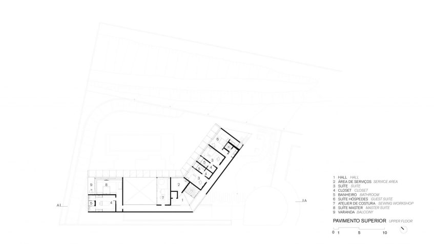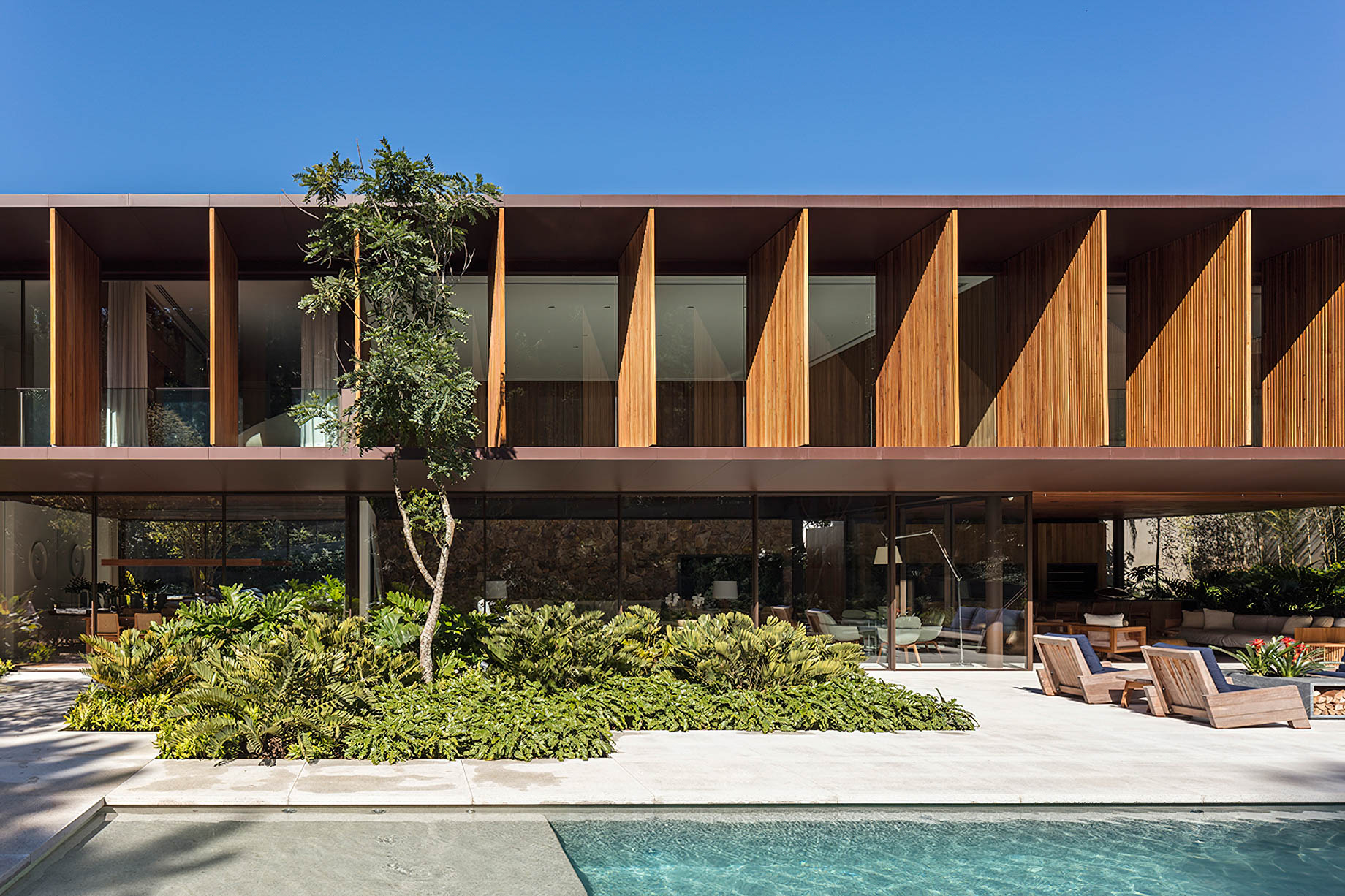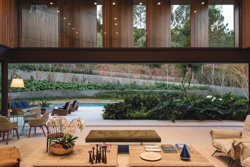 Two axes ingeniously delineate the home’s spatial organization, emanating from its boomerang-like form. Along the wing parallel to the street, discover the social expanse and master suite, seamlessly integrated with the lush tropical garden meticulously crafted by Isabel Duprat. At the heart lies the double-height living area, a testament to modernist finesse, ensconced within the steel framework. From this vantage, glass and slatted wood panels create an open dialogue with the surroundings, while purposeful brise-soleil shields against the sun’s direct embrace. Upstairs, strategically framed vistas unveil themselves, offering panoramic views of the verdant landscape.