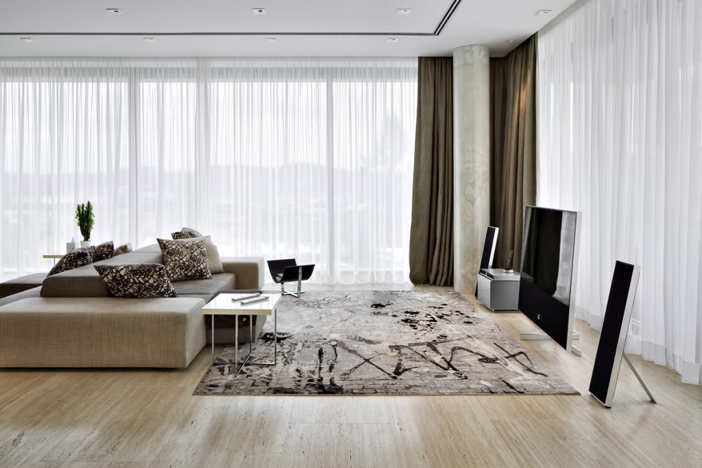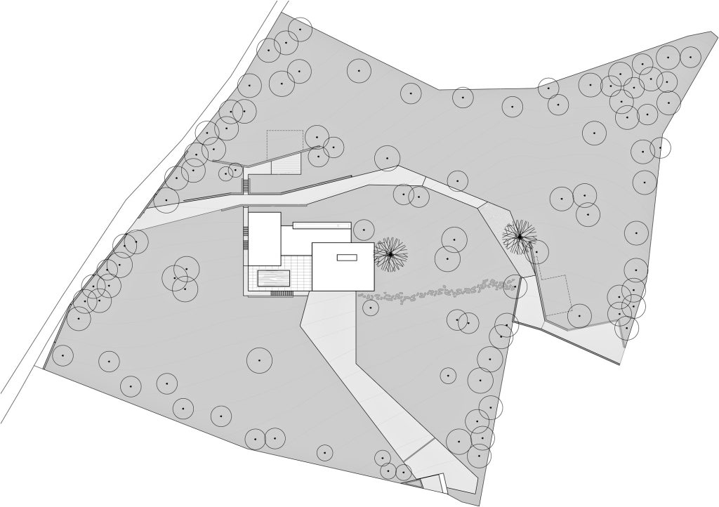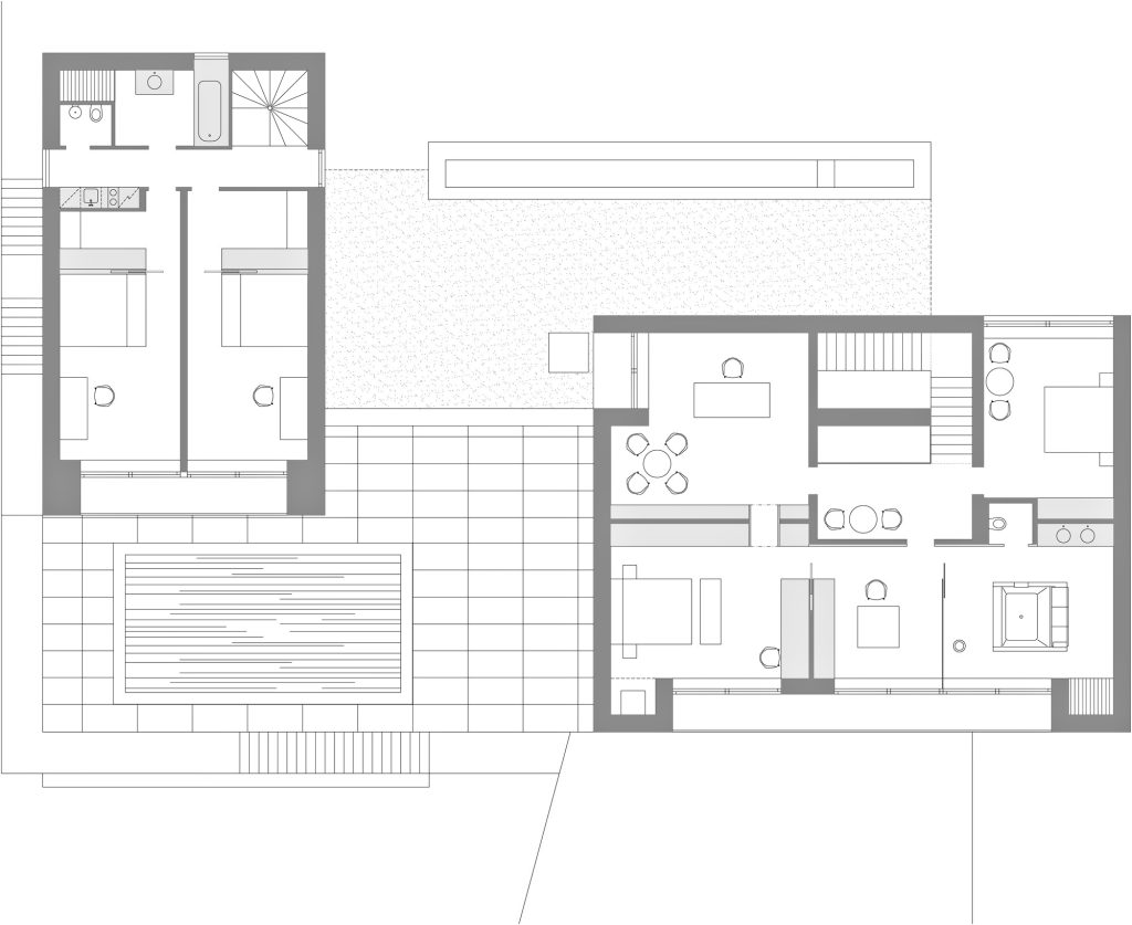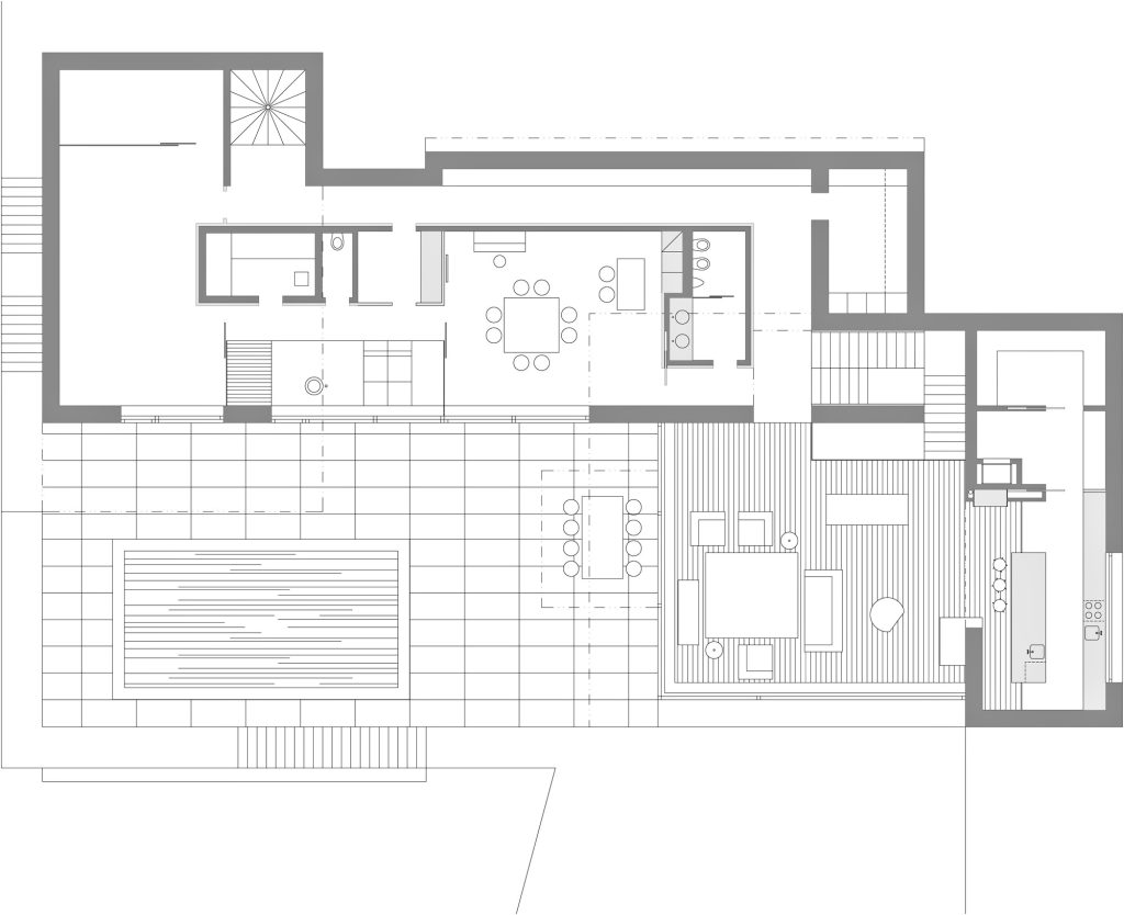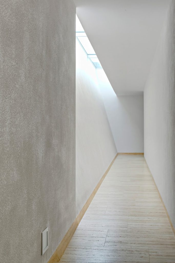 Built with a structure composed of a demarcated relaxation wing and living space; both parts are notably glassed in, allowing them to be opened up during summer and enabling smooth passage from outside which can be freely accessed from the terrace. The home has a stone base that supports an exaggerated conglomeration of rooms that are partly cantilevered over the terrace and divided into separate spaces for children and parents.