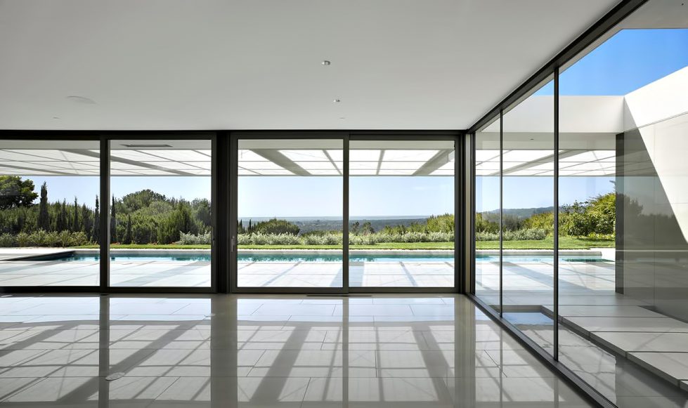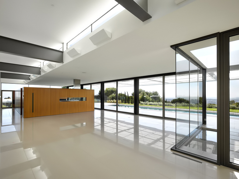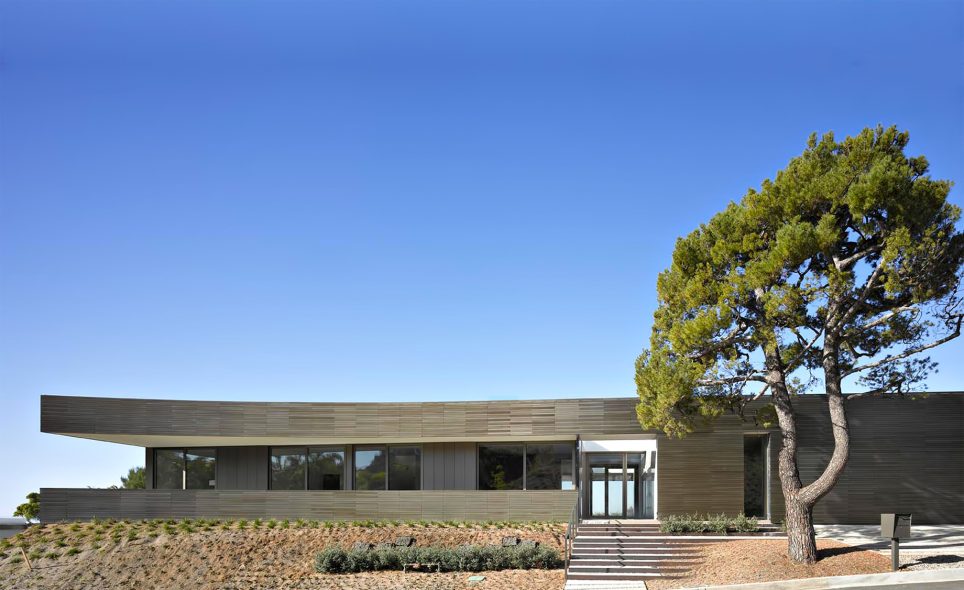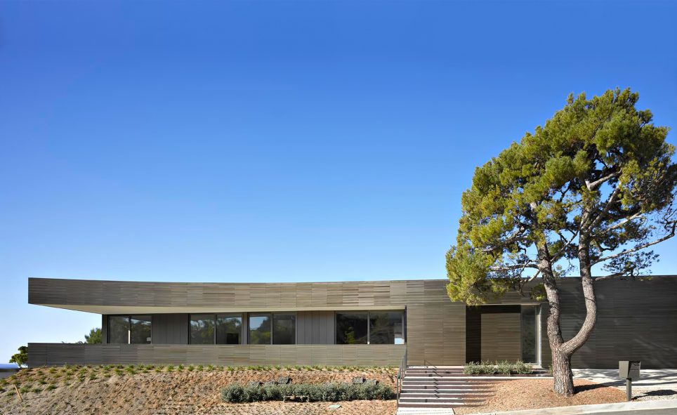 Located in a private residential area of Beverly Hills and sited atop an elevated corner lot in the foothills of the Santa Monica Mountains, the Double Stick house is a spectacularly minimalist single-story modern contemporary residence named for the two-sided panel tape that holds up the entirety of the home’s façade.