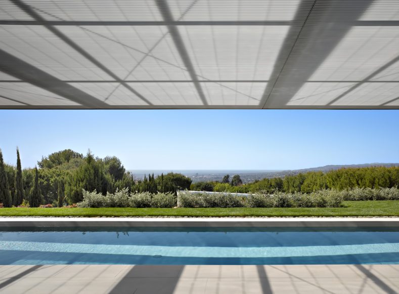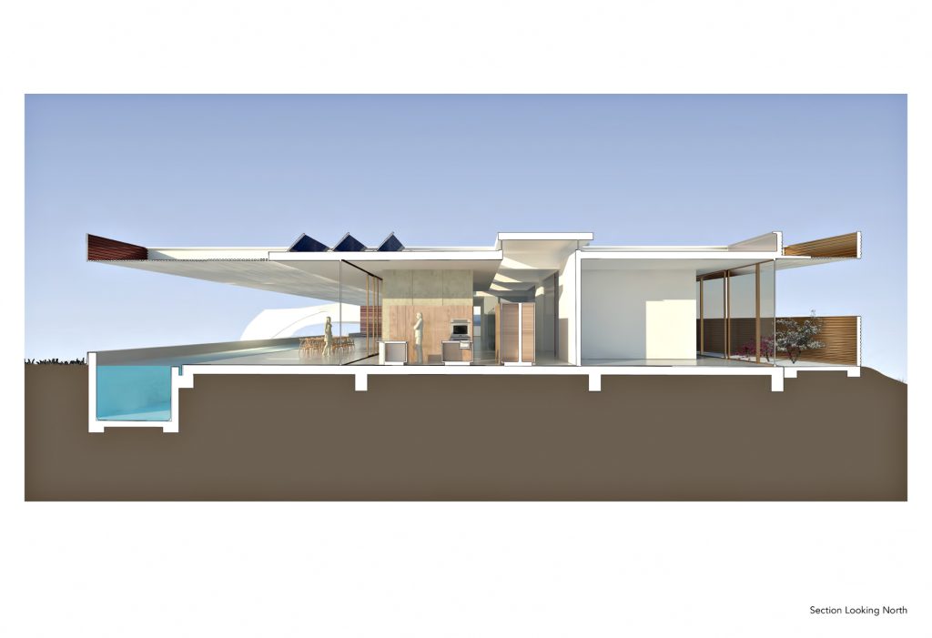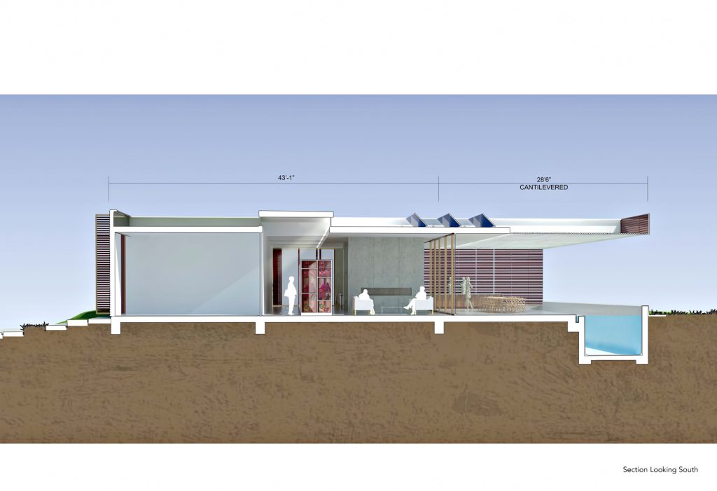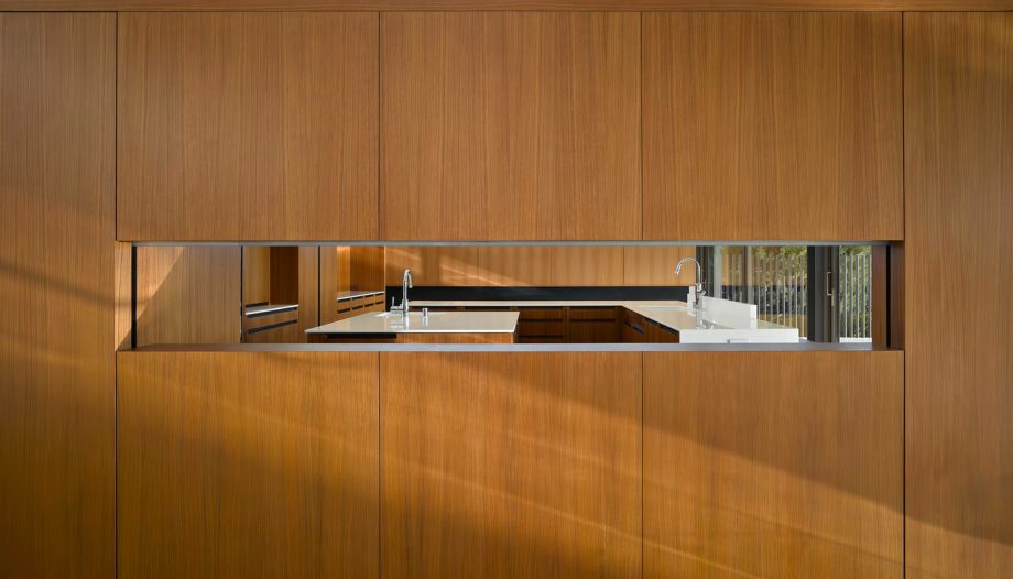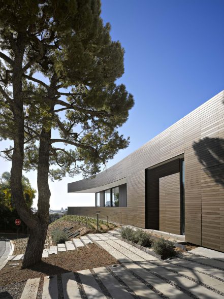 The project is really about light and space with the only necessary structural flourish being a 25-foot cantilevered trellis that extends out over the rear of the house and provides shade to a previously unshielded backyard area. The façade has two extremes: a completely open window-paneled rear, inviting in natural light and maximizing access to the expansive southern view, and a heavily clad street-facing exterior, providing the desired privacy and protection with the introduction of a slight curve of the home’s front façade which does similarly trace the subtle arc of the street. But it is the texture, tone, and iconic material innovation that came to define this project which features a façade held in place by a high-performance two-sided architectural panel tape.