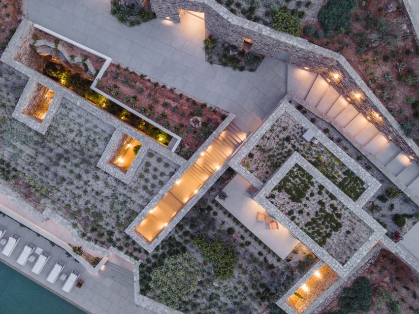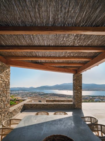 In addition to the thoughtful spatial organization, the villa incorporates unique design features that heighten the sensory experience of the space. Subterranean interiors are illuminated by elongated slits in the ground, creating dramatic lighting effects that contrast with the robust exterior. Pathways and engravings throughout the property lead residents and guests toward the swimming areas, emphasizing continuity and flow within the design. The integration of natural elements, like pergolas crafted from chestnut and wicker, not only provides shade and protection but also roots the structure deeply within its Cycladic context. This Antiparos villa offers a luxurious, serene retreat that fully embraces and enhances the beauty of its natural surroundings.