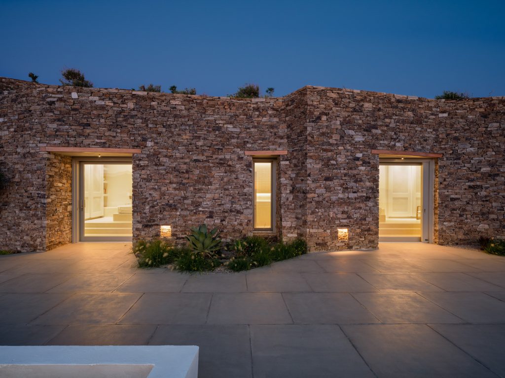 This Encaved Stone Villa on the island of Antiparos is a striking example of modern architecture seamlessly integrating with the rugged Cycladic landscape. Positioned on a steep slope and oriented to the East, the property offers panoramic views of Paros and surrounding islands. The design strategy emphasizes harmony with the natural topography, blending varied volumes with subterranean elements that mirror the rocky terrain. The careful architectural intervention not only respects but also enhances the existing landscape, creating a sophisticated retreat that harmonizes with its environment.