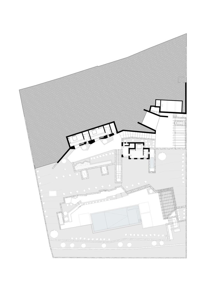 Functionality and aesthetics merge seamlessly in this complex, where an open-air corridor distinctly separates public areas like the living and dining spaces from the private quarters. The lower level, designed for tranquility, houses private rooms and a pool area that offer both seclusion and comfort. Auxiliary facilities are efficiently connected through a dedicated elevator, ensuring ease of access. Large open-air spaces surrounding the villa encourage outdoor living, reminiscent of traditional Cycladic life, yet with a contemporary twist. The use of indigenous materials, such as local stone and timber, enhances the building’s connection to its surroundings while adhering to sustainable construction practices.