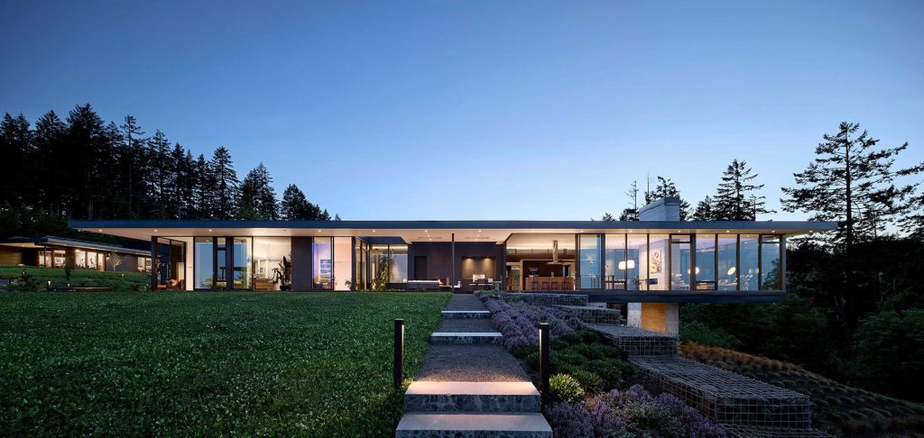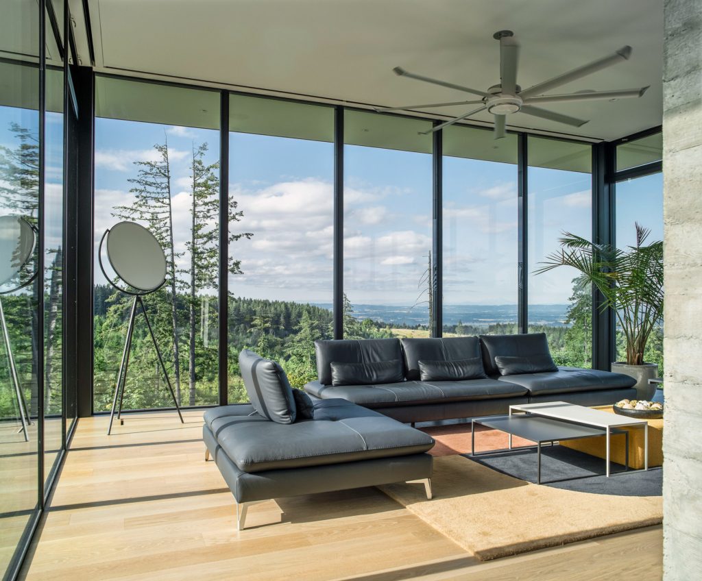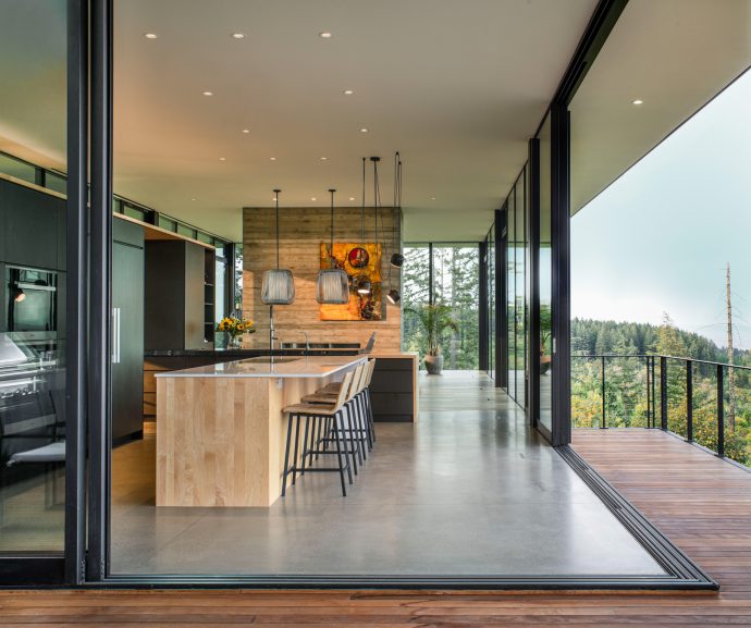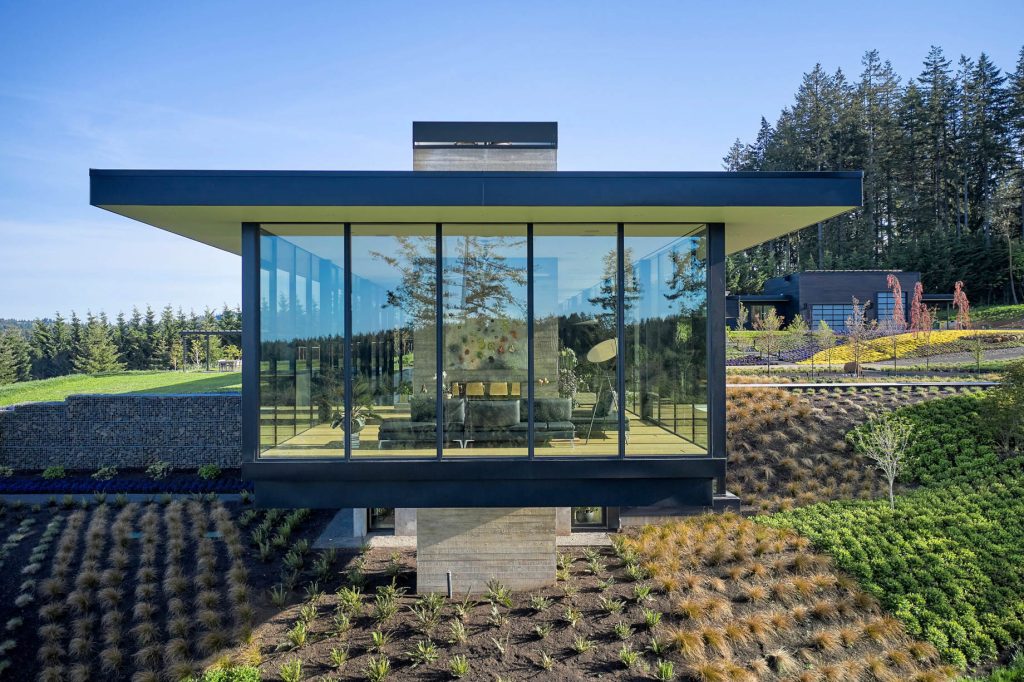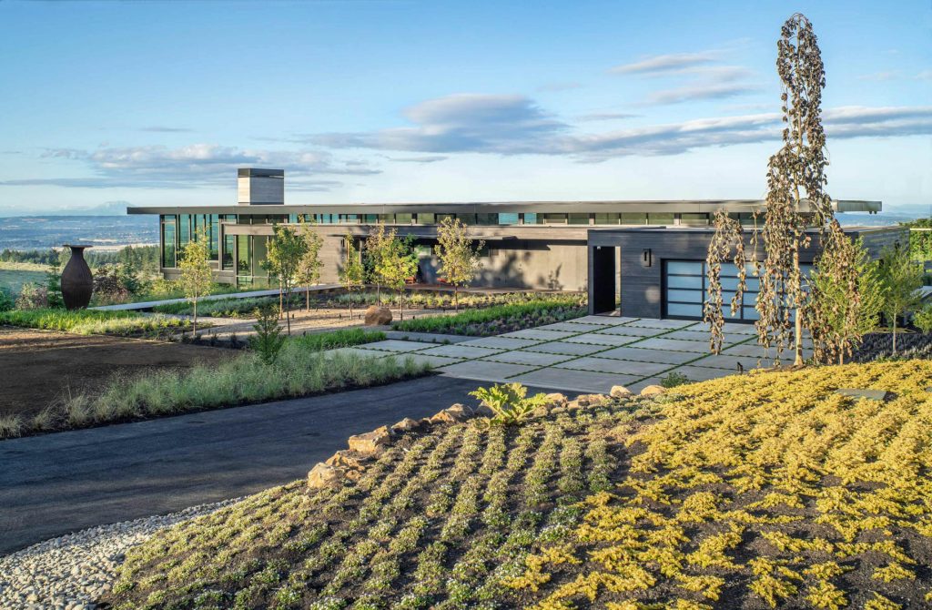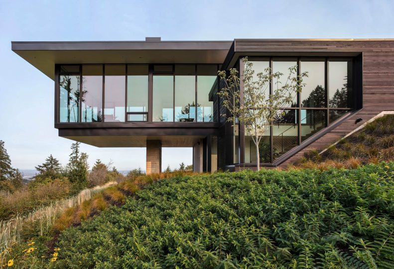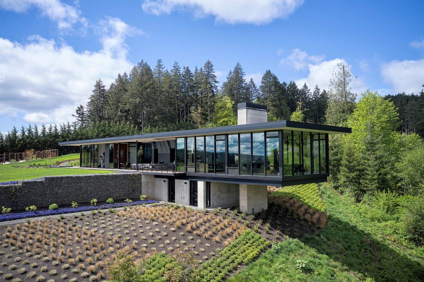 Located in the heart of Oregon’s wine country, the Five Peaks Lookout residence boasts a breathtaking position within the Chehalem Mountains. The challenge of designing a home that maximizes the expansive views of five different mountains (Jefferson, Hood, Adams, St. Helens, and Rainier) while maintaining a seamless connection to the sloped landscape led to a unique solution that reflects the essence of the Pacific Northwest. This warm and modern residence immerses its occupants in the beauty of the surrounding environment.