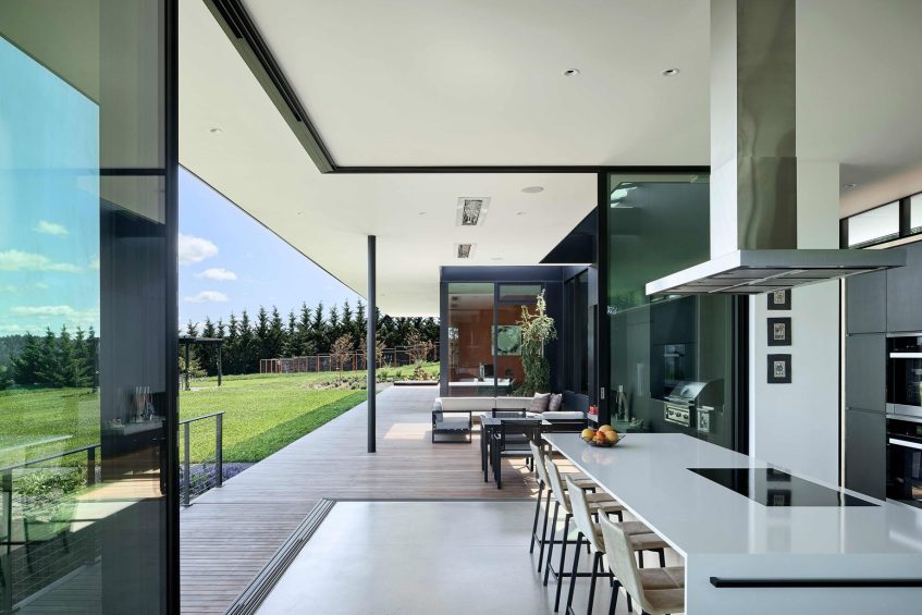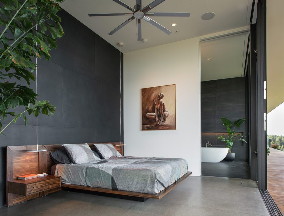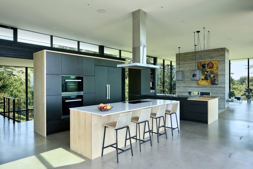 Inside, the interior design embraces a modern and minimalist aesthetic, characterized by a clean palette of contrasting blacks and whites. Polished concrete floors add a touch of sophistication to the overall ambiance. Throughout the home, various wood accents, such as feature stair treads and the kitchen island, are carefully incorporated, serving to both warm the space and reflect the natural beauty of the surrounding forest.