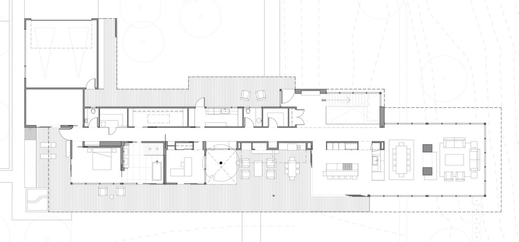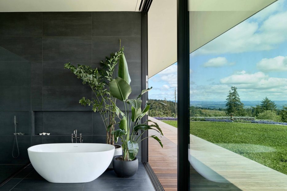 The integration of the indoors and outdoors is a central theme in the design of this residence. An example of this seamless connection is seen in the main bathroom, where a dark wall extends to the exterior volume on that side of the house. Additionally, the home caters to the needs of one of its owners, an artist, by providing a light-filled art studio carefully positioned to make the most of natural illumination.