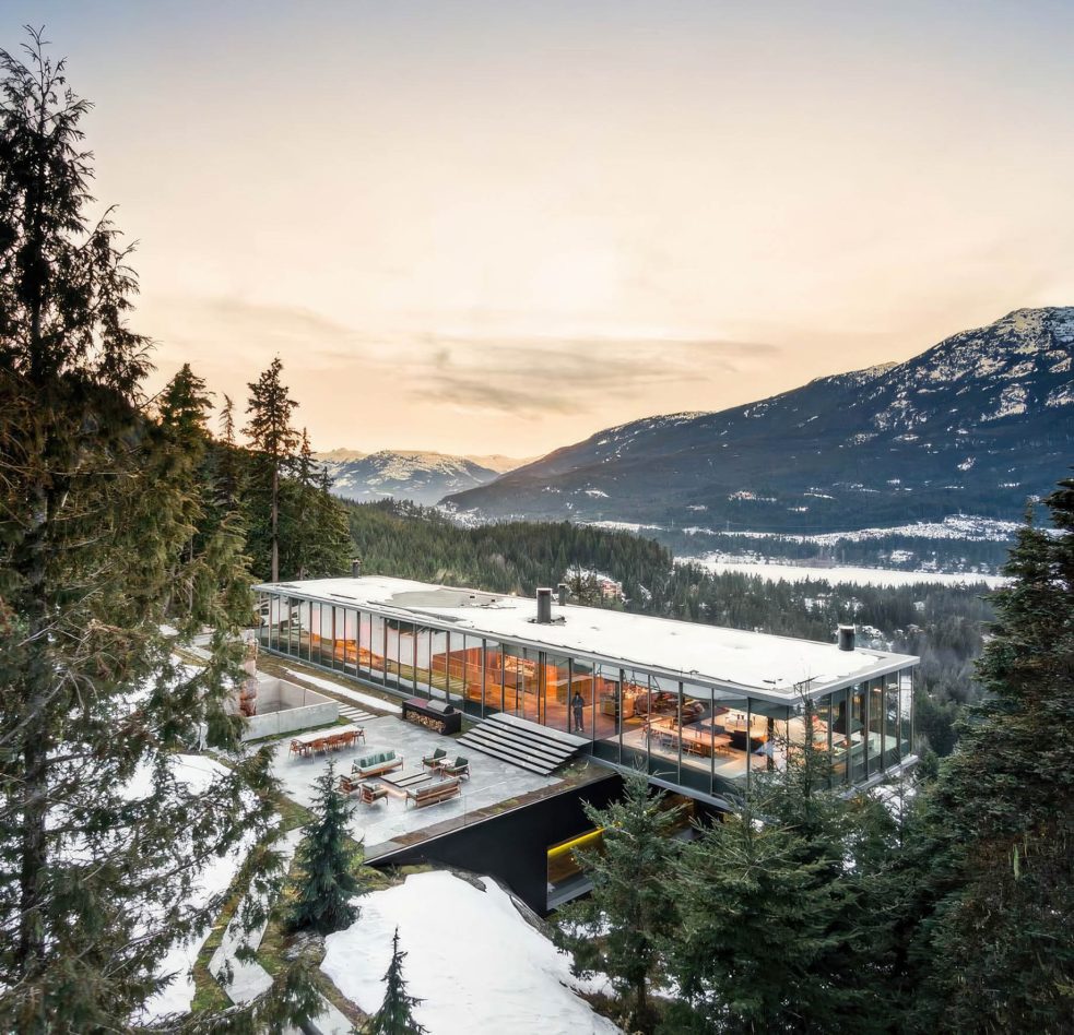 Flag House in Whistler, BC, is an architectural marvel that harmonizes modernist design with the rugged beauty of its mountainous surroundings. Conceived by Marcio Kogan of Studio MK27, this vacation home seamlessly integrates with the landscape while creating a striking visual statement. The house is defined by its bold cantilevered structure, where a glass-encased upper level seems to float above the ground, offering panoramic views of the surrounding nature. This design masterfully merges the indoor and outdoor environments, inviting the surrounding wilderness into the living spaces while maintaining a feeling of warmth and insulation crucial for the harsh Canadian winters.