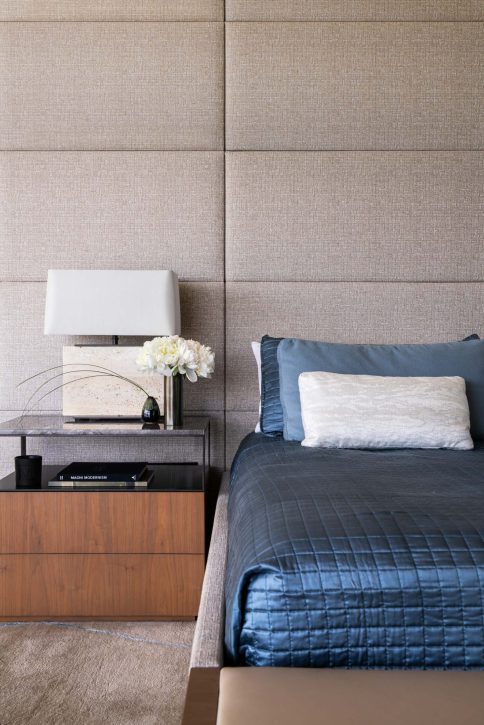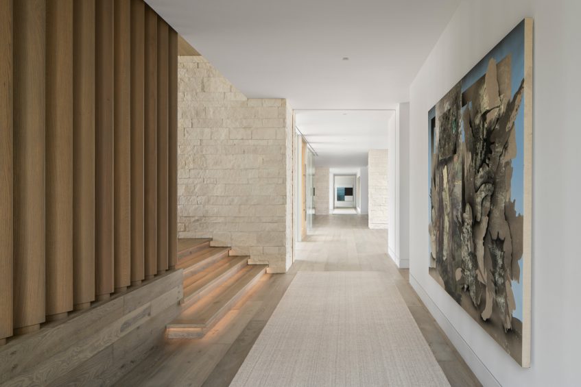 A striking infinity-edge pool extends toward the lake, amplifying the interplay of light and water, one of McClean’s signature design elements. Collaborating with landscape architect Ed Haag, the team incorporated a cascading waterfall, a sculptural garden, and an array of outdoor living areas, including a shaded kitchen with a living green wall that provides relief from the region’s intense summer heat. Inside, Magni infused the interiors with a balance of sophistication and warmth, introducing silver travertine countertops, cedar ceilings, and a curated selection of contemporary art. A cloud-like sculpture by Tomás Saraceno hovers above the great room, casting dynamic reflections throughout the day, while custom furnishings and a patinated-steel fireplace add layers of texture and depth.