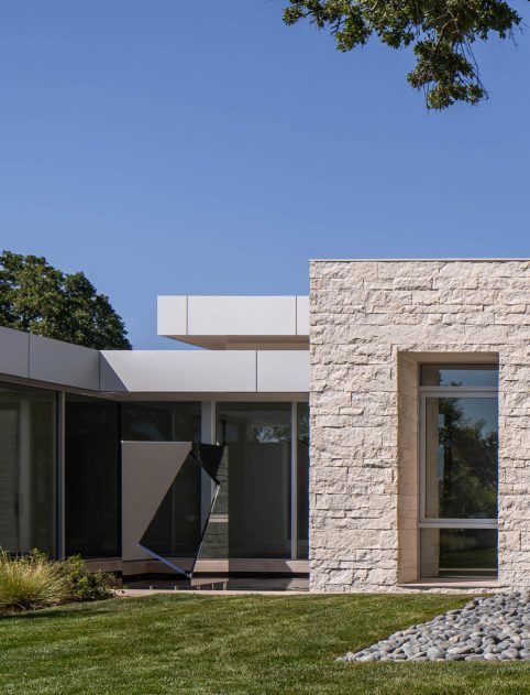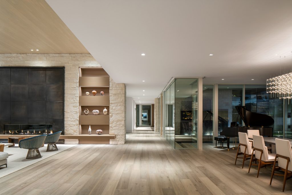 Folsom Lake Residence, by McClean Design, was conceived to harmonize with its natural surroundings while fostering creativity. The homes glass-and-steel aesthetic was softened with warm, tactile materials like cream limestone, bleached oak, and silver travertine, creating a structure that balances modern rigor with organic textures. The tripartite layout, featuring a central great room flanked by private suites and a guest wing, maximizes sightlines to the lake and preserves heritage oak trees, while sliding glass walls dissolve boundaries between interiors and the landscaped grounds. An 80-foot infinity pool, cascading water features, and a secluded sculpture garden enhance the tranquil atmosphere, while a shaded outdoor kitchen and rooftop terrace embrace the surrounding landscape. With its seamless indoor-outdoor flow and thoughtfully layered materials, the residence offers a refined yet inviting sanctuary custom tailored for creativity and relaxation.