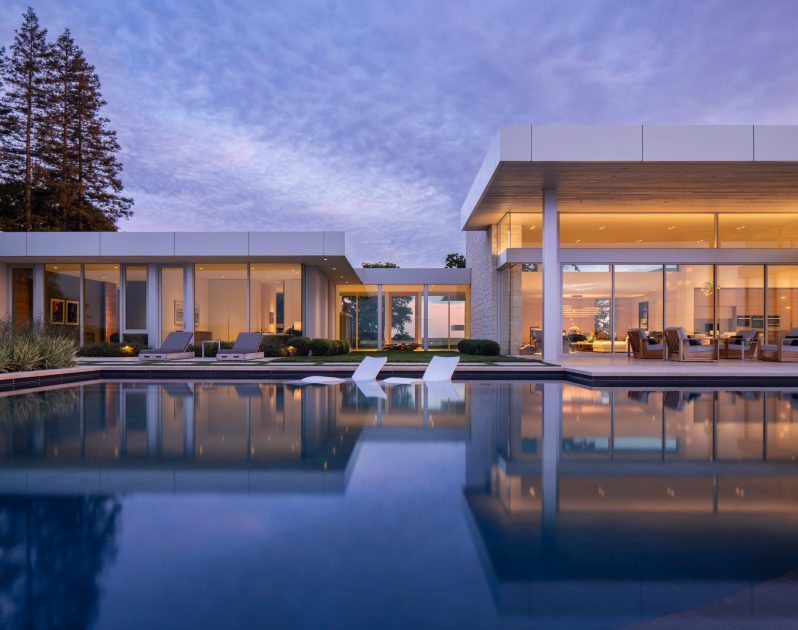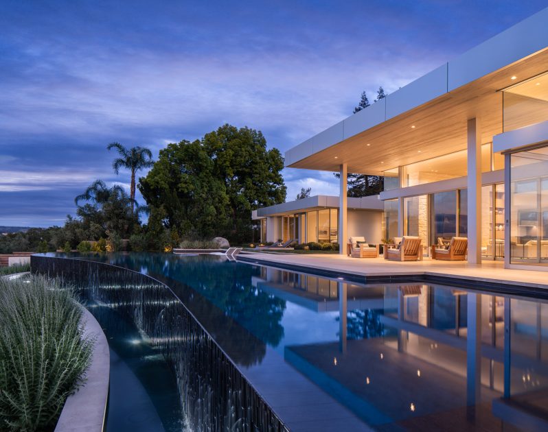 At night, subtle architectural lighting illuminates the home’s facades and outdoor spaces, creating an immersive atmosphere that shifts with the natural surroundings. The guest wing, complete with a rooftop terrace, takes in sweeping views of the Sacramento Valley, while the primary suite opens to vistas of the distant Sierras. The husband’s ceramics studio and the wife’s photography workspace provide dedicated spaces for creativity, reinforcing the home’s role as both a retreat and an artistic sanctuary. By blending contemporary design with the rhythms of the landscape, McClean and Magni have crafted a residence that not only enhances its breathtaking setting but also offers a deeply personal living experience for its owners.