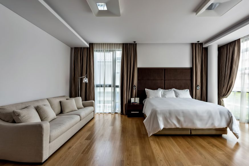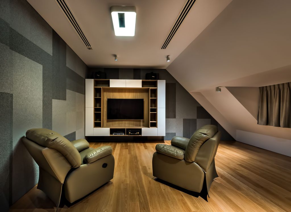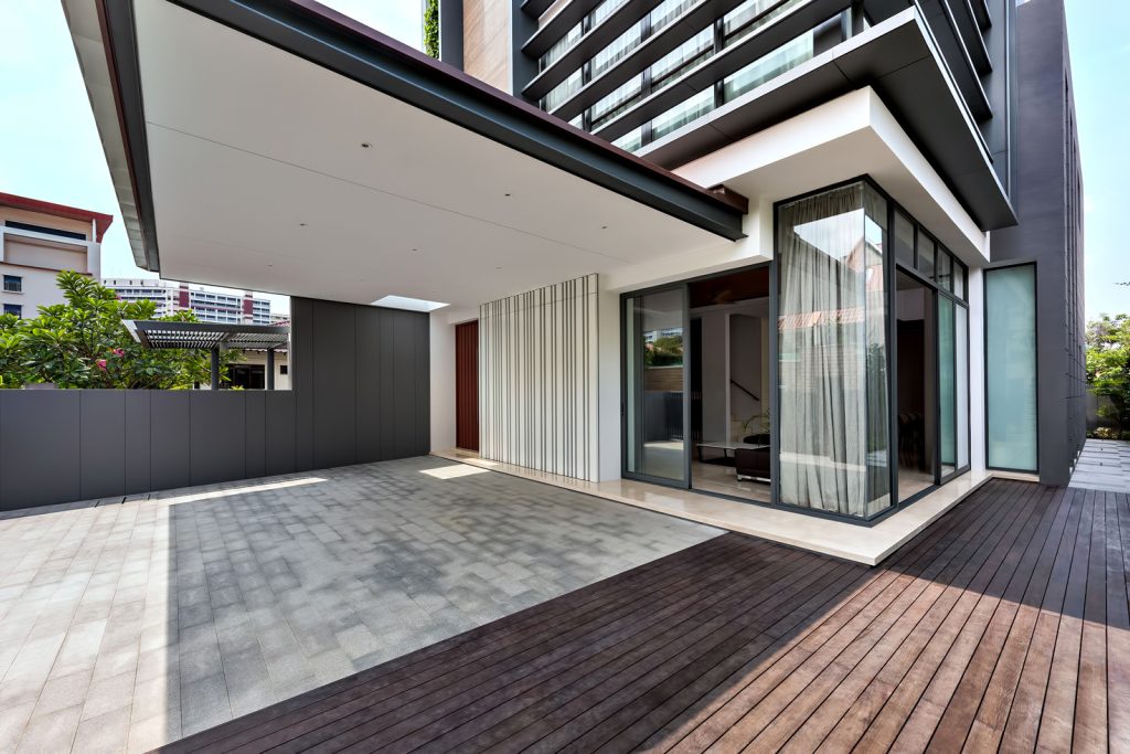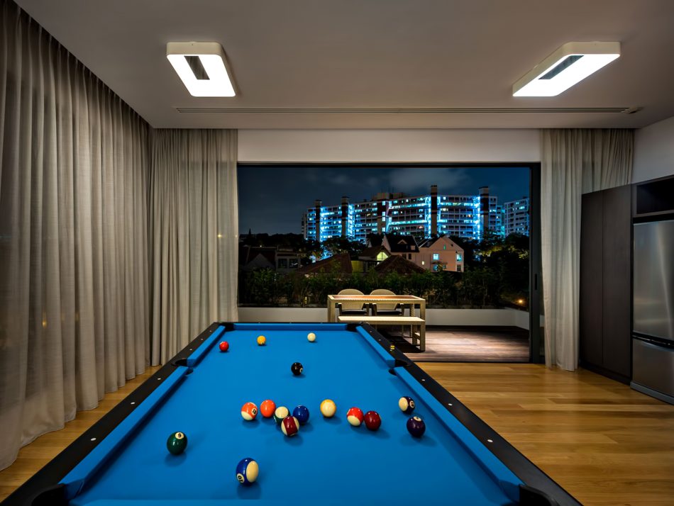 At the first level, the living and dining spaces provided was generous. A high ceiling for most of the first level gave a sense of spaciousness as large full height sliding glass doors further open out the indoors to the outdoors. Effective cross-ventilation permeated throughout the ground level spaces. The dining area was a double volume space that engaged with the second level. All bedrooms were designed in close consultation with the users in mind. The second and third levels were private areas of bedrooms, while the ground and attic levels allowed for more family and entertainment areas. The flow of spaces was aligned with our Client’s desires, with sufficient space for private as well as public areas. The latter include the games area for a pool table that opened out to an open terrace and a soundproof music room at the rear of the attic level.