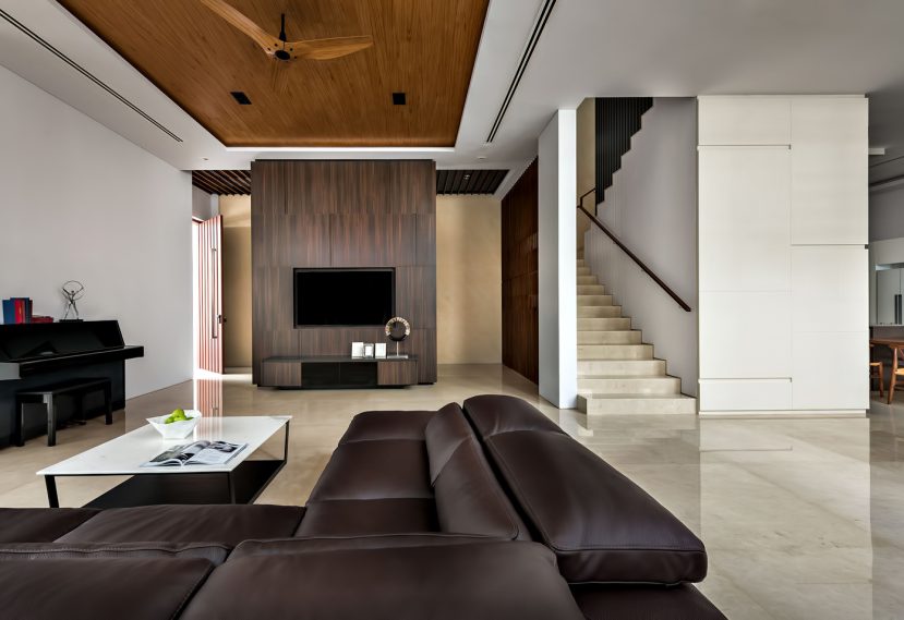 At the first level, the living and dining spaces provided was generous. A high ceiling for most of the first level gave a sense of spaciousness as large full height sliding glass doors further open out the indoors to the outdoors. Effective cross-ventilation permeated throughout the ground level spaces. The dining area was a double volume space that engaged with the second level. All bedrooms were designed in close consultation with the users in mind. The second and third levels were private areas of bedrooms, while the ground and attic levels allowed for more family and entertainment areas. The flow of spaces was aligned with our Clientโs desires, with sufficient space for private as well as public areas. The latter include the games area for a pool table that opened out to an open terrace and a soundproof music room at the rear of the attic level.