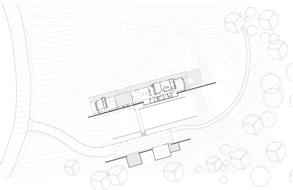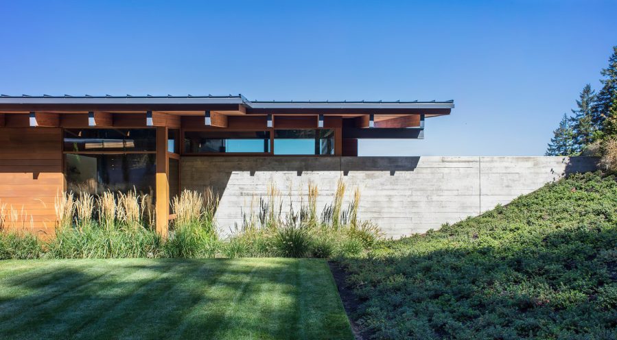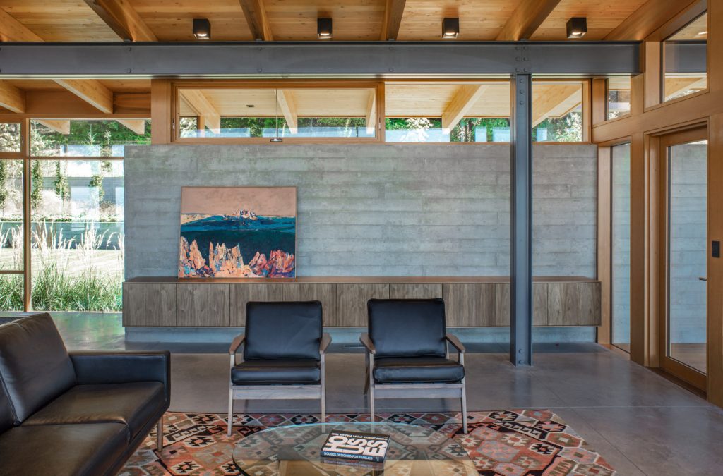 One of the defining features of the Hood River Residence is a striking concrete wall that serves as both a visual anchor and a protective shield. This wall connects the house to the landscape, merging the boundaries between interior and exterior. Nestled into the hillside, it shields the home from the harsh elements, including strong winds, rain, and frost that sweep in from the south. SEA’s careful consideration of the site ensures that the residence not only harmonizes with the environment but also offers a comfortable and sheltered living experience.