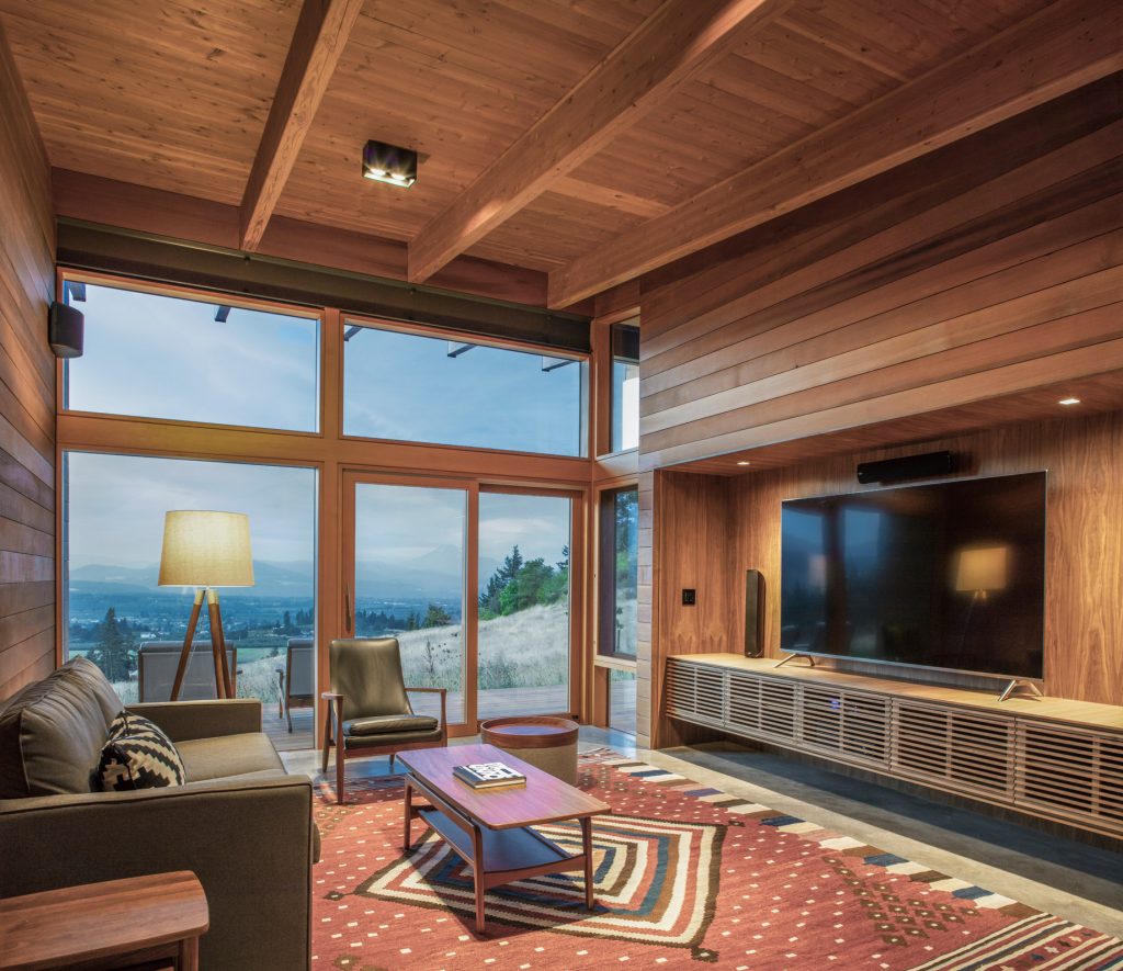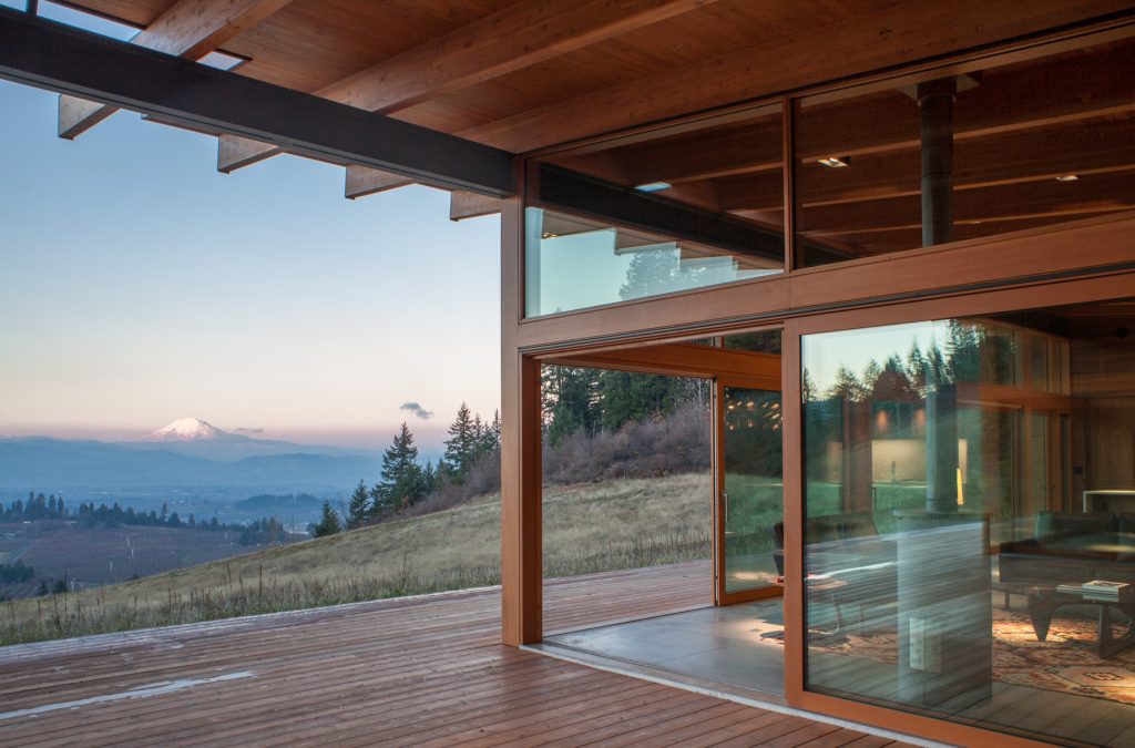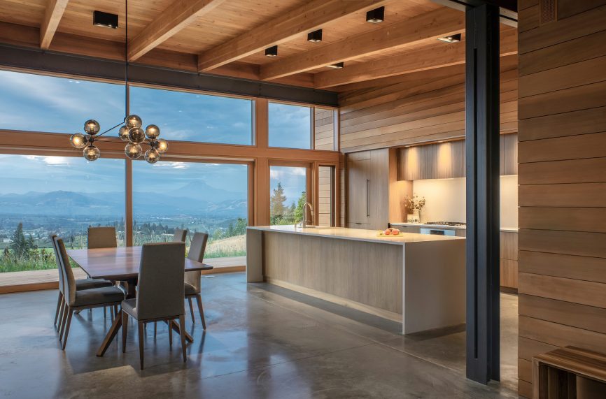 Every aspect of the Hood River Residence’s design by SEA was meticulously tailored to respond to the unique site. Understanding the client’s desire for an awe-inspiring landscape and panoramic views, SEA prioritized these elements throughout the design process. The northern facade of the home is adorned with expansive windows, framing stunning vistas of Mt. Adams and the Hood River Valley. From sunrise to sunset, residents can immerse themselves in the captivating beauty of their surroundings.