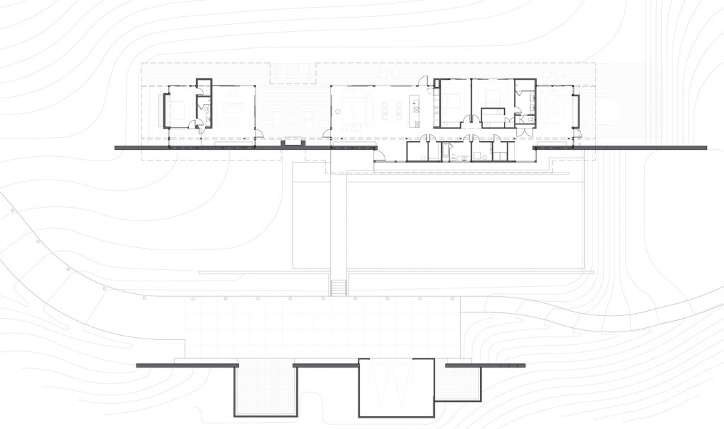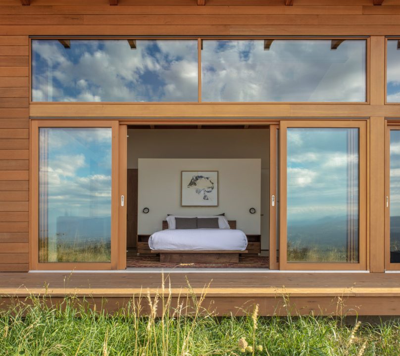 In crafting the design language of the Hood River Residence, SEA employed a restrained and timeless material palette. Wood, concrete, and glass take center stage, echoing the natural elements that surround the home. This deliberate choice ensures that the design remains in harmony with the environment and will stand the test of time. Inside, the largest volume of the house encompasses the main living area, including bedrooms, kitchen, and gathering spaces. A smaller volume houses the guest suite. The open, post-and-beam structure and the interior walls flow seamlessly beneath a grand floating roof. Opening onto a spacious outdoor deck, complete with a covered connecting space and an outdoor hearth, the interior public spaces beckon residents to embrace the landscape as an extension of their living environment. The interior design pays homage to the site and the home’s materiality by incorporating natural textures and locally crafted furnishings, further enhancing the connection between the residence and its surroundings.