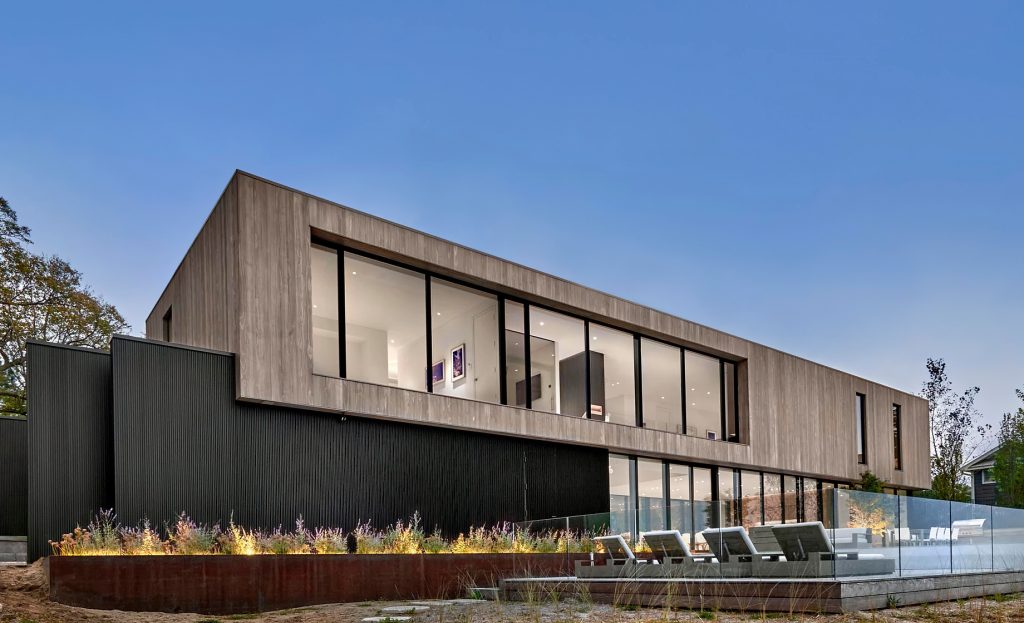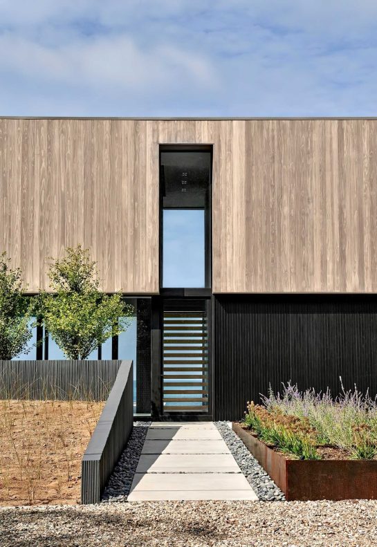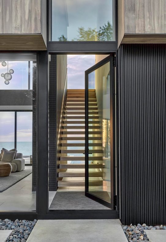 Horizon House was created as a weekend sanctuary for jet-setting owners seeking a St. Barths-inspired lifestyle on Lake Michigan. Located just an hour away from Chicago, the house boasts sleek modern open plan living with expansive glass wall panels. The standout feature is a glass rectangular volume on the first level, which gives the illusion of the second level hovering over the dune and offers breathtaking horizon views. The upper level is clad in sustainable Accoya wood, aging gracefully to blend into the environment. A narrow vertical glass space connects the two horizontal volumes, housing the double-height entry and showcasing a floating staircase.