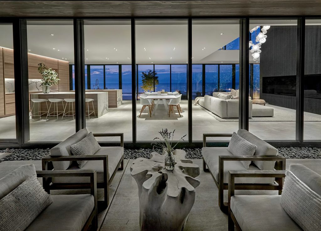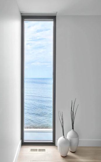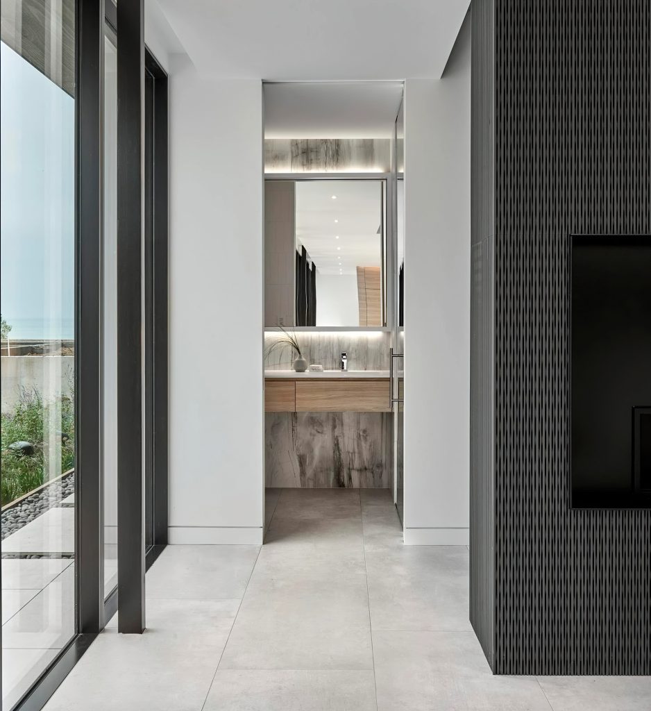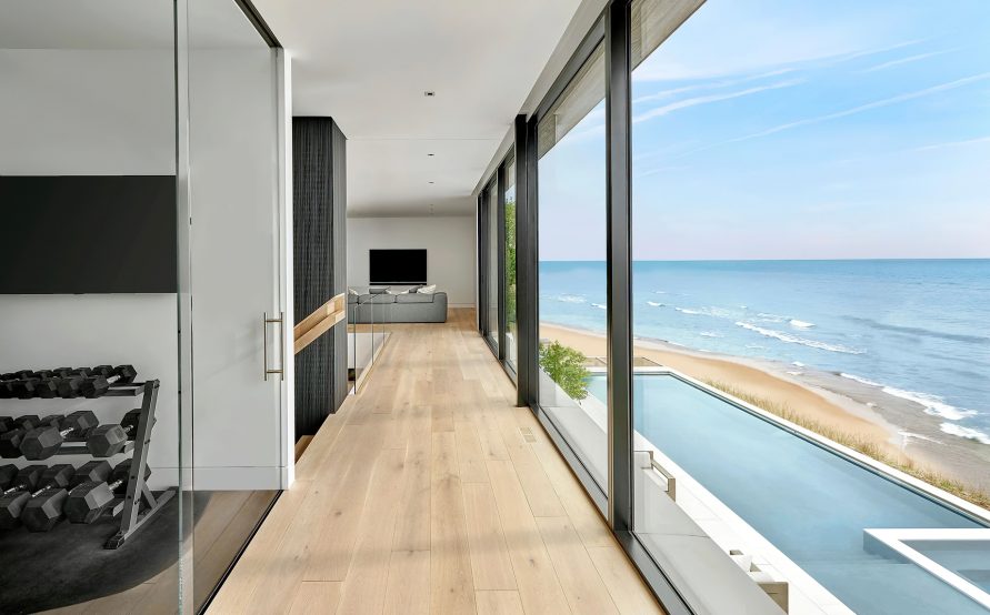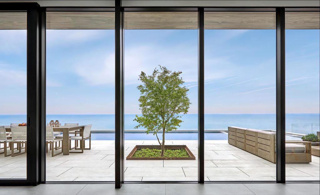 Inside, a contemporary beach aesthetic prevails, with a restrained palette of materials such as white oak millwork, large-format porcelain tile, and warm whites on walls and fixtures. The interior tile extends seamlessly to the pool terrace, enhancing the connection between indoor and outdoor spaces. A leeward courtyard, landscaped with Ginkgo trees, provides shade and respite from lake breezes. The low textured concrete wall adds both privacy and artistic flair. Perimeter lighting highlights the outdoor areas, promoting a seamless flow between the interior and exterior, day and night.