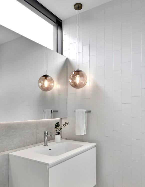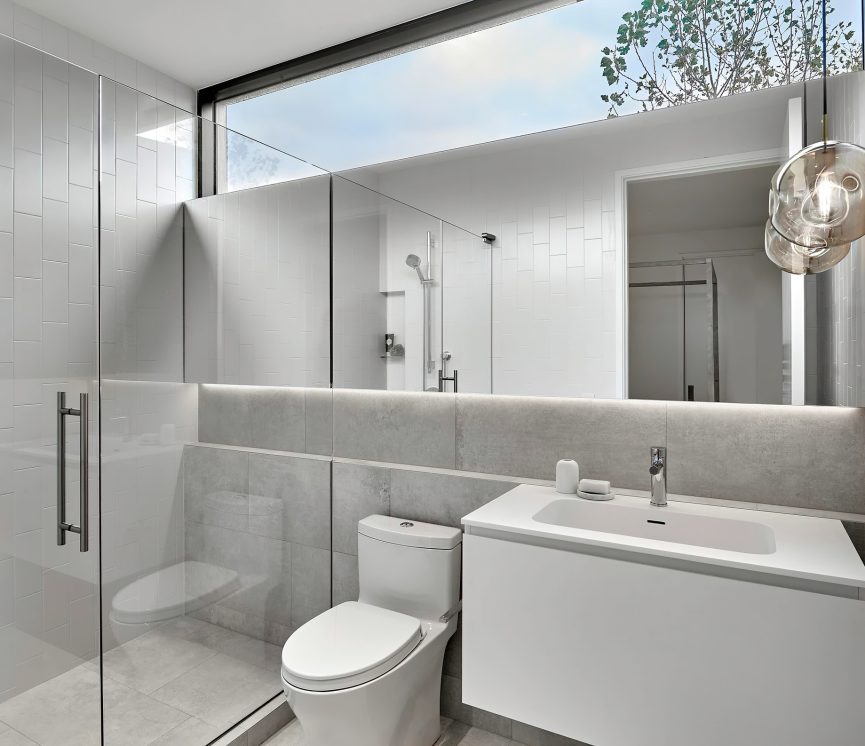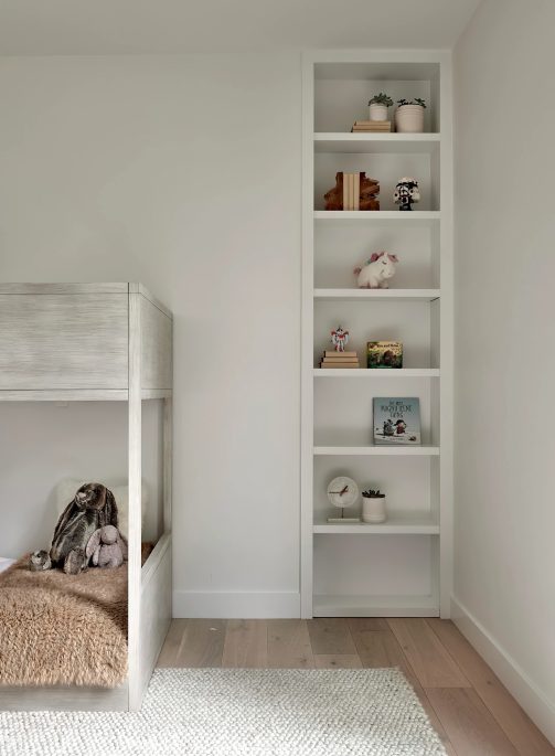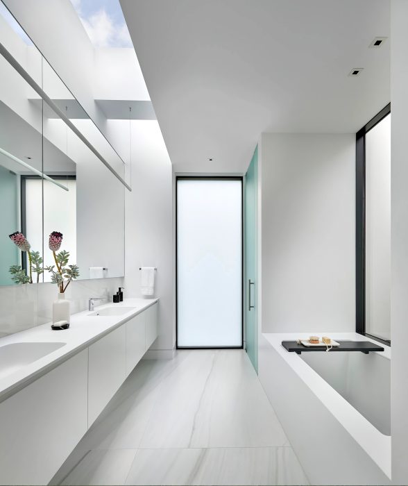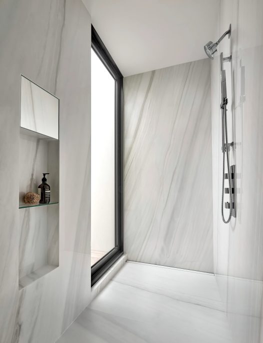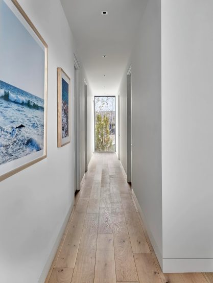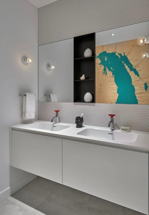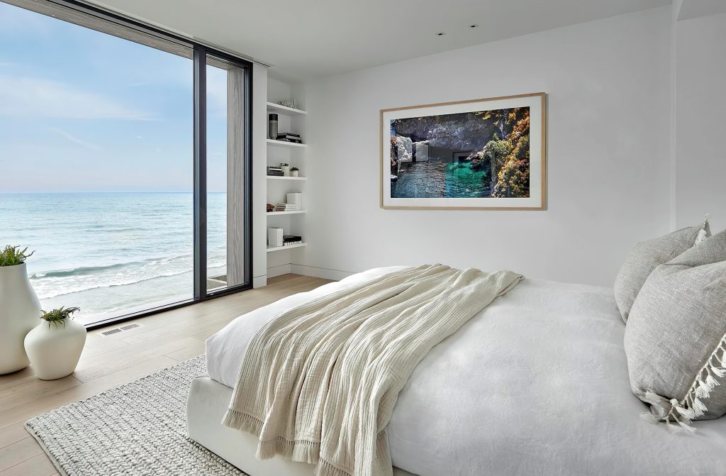 Inside, a contemporary beach aesthetic prevails, with a restrained palette of materials such as white oak millwork, large-format porcelain tile, and warm whites on walls and fixtures. The interior tile extends seamlessly to the pool terrace, enhancing the connection between indoor and outdoor spaces. A leeward courtyard, landscaped with Ginkgo trees, provides shade and respite from lake breezes. The low textured concrete wall adds both privacy and artistic flair. Perimeter lighting highlights the outdoor areas, promoting a seamless flow between the interior and exterior, day and night.
