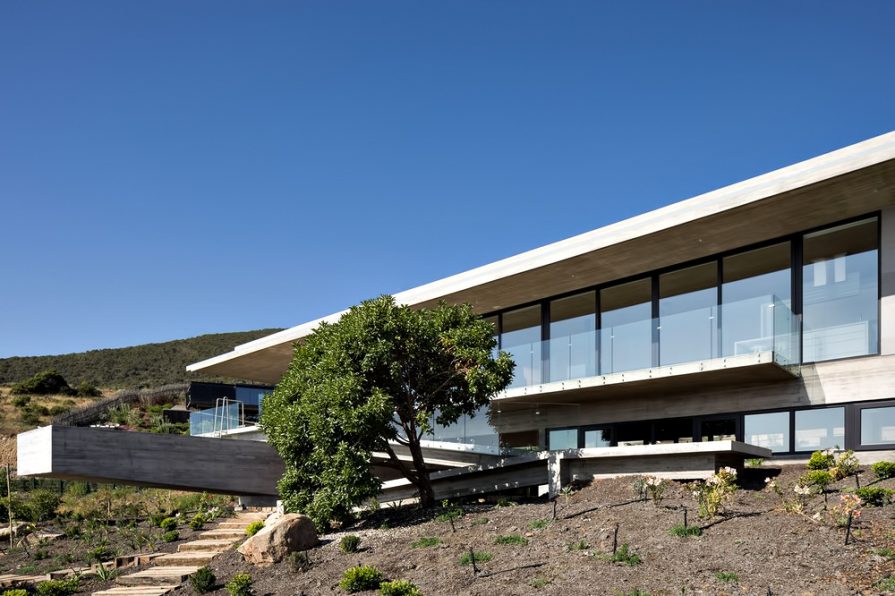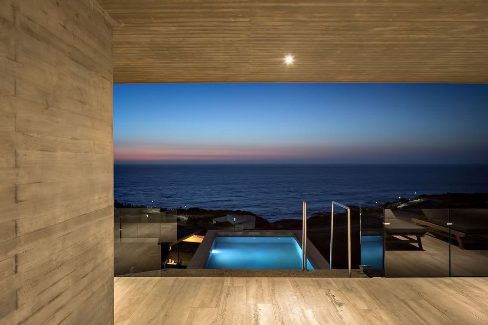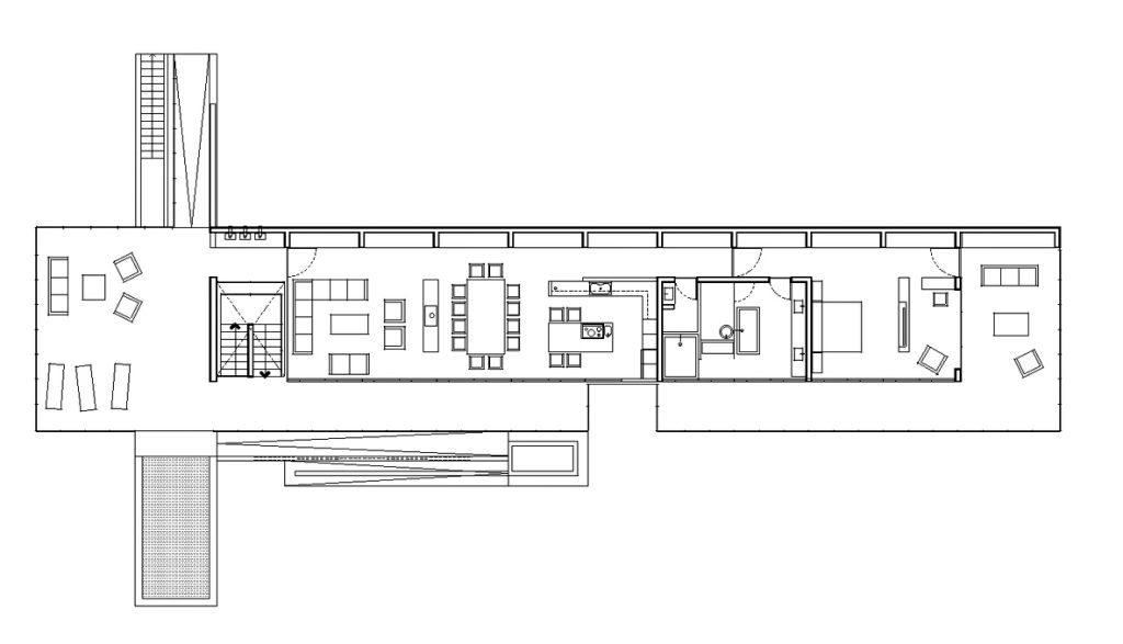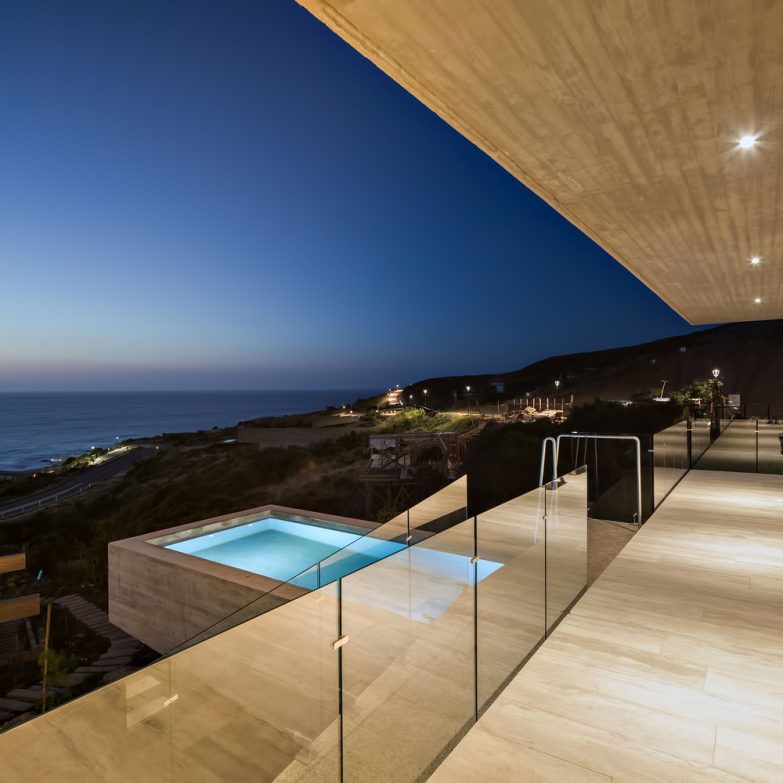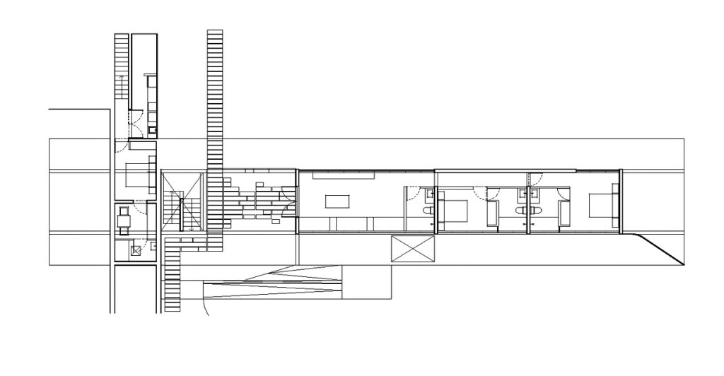 Starting from the top down, the ceiling slab hangs from two main longitudinal beams on a north-south orientation, 41 meters long and 1.40 meters high. The beams are supported by only 4 walls, creating large, 7-meter long cantilevers at both ends. The system rests on two other longitudinal beams of the same length, located under the floor slab. The same 4 walls support the entire structure and project downwards to the floor, creating a base with bedrooms, on one hand, and resting on an east-west transversal volume on the other. The latter volume frames the entrance to the house on one side, and on the other, projects towards the sea and contains the pool, a heavy wedge with a variable section that builds a new cantilever, also 7 meters towards the slope, reinforcing the views of the house towards the sea.