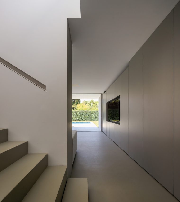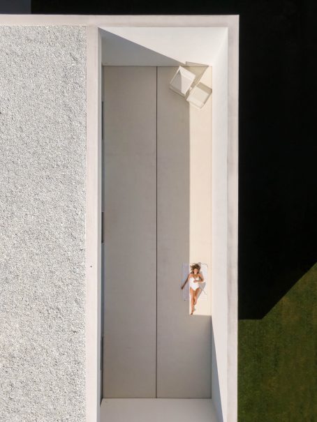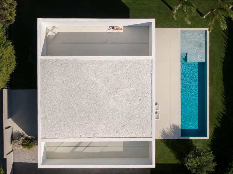 The House of Silence is an innovative architectural project designed by Fran Silvestre Arquitectos that merges a musician’s studio with a residential space in a densely populated suburb of La Canyada near Valencia, Spain. The design strategically positions the recording studio semi-buried on the ground floor, encased in double-layered concrete to optimize acoustics. This not only provides sound isolation but also cleverly separates the house into two zones: the entrance hall and a public area. This public space, which includes the living areas, opens gracefully to an outdoor garden and pool, featuring natural gray cement mortars that blend seamlessly with the external environment and the interior floors.