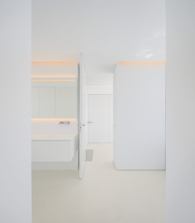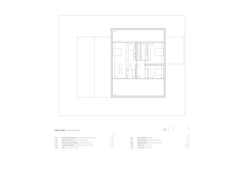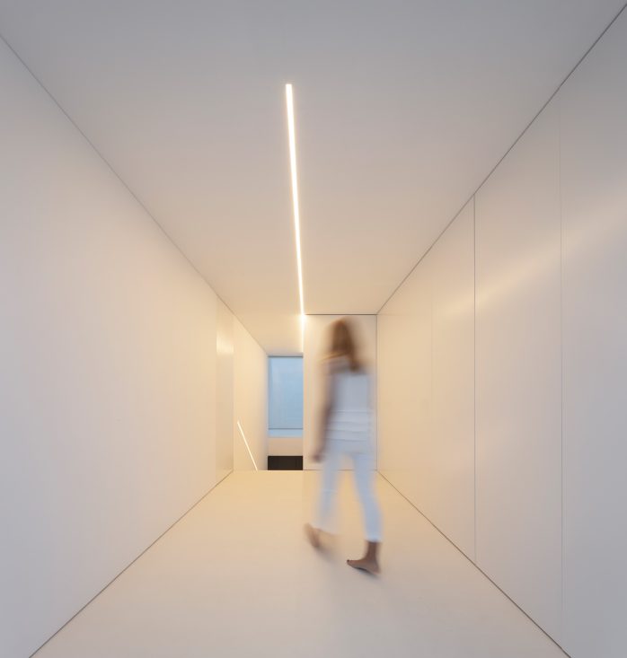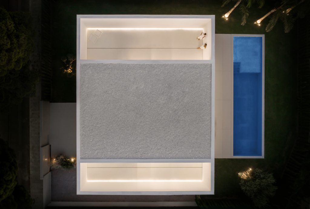 The residential aspect of the house is distinctly outlined on the upper level, where private sleeping quarters are enveloped in white lime mortars. Although this volume presents a closed exterior to shield the residents from the neighborhood’s proximity, it ingeniously opens upwards to private patios that overlook adjacent gardens, offering secluded outdoor enjoyment and a serene connection with nature.