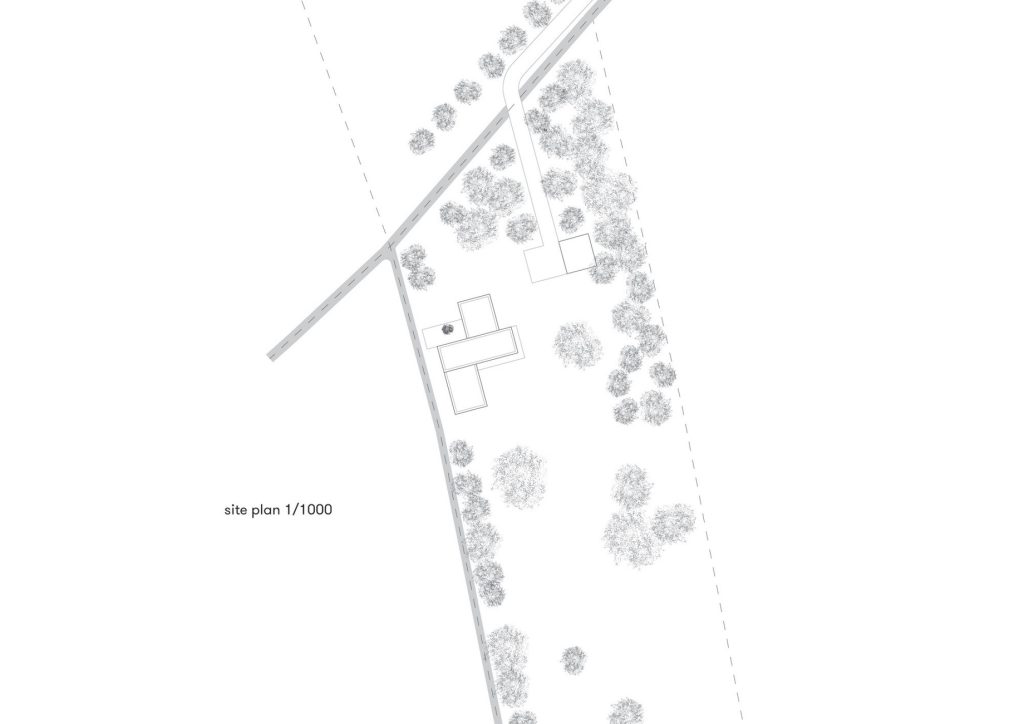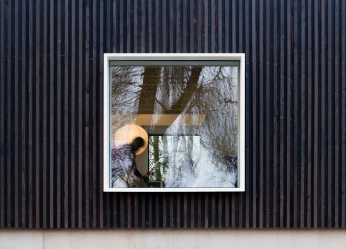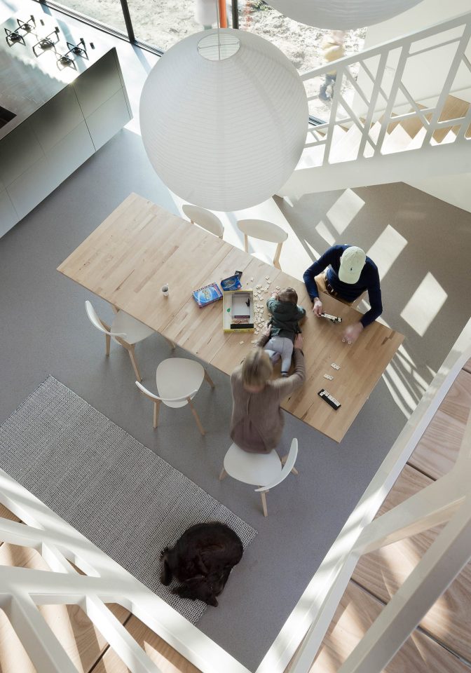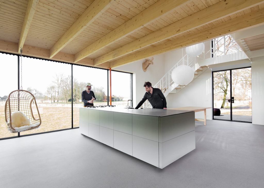 The house’s design thoughtfully integrates modern living with the picturesque Dutch countryside. The three wings, each clad in slender vertical strips of larch, converge at the heart of the home, a double-height dining room that serves as a central gathering space. Large windows in each wing frame views of the surrounding fields, gardens, and forests, bringing the outside in and creating a seamless flow between interior and exterior spaces. The thoughtful orientation and layout of the windows ensure that each cardinal direction offers a different interaction with the landscape, from northern light to southern vistas, enhancing the home’s connection to its environment.