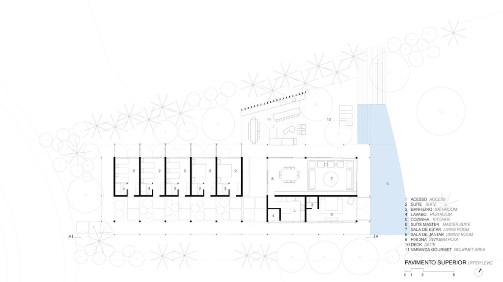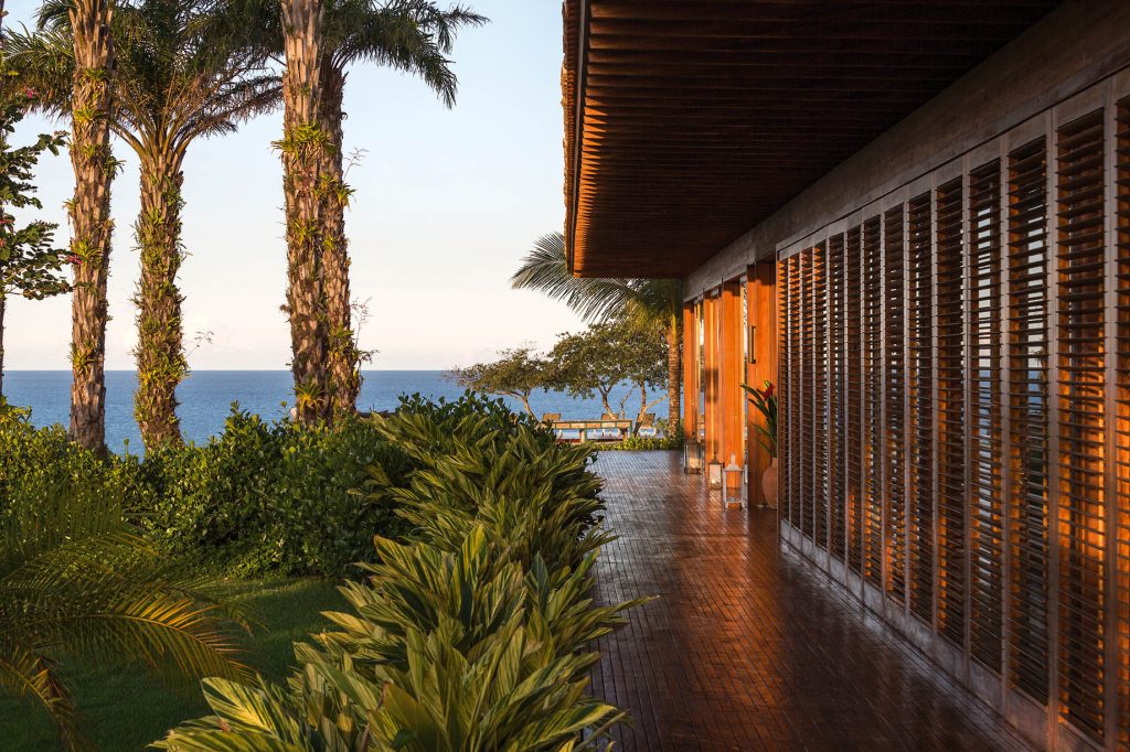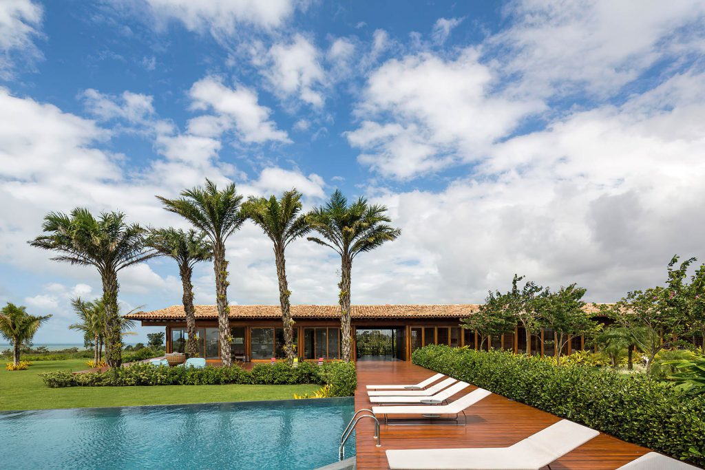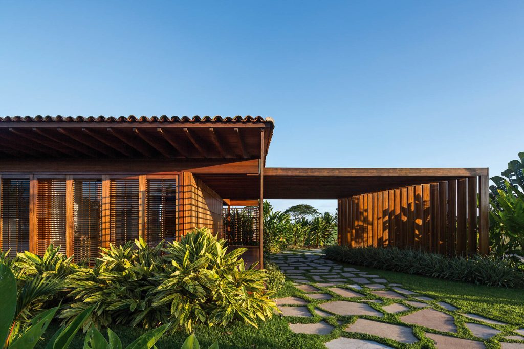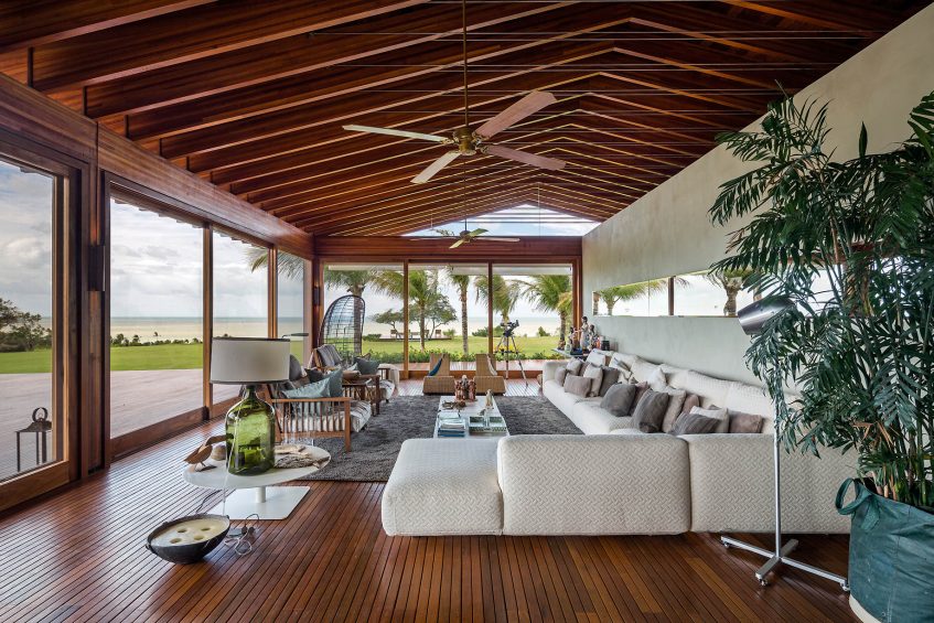 JCA House is a captivating summer retreat nestled in the heart of Bahia, designed to embrace the essence of the region while offering year-round comfort. The residence is elevated on a sprawling wooden platform, a strategic choice that not only provides a heightened perspective but also mitigates the impact of moisture. Divided into two distinct volumes, the smaller block houses the master suite, kitchen, pantry, and toilet, while the larger block boasts five generously appointed suites. A sweeping gable roof and a sleek rectangular projection seamlessly integrate these elements, creating expansive, lofty spaces that play host to the living and dining areas, as well as elegant circulation galleries. In the basement, a collection of service rooms and a private sanctuary with a home theater invite moments of quiet indulgence.
