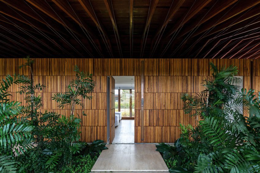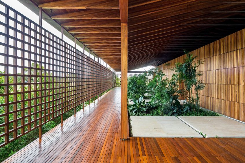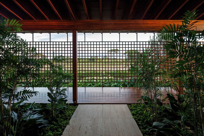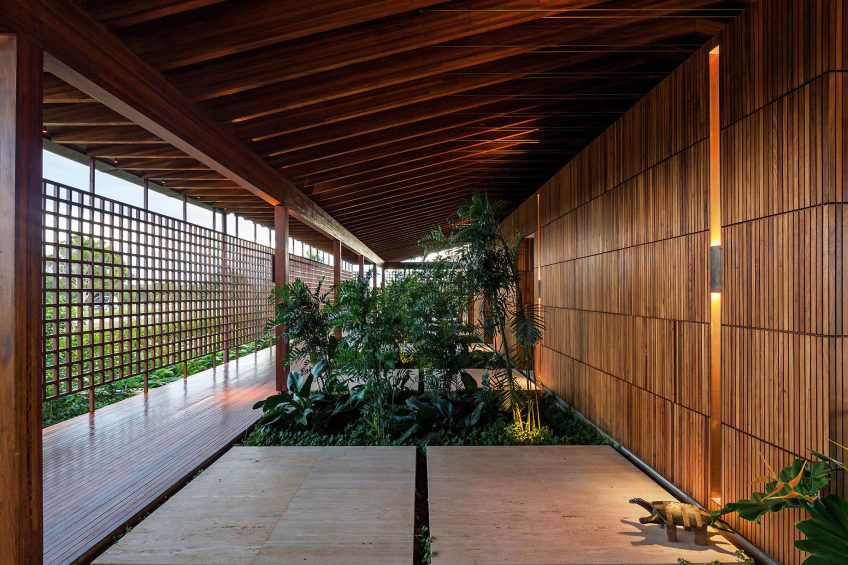 By artfully confining the design to a single floor, JCA House treads lightly upon its surroundings, preserving the natural landscape. The magnificent Cumaru wooden platform not only imparts a sense of weightlessness to the structure but also acts as a barrier against ground-level moisture. The architects’ meticulous attention to detail extends to cross-ventilation systems, ingeniously woven into the fabric of the home through spacious layouts and thoughtfully positioned apertures. The seamless flow between indoor and outdoor spaces is a testament to the designers’ commitment to integration. From the continuous flooring that blurs the boundary between inside and out to the intricately designed wooden cobogó that lines the facade, every element serves to filter sunlight, provide privacy, and facilitate airflow.