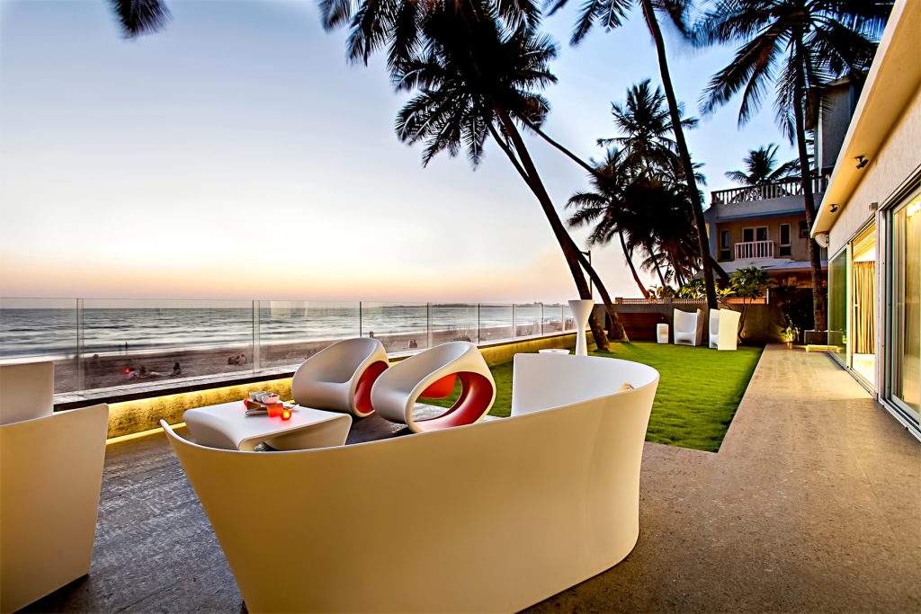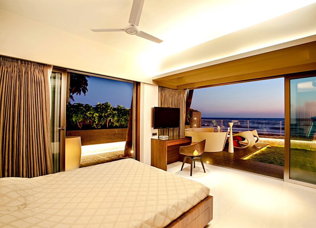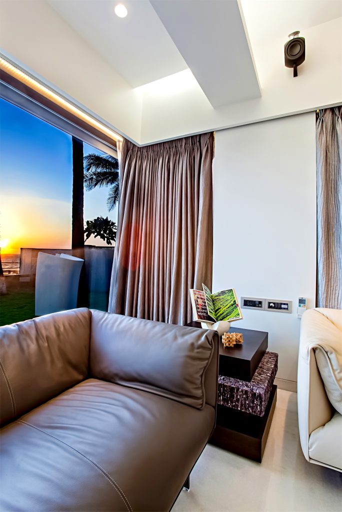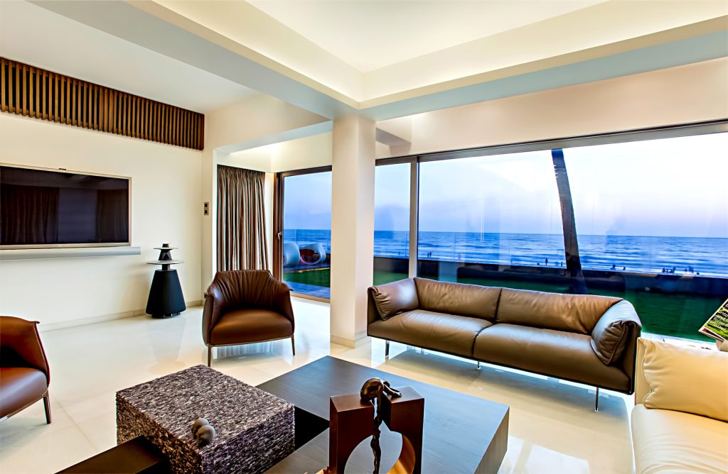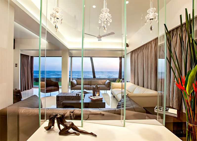 Boasting stunning oceanfront views, this 2,500 sq. ft. luxury apartment clad in white Makrana marble located in Mumbai, India is set mere steps away from the glistening sands of Juhu Beach, one of the most famous beaches in Mumbai.