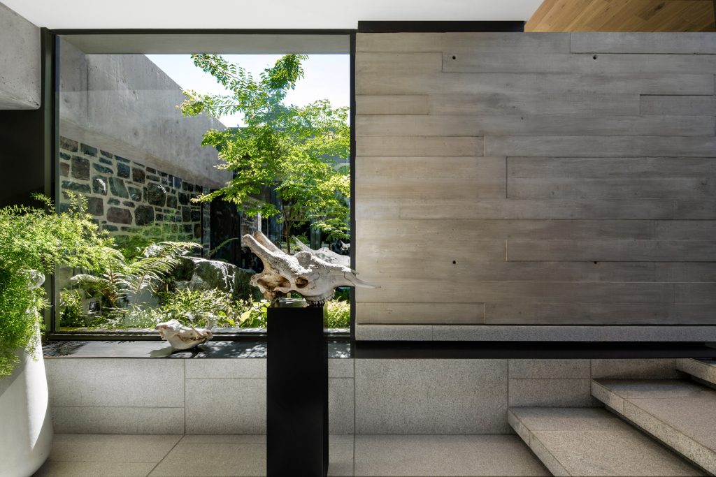 Externally, the house exhibits a dark-colored facade, effectively minimizing its visual impact and allowing it to recede into the background. Internally, a muted color palette prevails, creating an ambiance of understated elegance. The incorporation of washed oak accents infuses the living spaces with warmth, adding to the overall sense of comfort and tranquility within the home. Upon entering the house through the imposing metal front door, nestled between the house proper and the stone wall, one is greeted by a small entrance lobby connected to a courtyard garden. This tranquil space sets the tone and leads a few steps upward to the living area, where sweeping vistas of the cityscape unfold, reminiscent of scenes from a cinematic masterpiece.