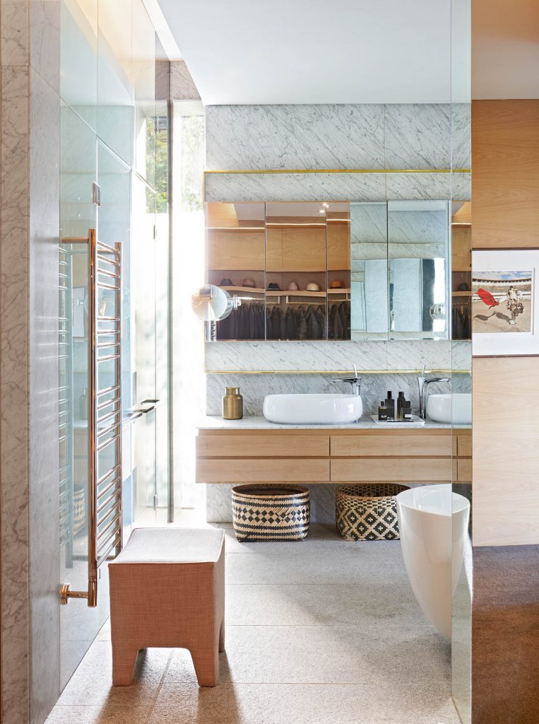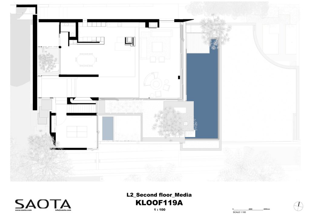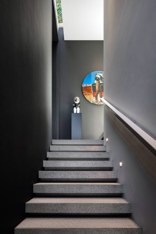 The house spans three levels, each serving a distinct purpose. The upper level, boasting the most breathtaking views, includes the primary living spaces that feature an open-plan kitchen, dining room, and lounge. The mid-level accommodates the family’s work and bedroom areas, while the lower level encompasses the garage, gym, cinema, and guest room. Each level features its own assortment of gardens and courtyards, which seamlessly blend with the natural landscape. These carefully designed green spaces cascade down the mountain surface, shielding the neighboring buildings and deepening the relationship with nature. They invite an abundance of light and air into areas that would otherwise be dimly lit and isolated, enhancing the overall sense of harmony between the built environment and its surroundings.