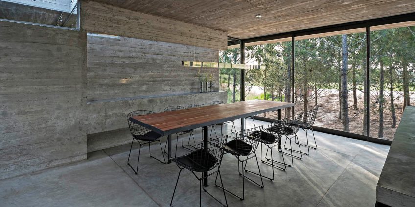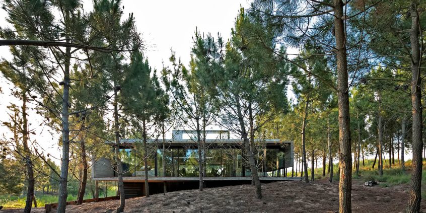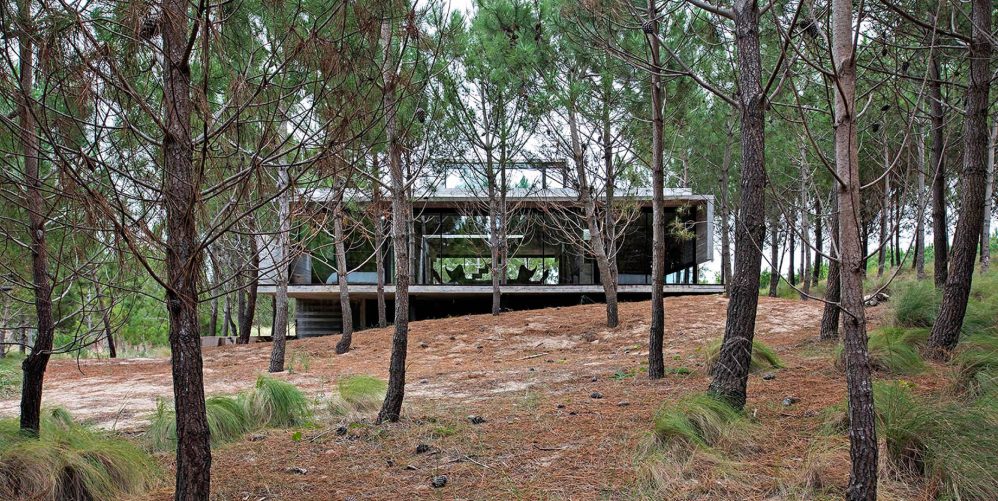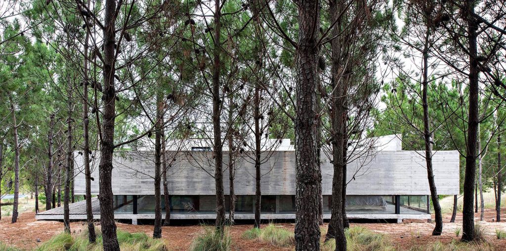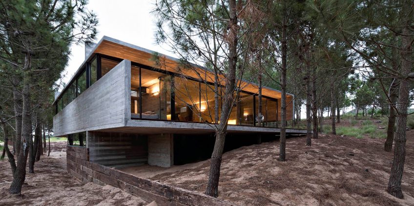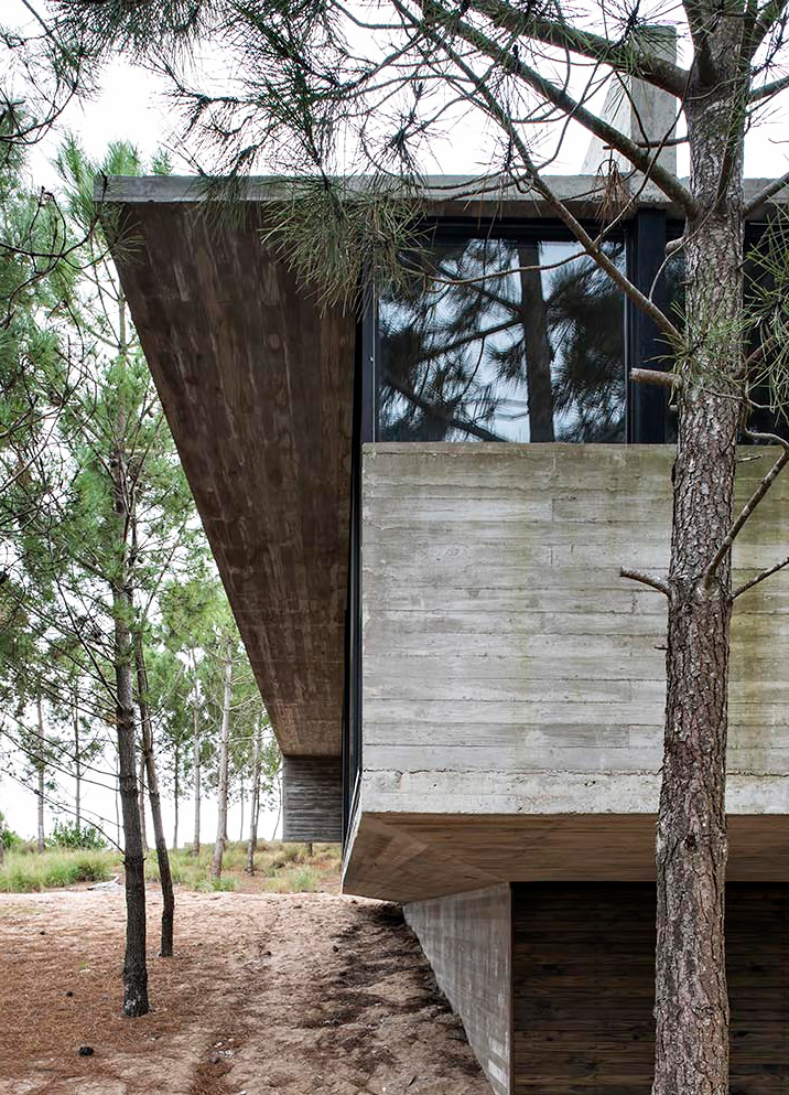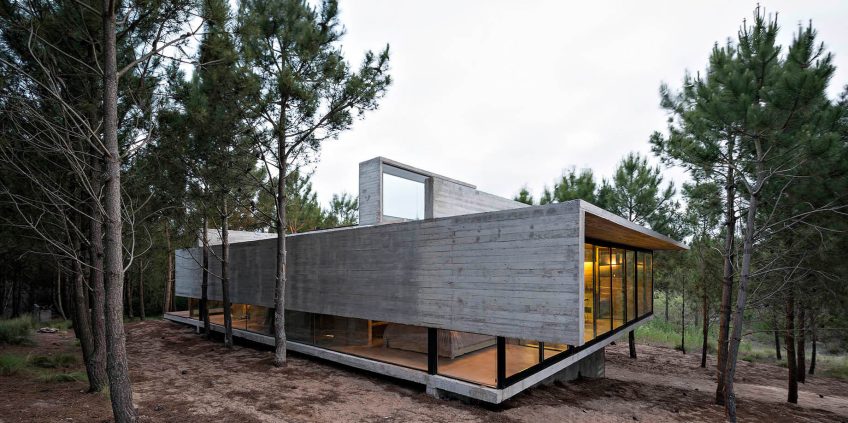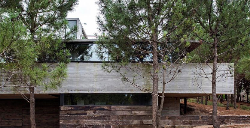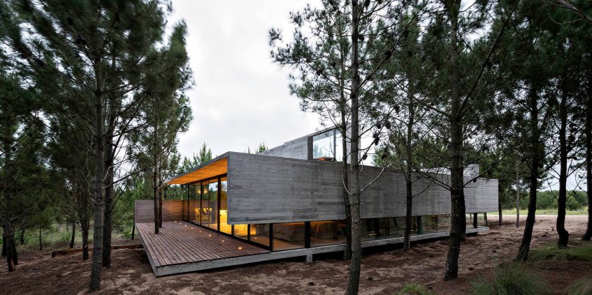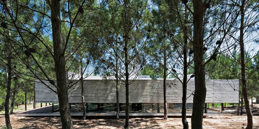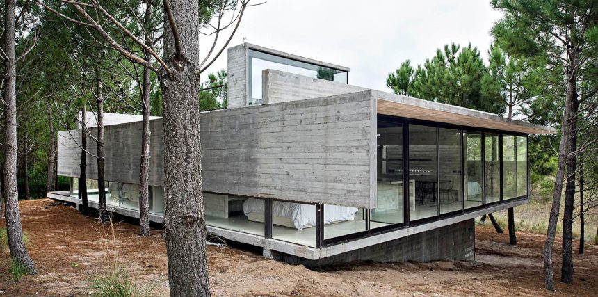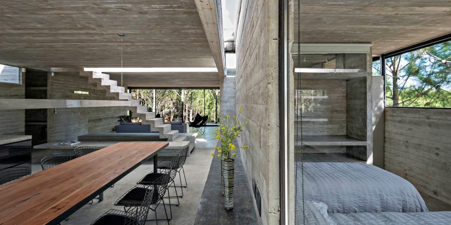Cast in place as a monolithic sculpture of concrete and glass, the L4 house is a luxury holiday residence set within Costa Esmeralda in Argentina amid a lush virgin coastal landscape of pine trees and sand dunes that resolutely admire sensational sea views embraced by crystal blue skies. The striking residence was dramatically architected as a suspended box with large concrete slabs that form the autonomous material elements of the structure while, at the same time, expressing a poetic intimate harmony of place within the topography of the setting.