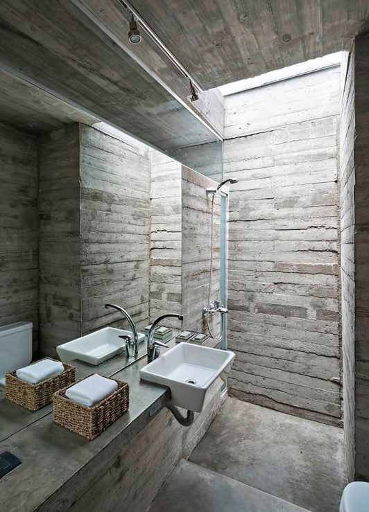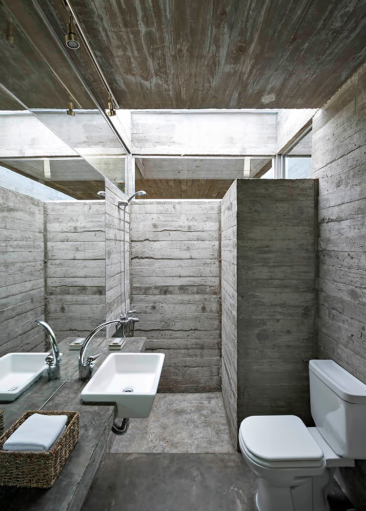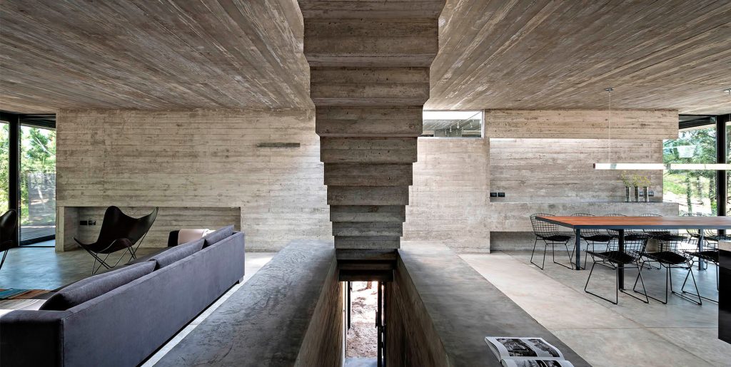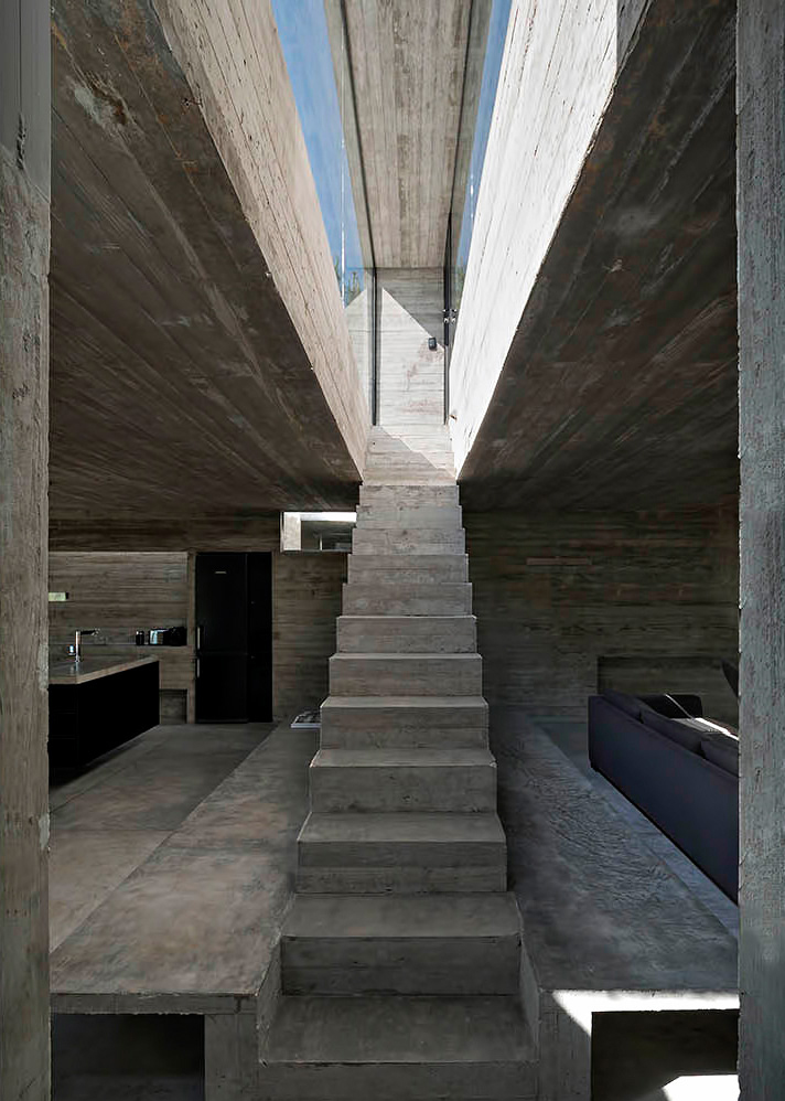 While blind walls with horizontal cracks closed the sides of the home, a transparent barrier occupying the boxโs whole width and height directing views and framing the visuals enclosed both the front and the rear. On the rear, the opening framings help the inside expand into the semi-covered deck that merges into the outdoor space. The concreteโs own malleability allowed the stairs to be conceived as an autonomous sculptural element while the walls that separate the bedrooms from the central area were treated with the same expressive plasticity, thus generating niches and protruding volumes that function as fixed furniture.