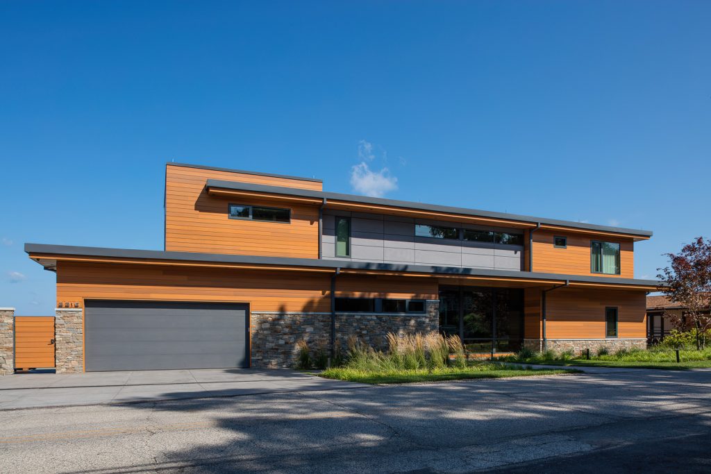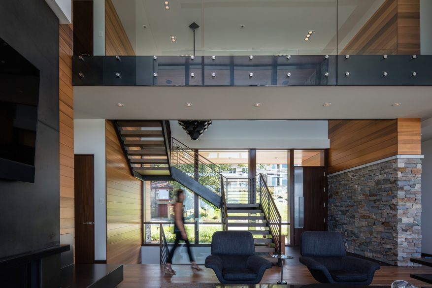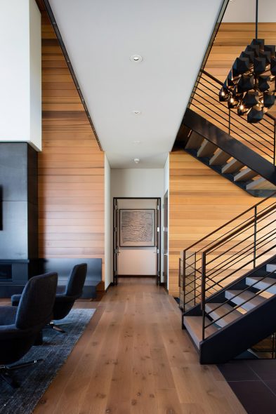 The home’s exterior features Western Red Cedar siding, which wraps the house and continues into the interior past the glazing. The tongue and groove cedar siding accents the recessed ceiling areas that define the dining and kitchen spaces. The cedar soffits blend into cedar ceilings in the two-story high space, creating a continuity that is obvious through the tall window wall.