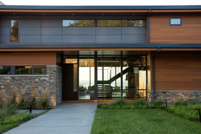 The site for Long Beach Residence was a combination of three small lots along a tightly packed shoreline. The home appears low and linear from the street, with only two of the three floors visible. The long roof lines and material palette of stone, cedar, and cement board accentuate the home’s horizontal qualities anchoring the unique design, which seamlessly ties together the interior and exterior finish palettes, makes it an exceptional retreat for the family, where they can gather and enjoy the beach life.