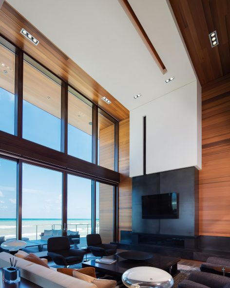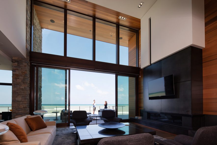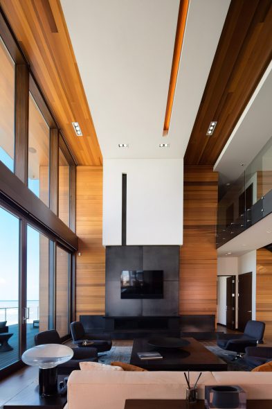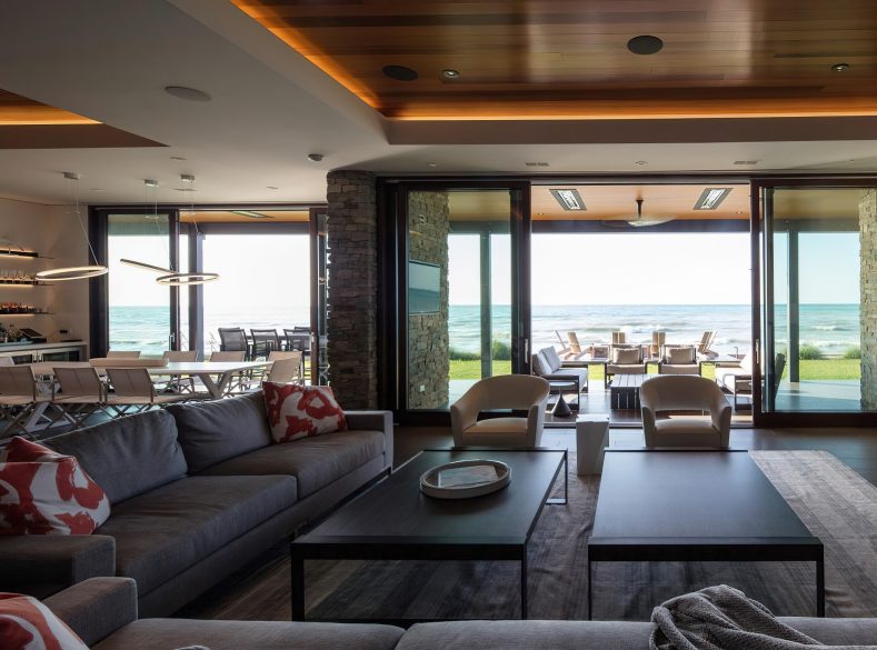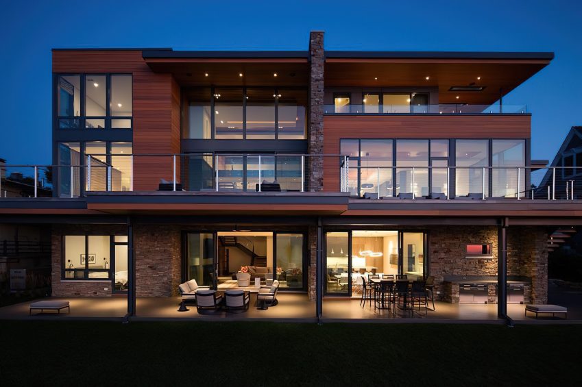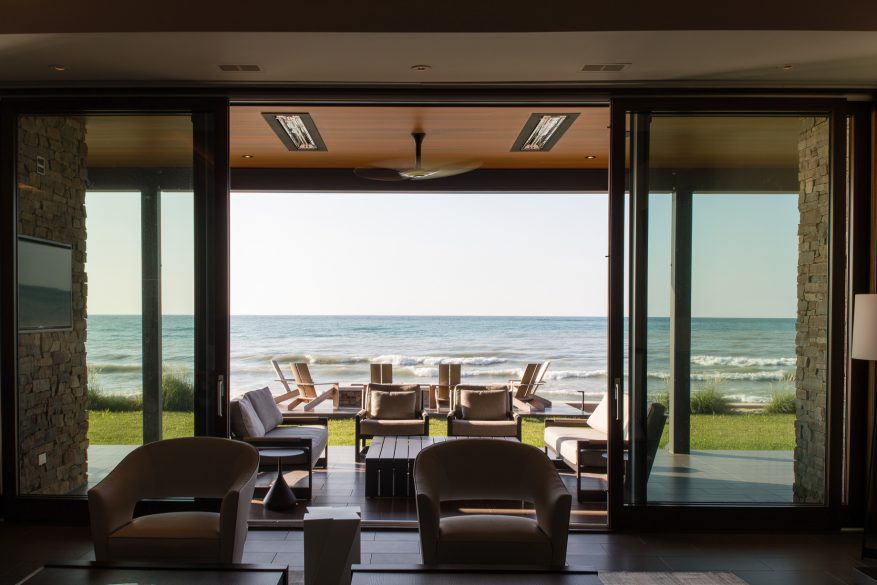 The house features two levels of gathering zones, each with its own living room, kitchen, and dining rooms. The upper level accommodates formal entertainment and boasts spectacular views across the lake to Chicago’s skyline. The lower level is more relaxed and suited to beach life. The home’s design utilizes the steep slope from road level to beach level to allow each floor to open fully to the waterfront. Decks, patios, fireplaces, and outdoor cooking areas enhance the outdoor living experience.