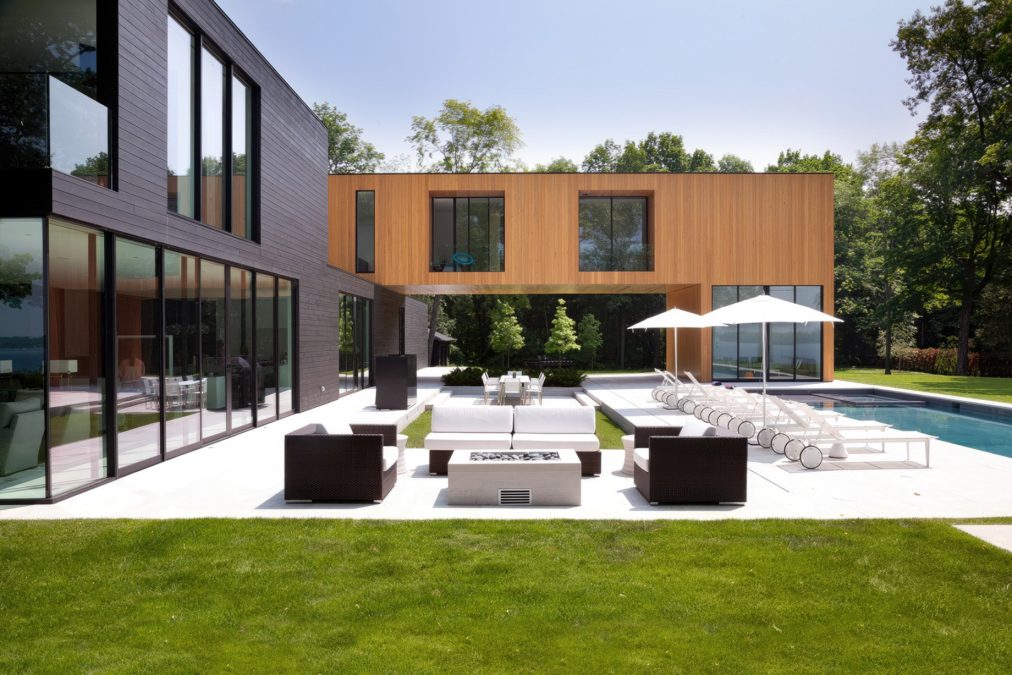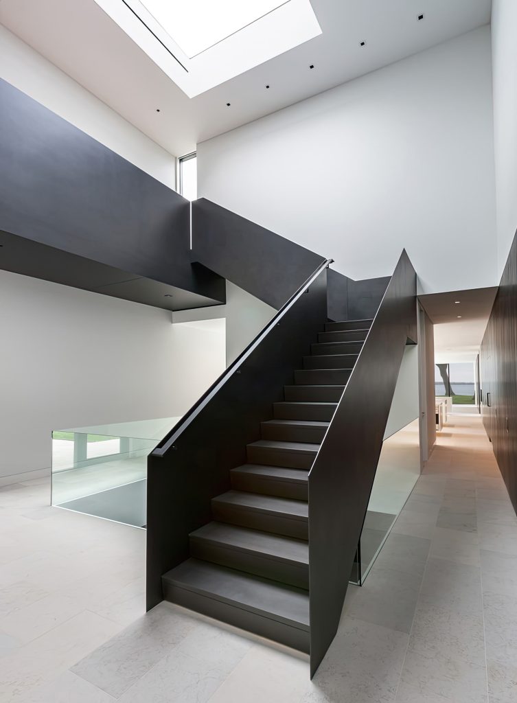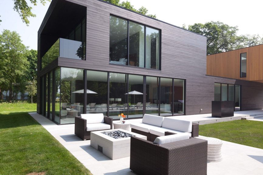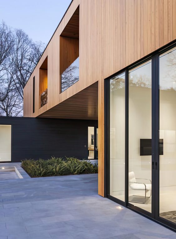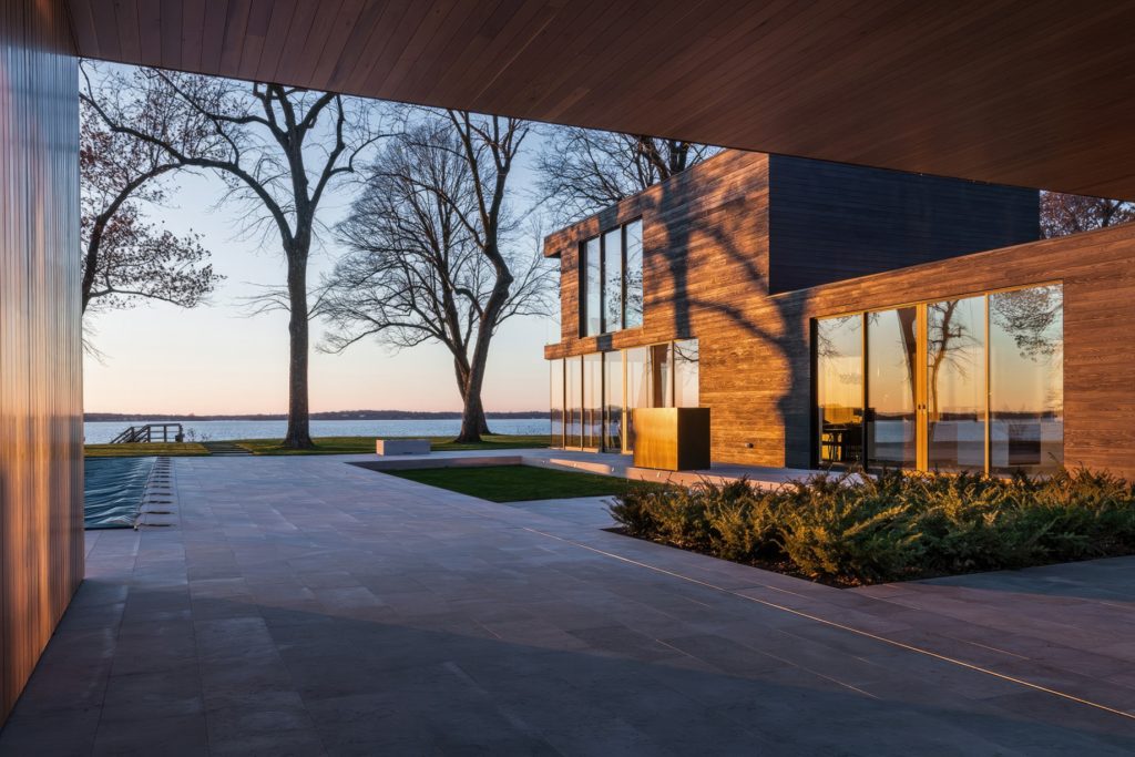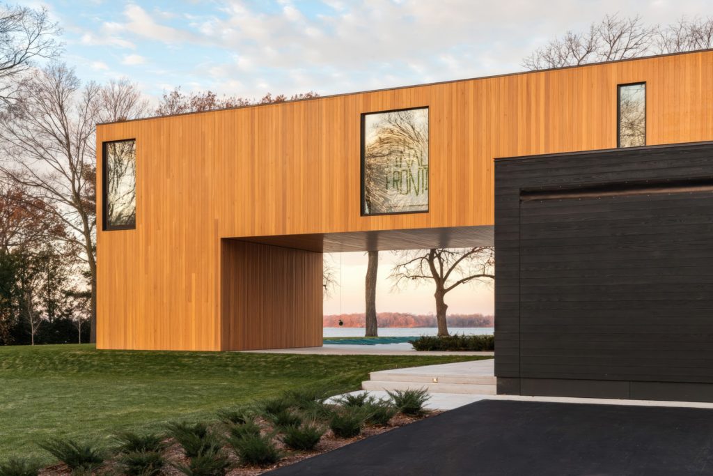 Perched on the wooded shores of Lake Minnetonka, the Lake Minnetonka Retreat Home by Snow Kreilich Architects is a striking example of modern residential design that harmonizes geometric rigor with its natural surroundings. The residence is defined by two distinct volumes: a clear cedar-clad bar that extends from the pool house through the children’s wing to the entry court, and a black-stained cedar volume that stretches from a concealed garage to the main living spaces before rising to form a master suite. These intersecting forms frame sweeping lake views, creating a visually arresting approach and an interior experience of soaring spaces punctuated by a custom steel staircase and a dramatic skylight that opens up to the sky.