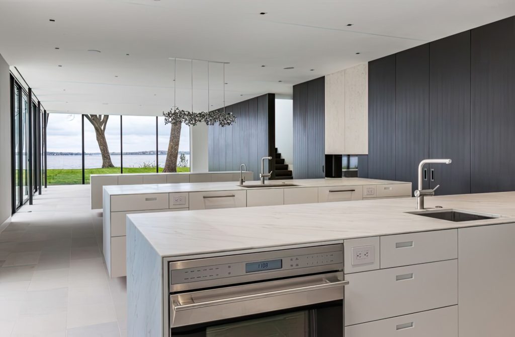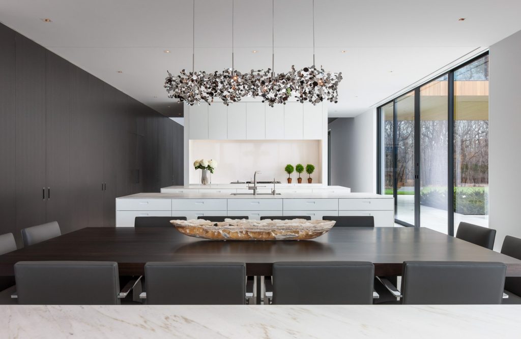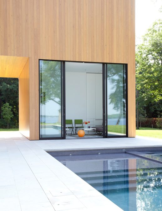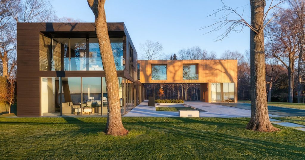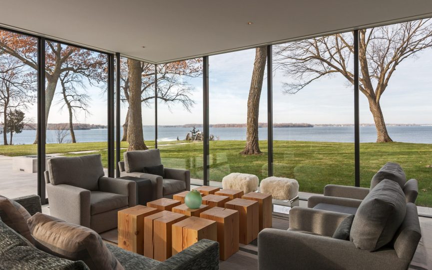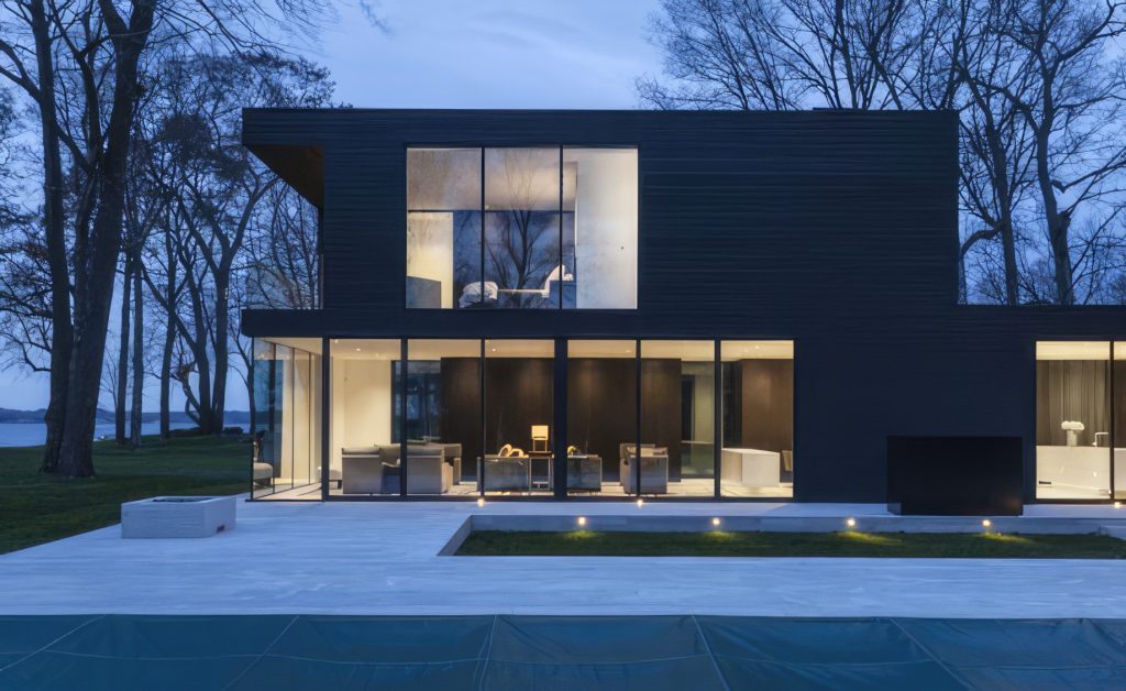 Perched on the wooded shores of Lake Minnetonka, the Lake Minnetonka Retreat Home by Snow Kreilich Architects is a striking example of modern residential design that harmonizes geometric rigor with its natural surroundings. The residence is defined by two distinct volumes: a clear cedar-clad bar that extends from the pool house through the children’s wing to the entry court, and a black-stained cedar volume that stretches from a concealed garage to the main living spaces before rising to form a master suite. These intersecting forms frame sweeping lake views, creating a visually arresting approach and an interior experience of soaring spaces punctuated by a custom steel staircase and a dramatic skylight that opens up to the sky.