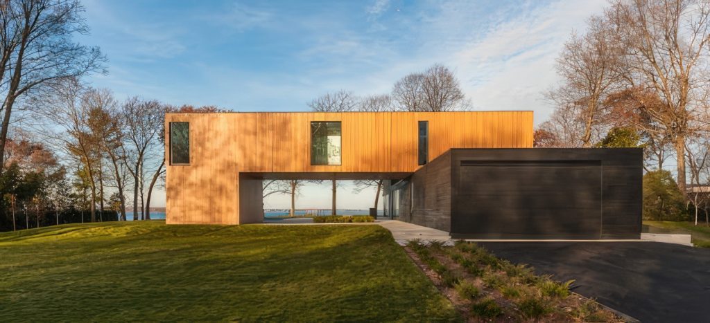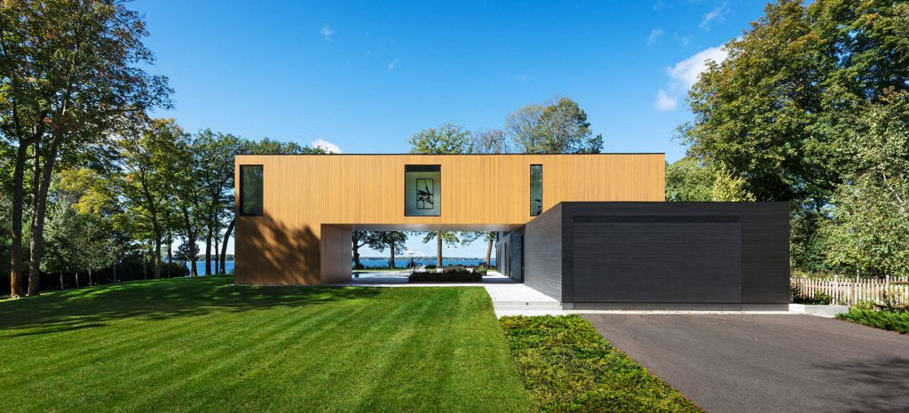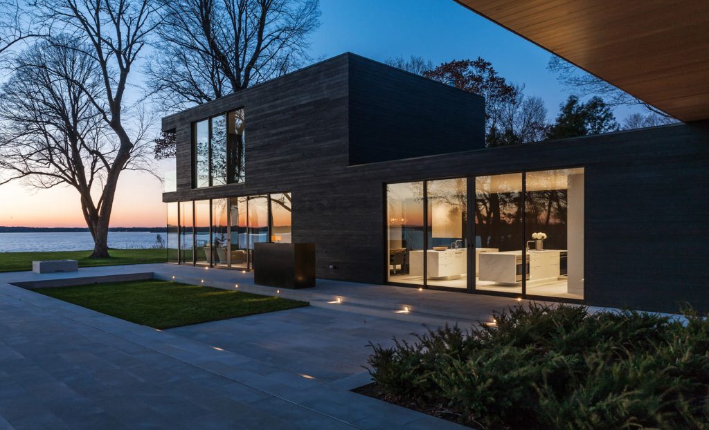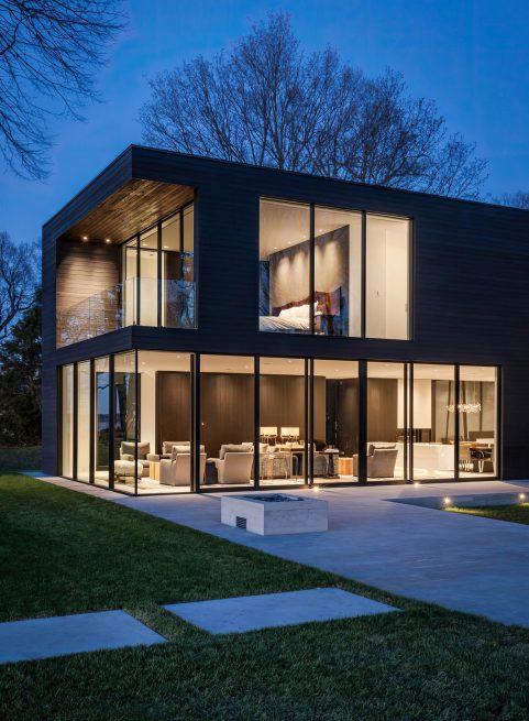 Lake Minnetonka Retreat House, by Snow Kreilich Architects, is situated on a wooded site overlooking Lake Minnetonka, Minnesota. The home’s design features two intersecting volumes: a clear cedar-clad bar and a black-stained cedar structure, framing breathtaking lake views. Inside, a three-story space with a custom steel staircase and skylight creates a sense of infinite height.