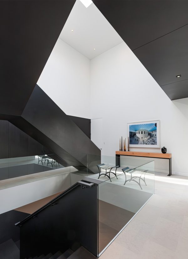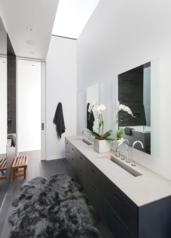Inside, the home is a masterclass in spatial drama and materiality. The 8,667-square-foot layout (7,187 square feet excluding the garage and mechanical spaces) is organized around the intersection of its two main volumes, creating both focused and panoramic views that invite occupants to engage with the landscape. The vertical cedar cladding of the exterior extends into the interiors, where it defines the character of the soaring three-story central space. The juxtaposition of natural and black-stained cedar cladding not only shapes the visual experience but also enhances the home’s connection to its environment.