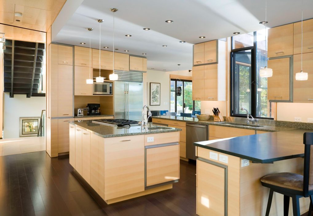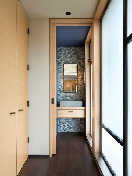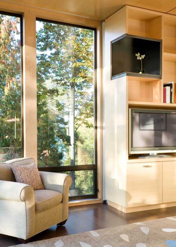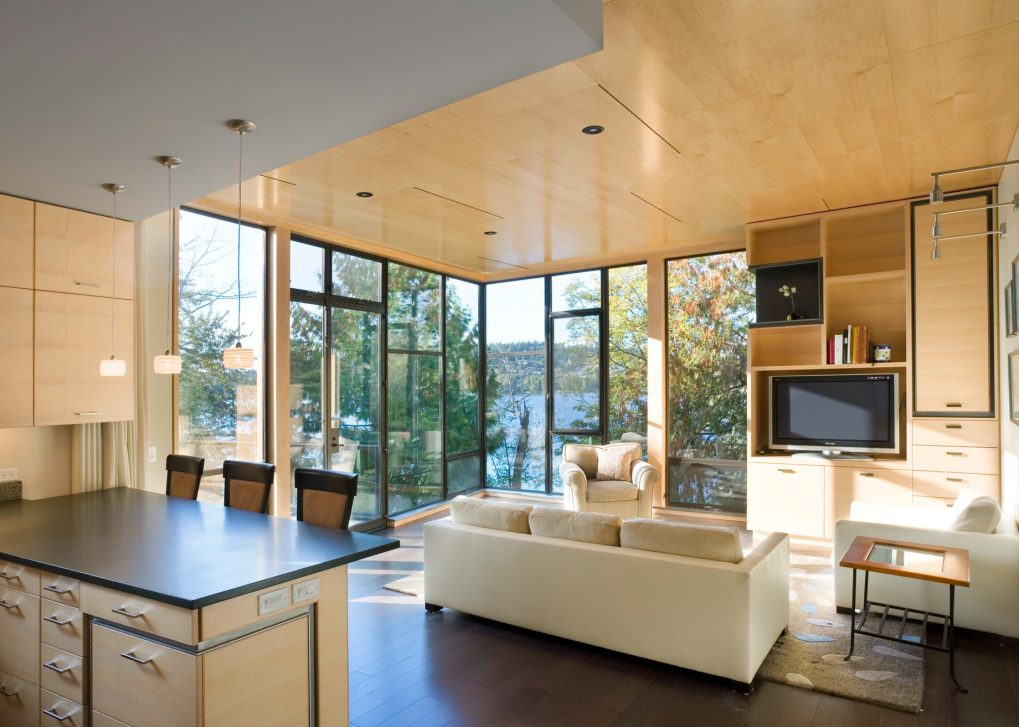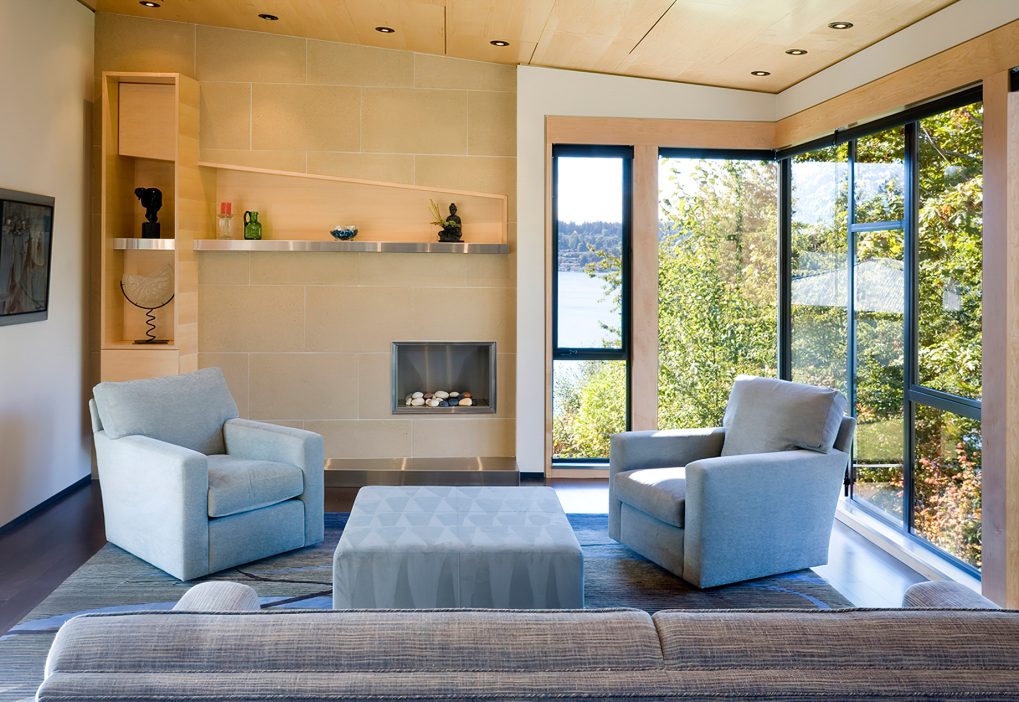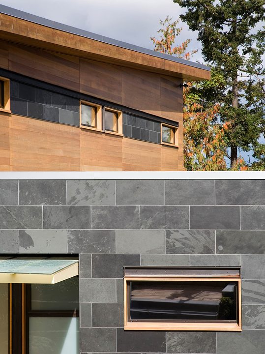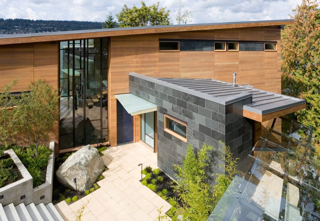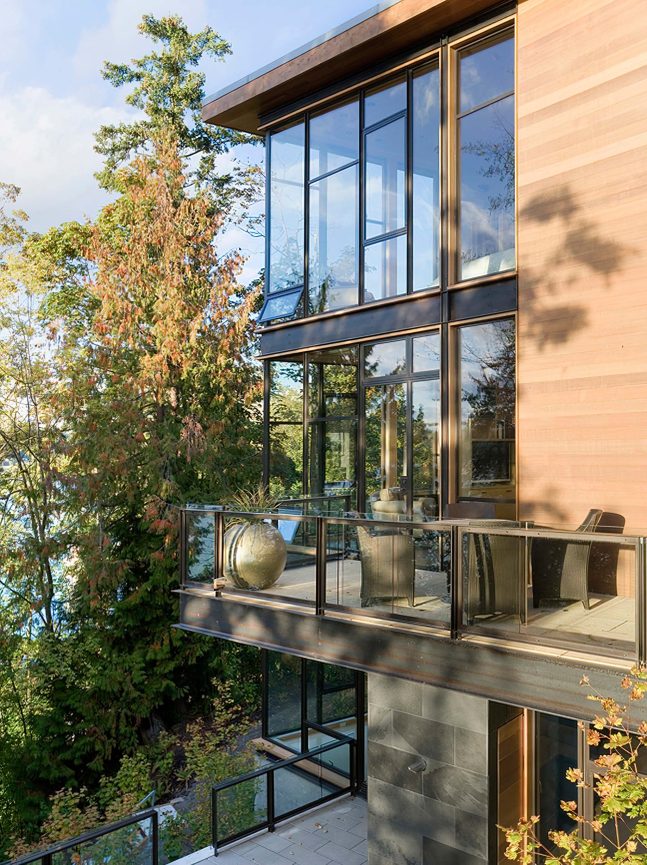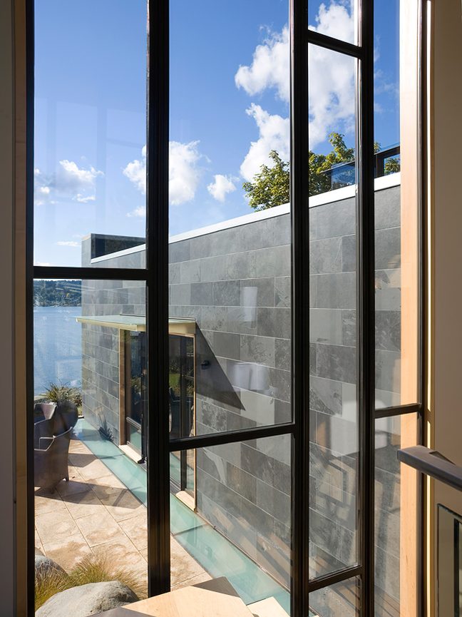 The Lake Washington house by Prentiss+Balance+Wickline Architects is a masterfully crafted contemporary residence in Kenmore, WA, where architectural prowess meets the challenges of an environmentally and code-restricted site. Set within a terrain featuring a formidable forty-foot grade change, this home ingeniously navigates the landscape with a design that harmoniously integrates into its surroundings. The building’s form boldly follows two axes: one gracefully aligns with the natural slope, grounding and embedding the structure into the earth, while the other dynamically extends across the grade, ascending toward the captivating waterfront.