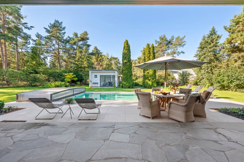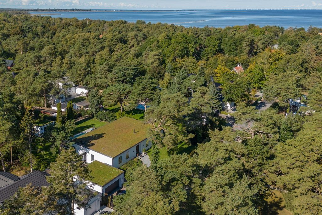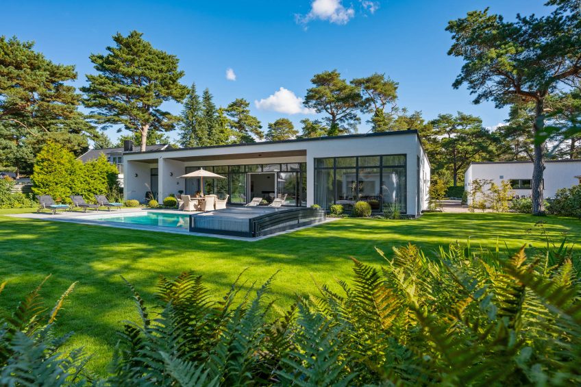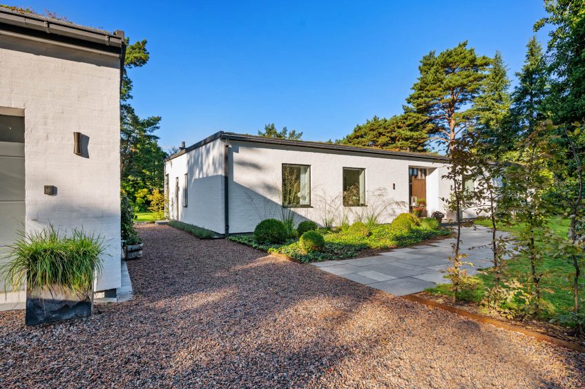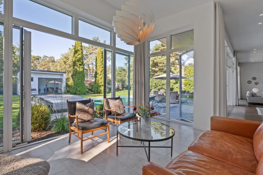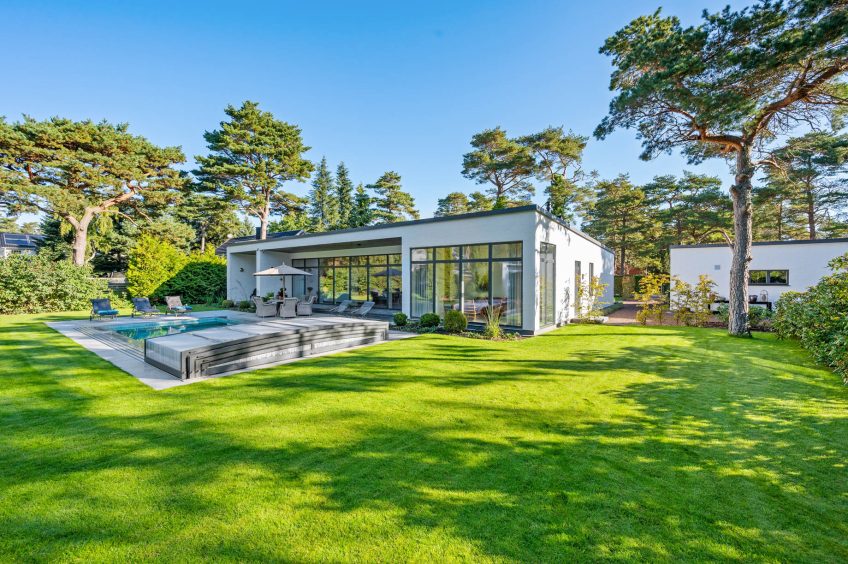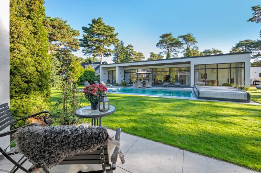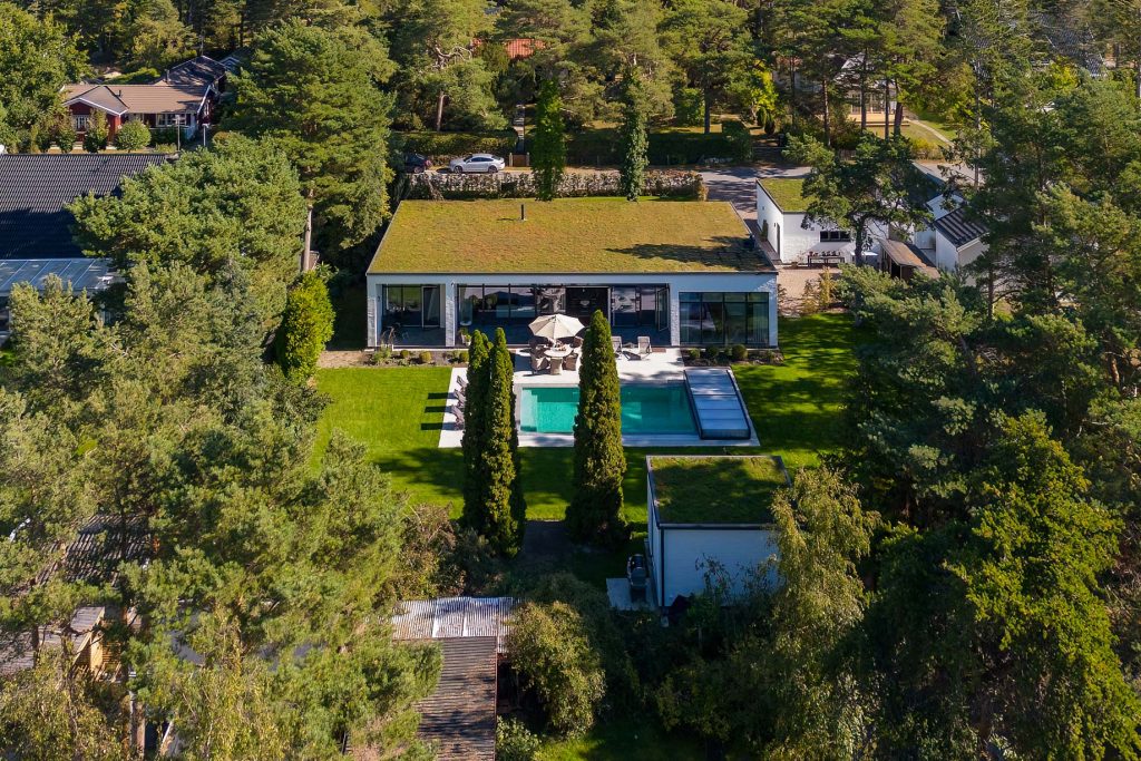 The outdoor environment is just as impressive as the interior of the home. The plot of 1,780 square meters is filled with beautiful vegetation, including rhododendrons, lilac trees, hornbeam hedges, and boxwood. The large slate/granite terrace and inviting pool area provide ample space for outdoor entertainment. The pool, which is covered in mosaic and measures 8×4 meters, is fully cast and comes with a pool house that includes a technical room, a toilet, and preparations for a kitchenette. This sensational contemporary dream home in Ljunghusen is truly exceptional and is sure to impress even the most discerning luxury aficionado.