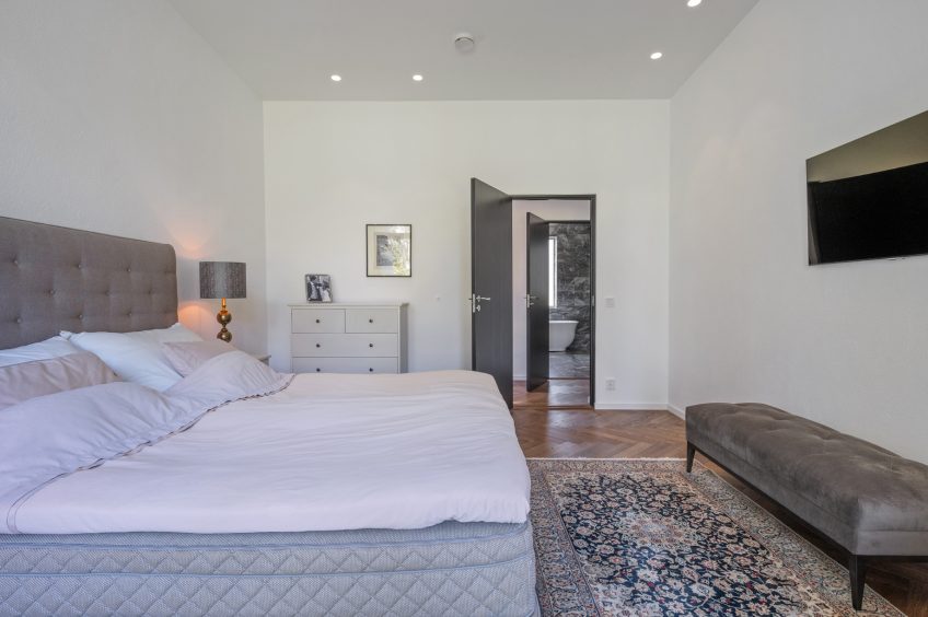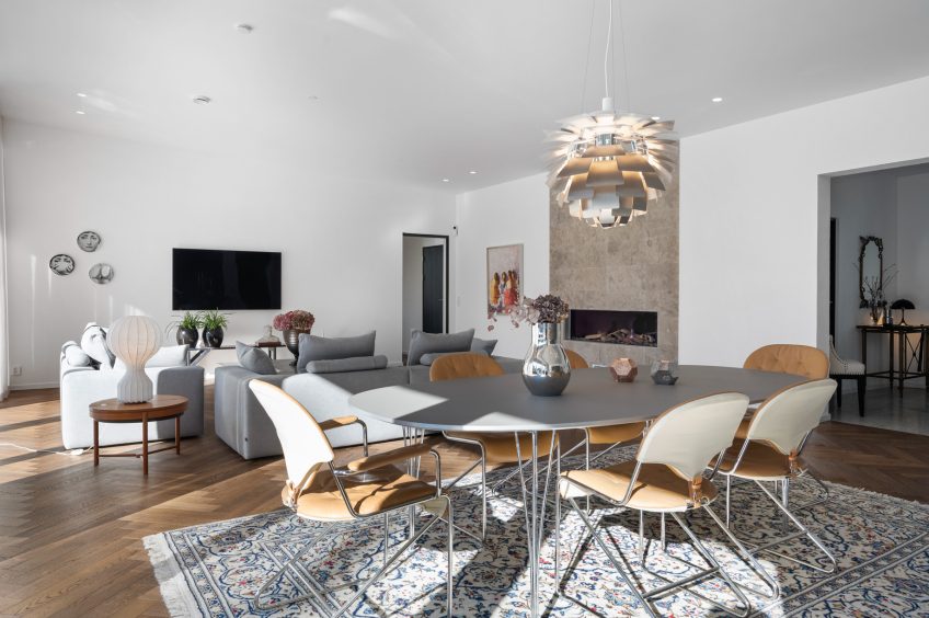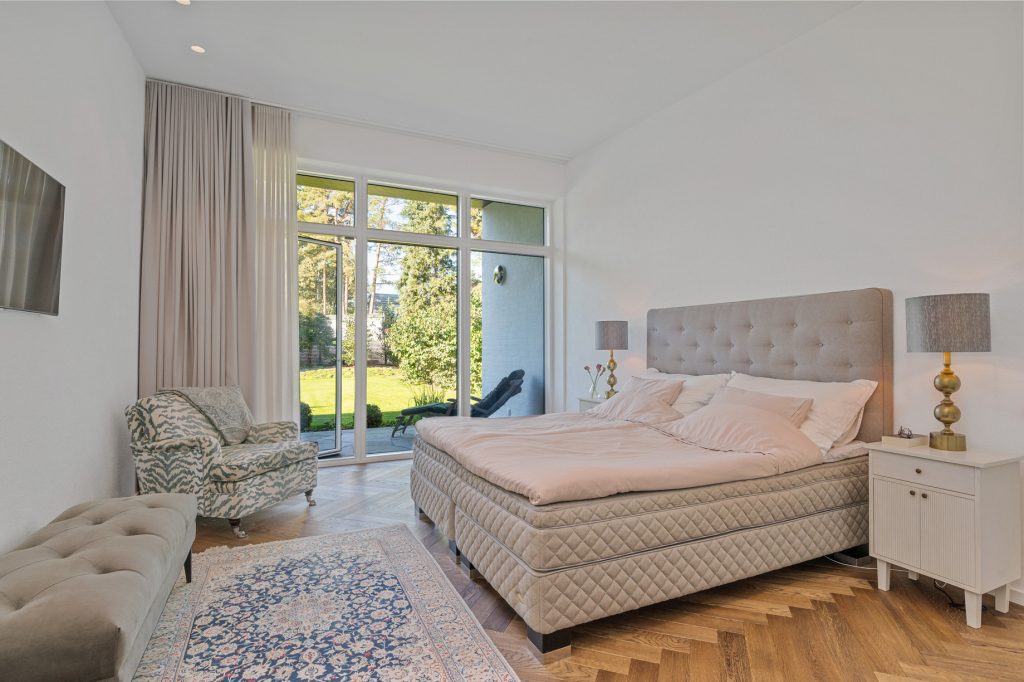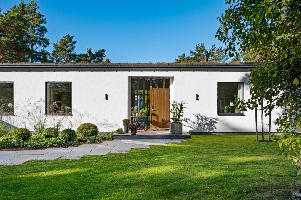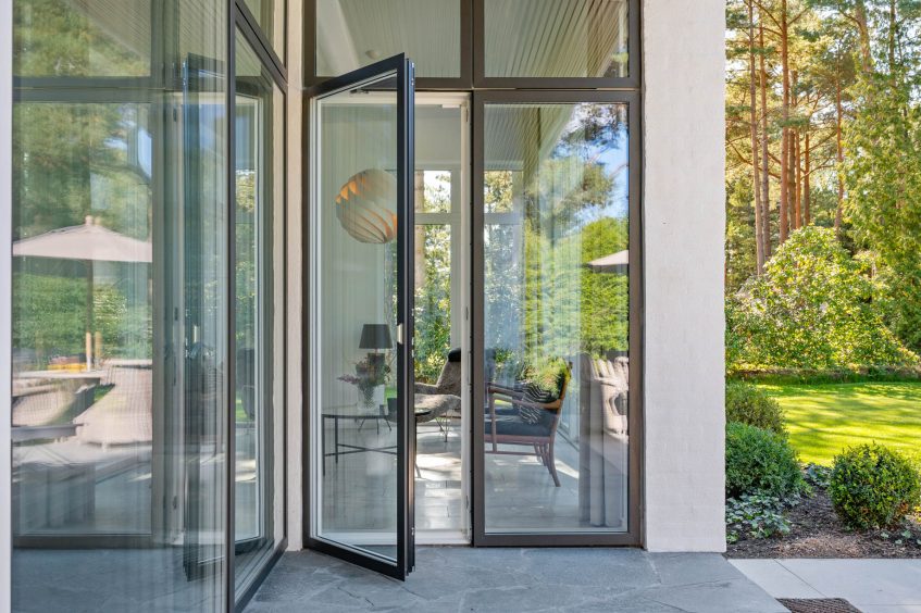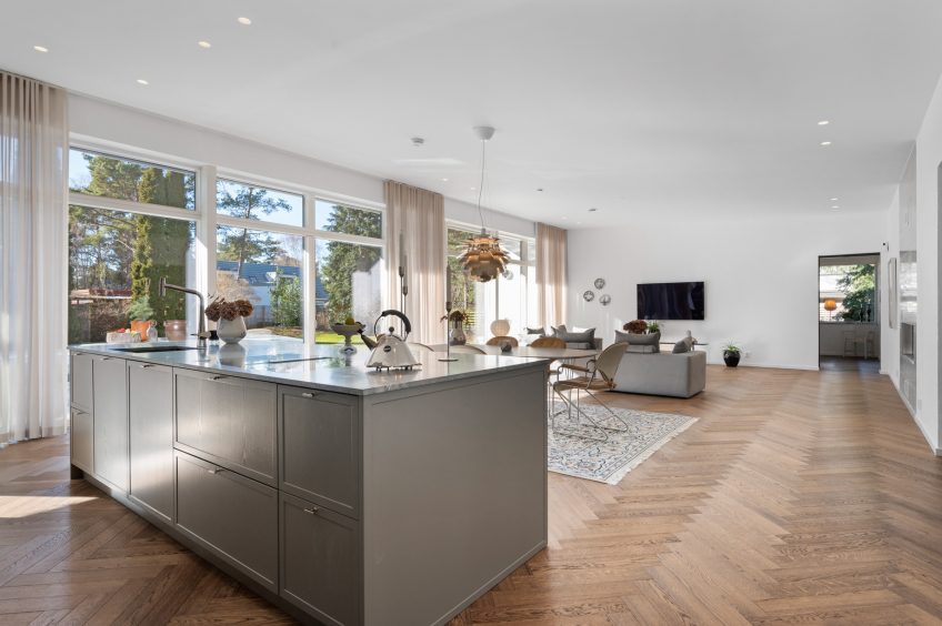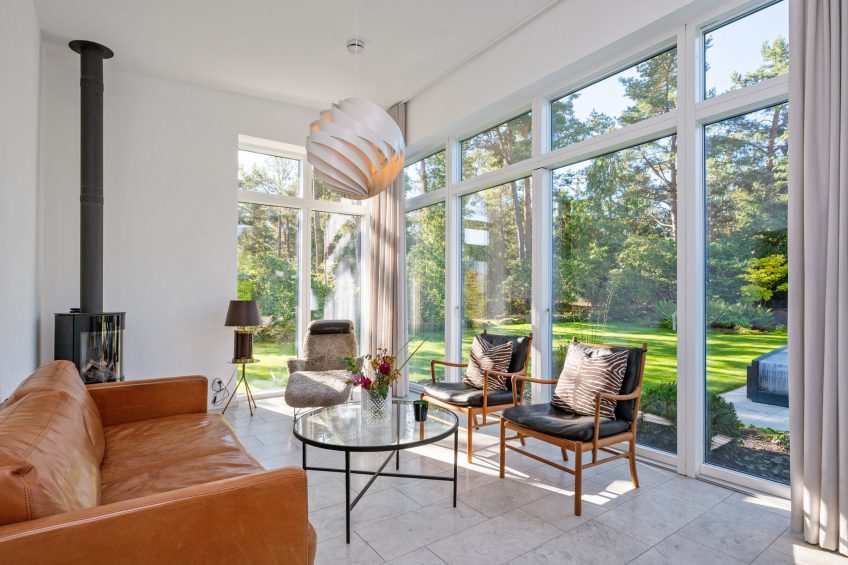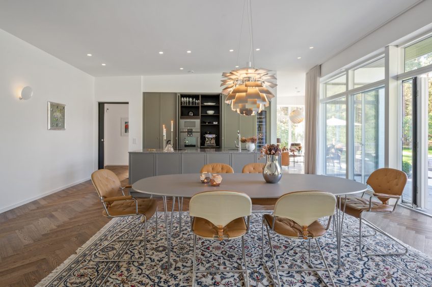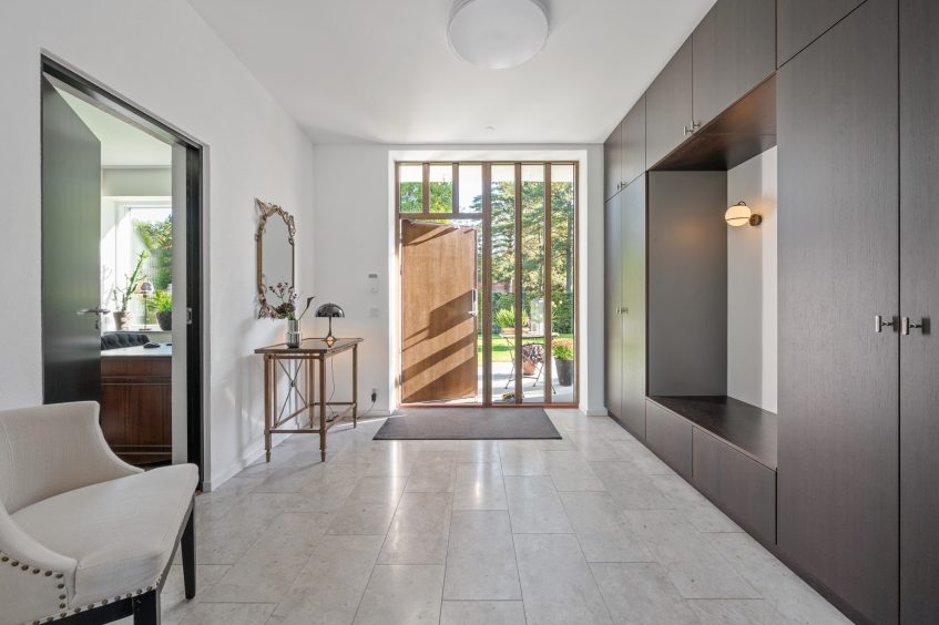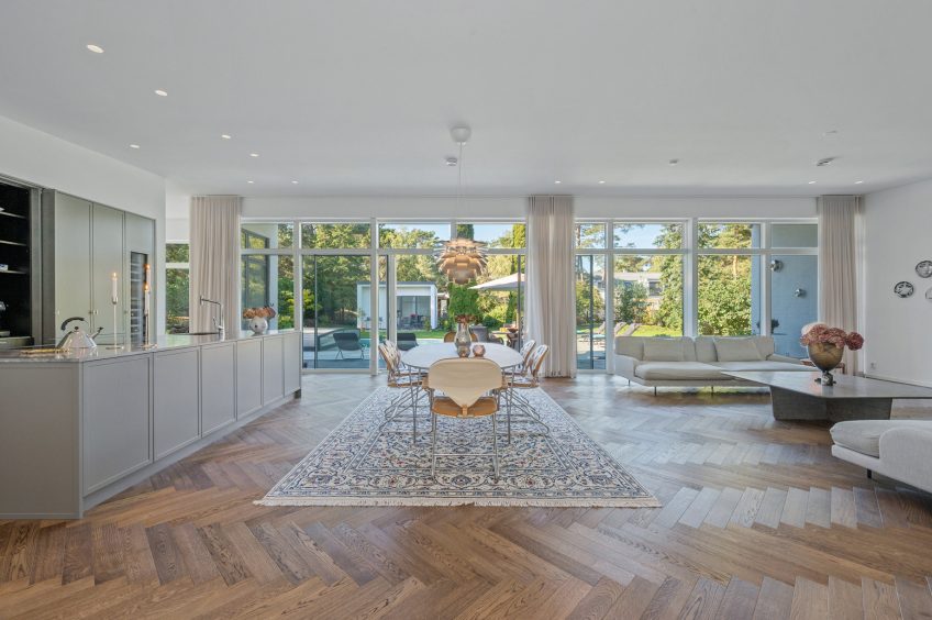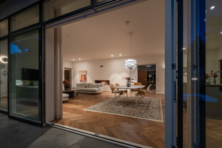 Upon entering the house through the specially ordered door from Bovallsdörren, guests are greeted by a grand entrance hall with built-in wardrobes and a seating area. The interior walls of the house are painted with Farrow & Ball Estate Emulsion, which gives a soft finish and a great depth of color. The living room, which is approximately 78 square meters, seamlessly integrates with the kitchen and boasts Velfac windows with lift/slide sliding doors that blur the line between inside and out. A gas stove from RAIS beautifully adorns the marble wall, adding a touch of elegance to the space.