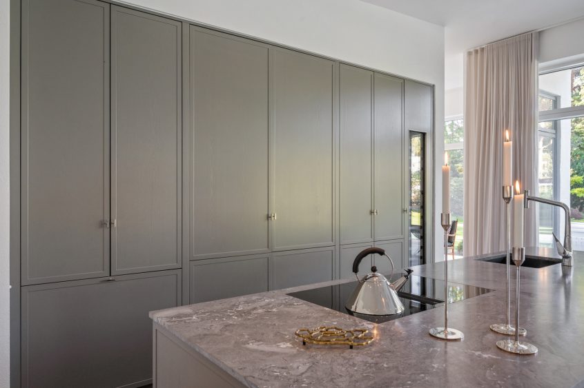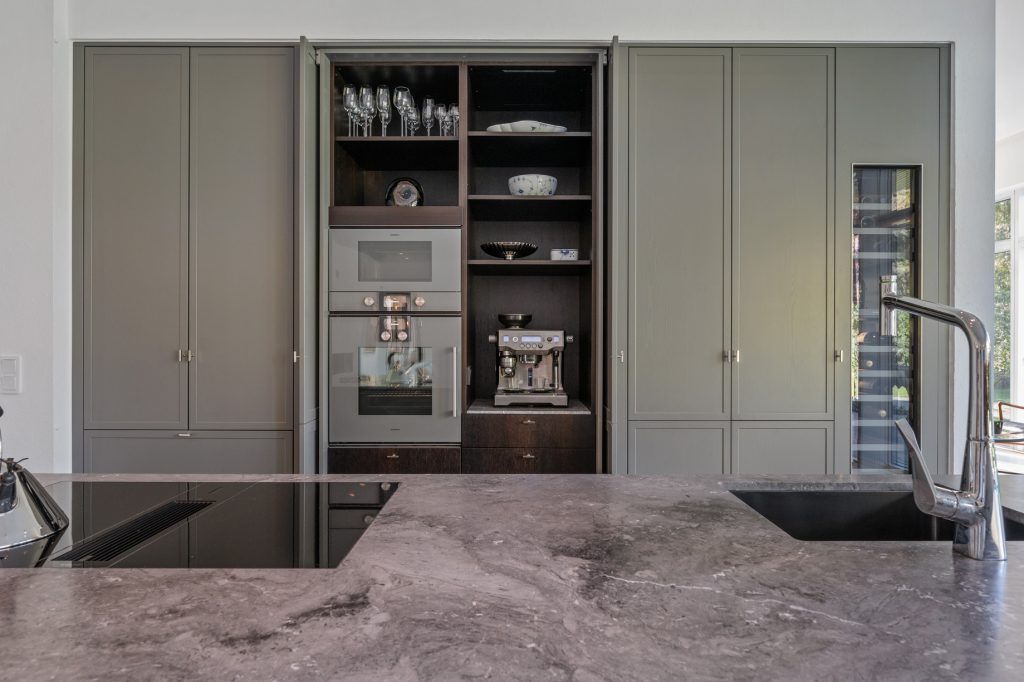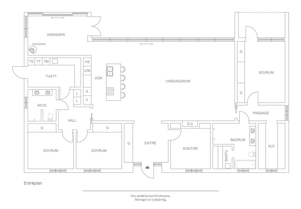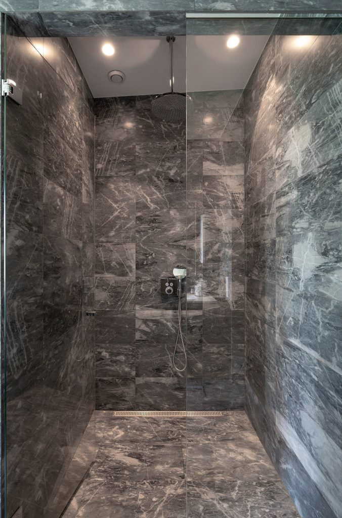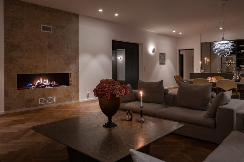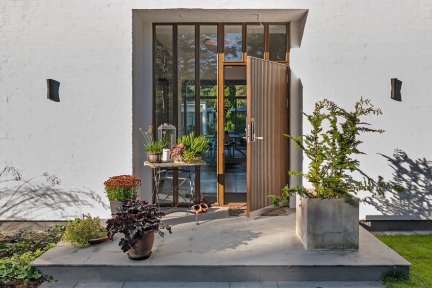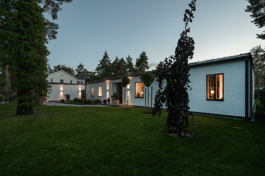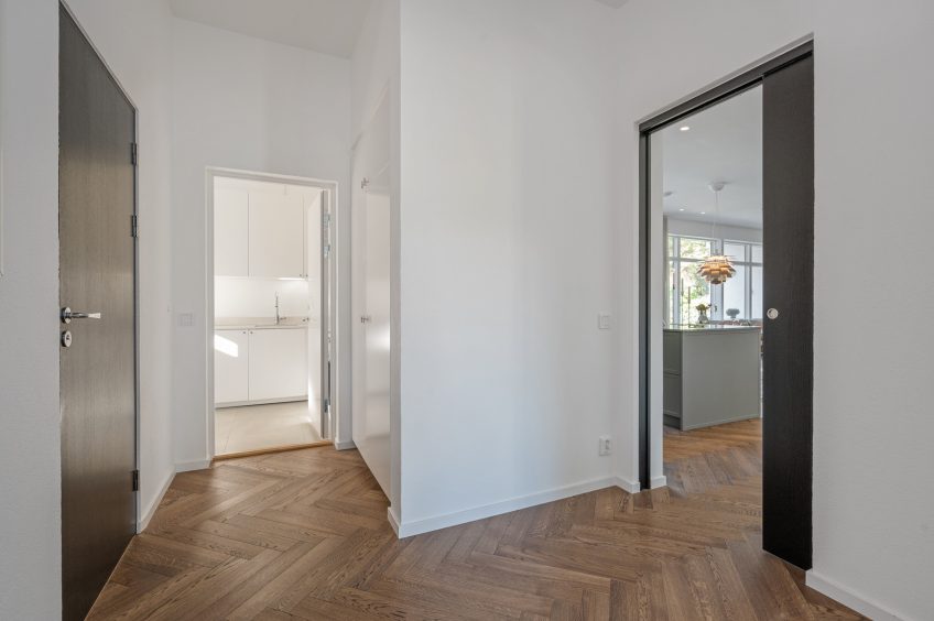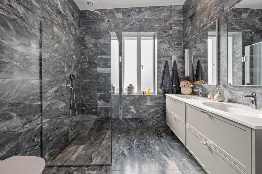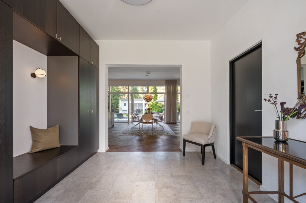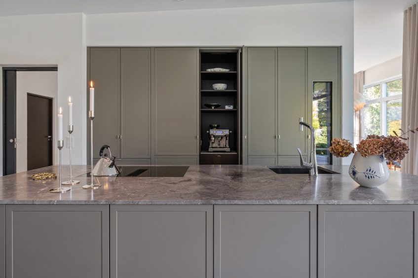 Upon entering the house through the specially ordered door from Bovallsdörren, guests are greeted by a grand entrance hall with built-in wardrobes and a seating area. The interior walls of the house are painted with Farrow & Ball Estate Emulsion, which gives a soft finish and a great depth of color. The living room, which is approximately 78 square meters, seamlessly integrates with the kitchen and boasts Velfac windows with lift/slide sliding doors that blur the line between inside and out. A gas stove from RAIS beautifully adorns the marble wall, adding a touch of elegance to the space.